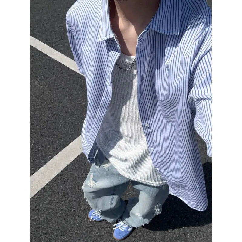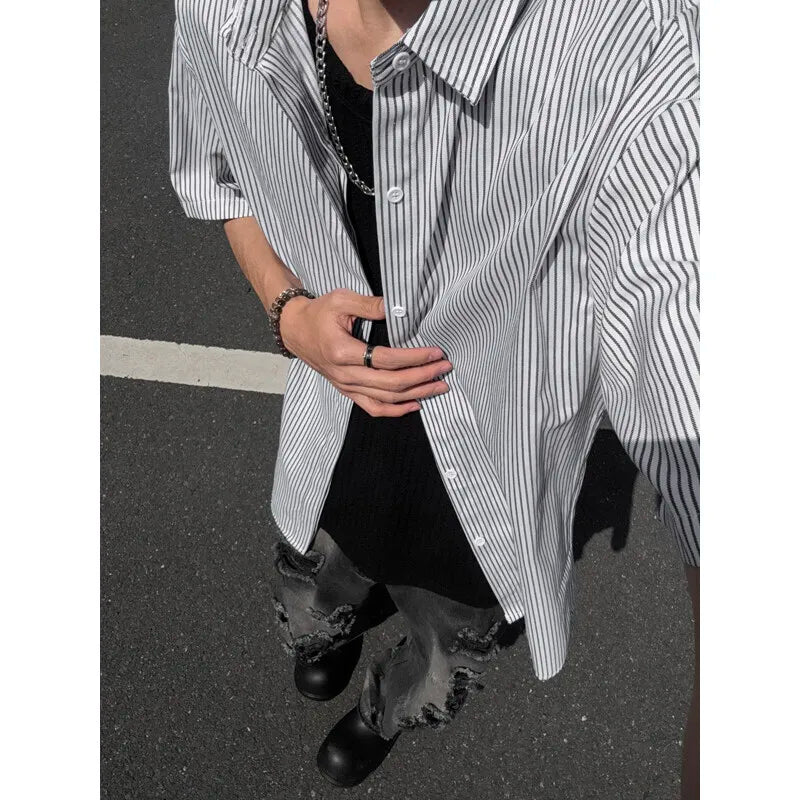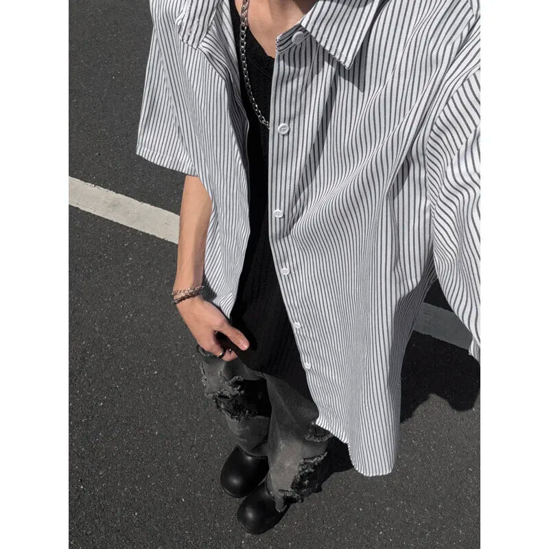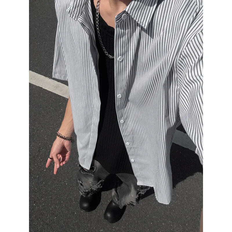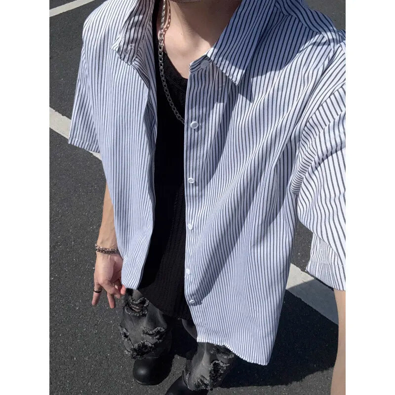 Summer Short Sleeved Shirt Men Black Blue Casual Shirt Men Streetwear Korean Loose Striped Shirt Mens Formal Dress Shirts