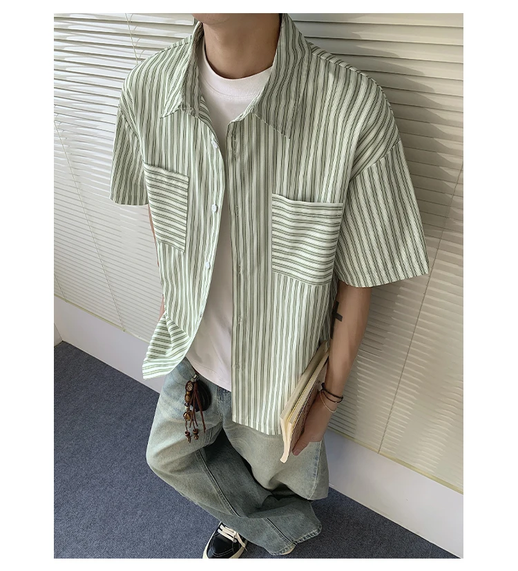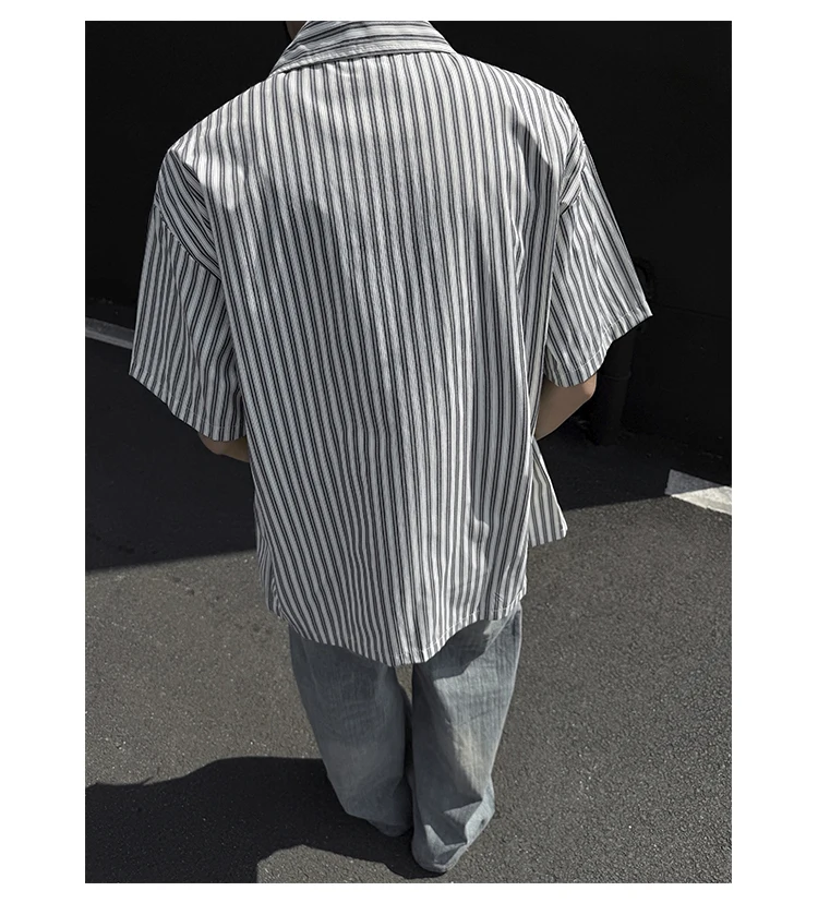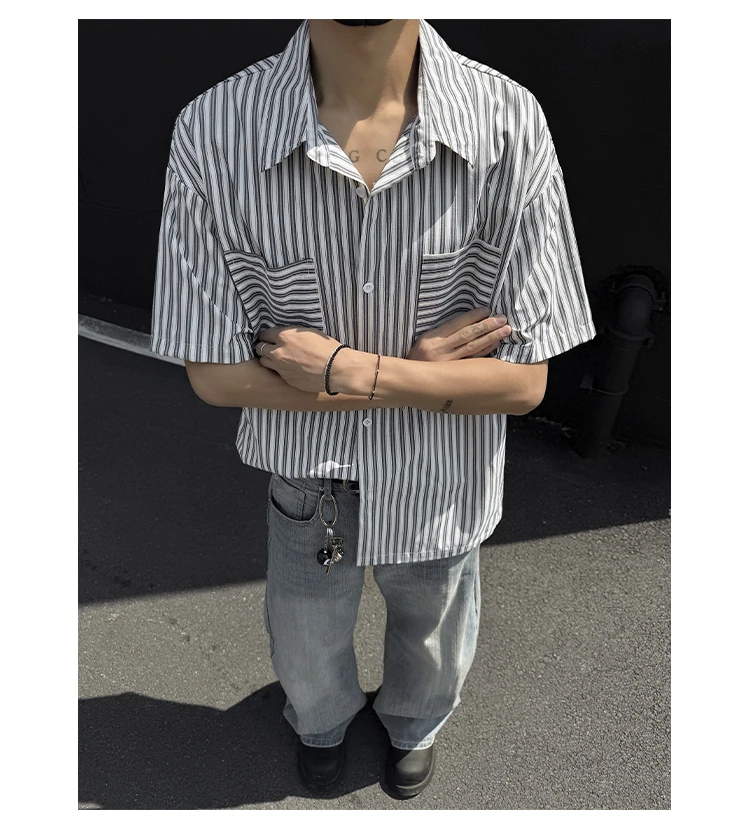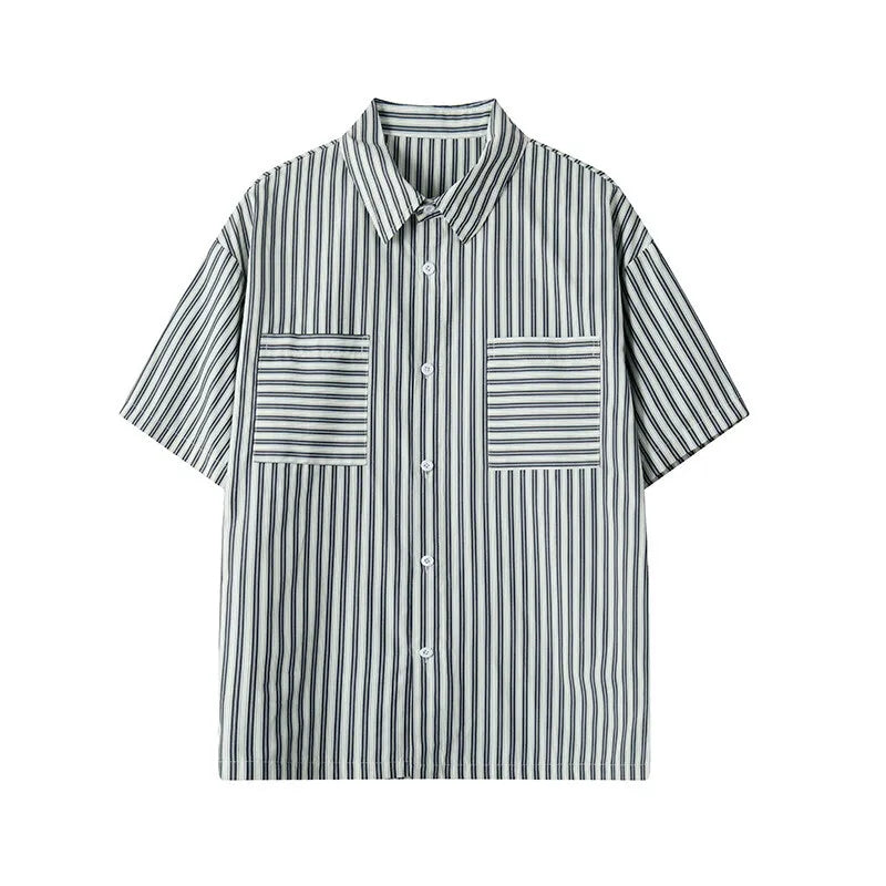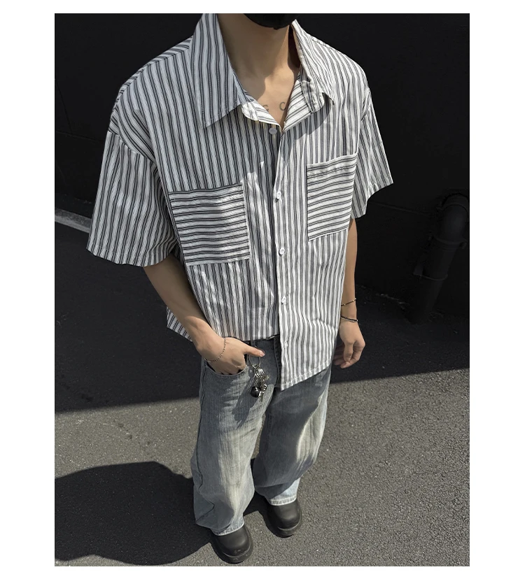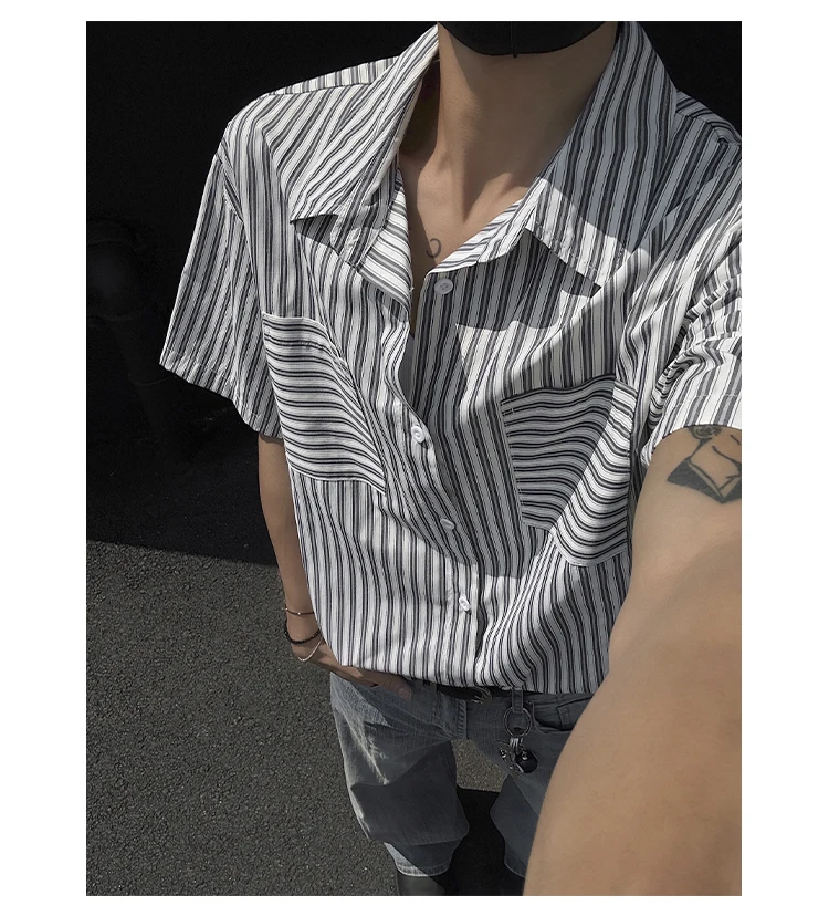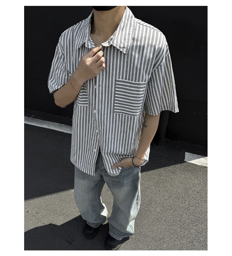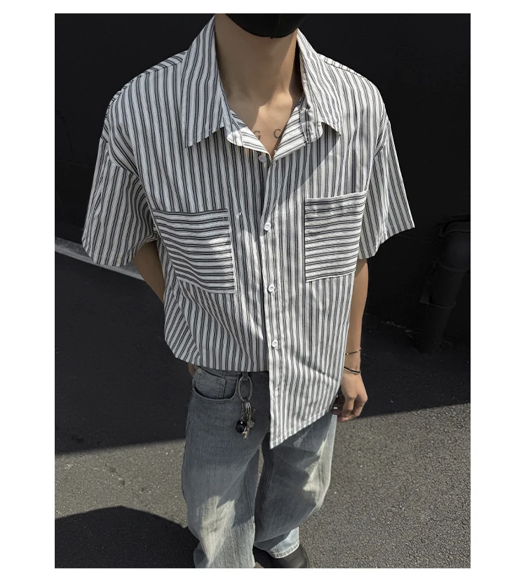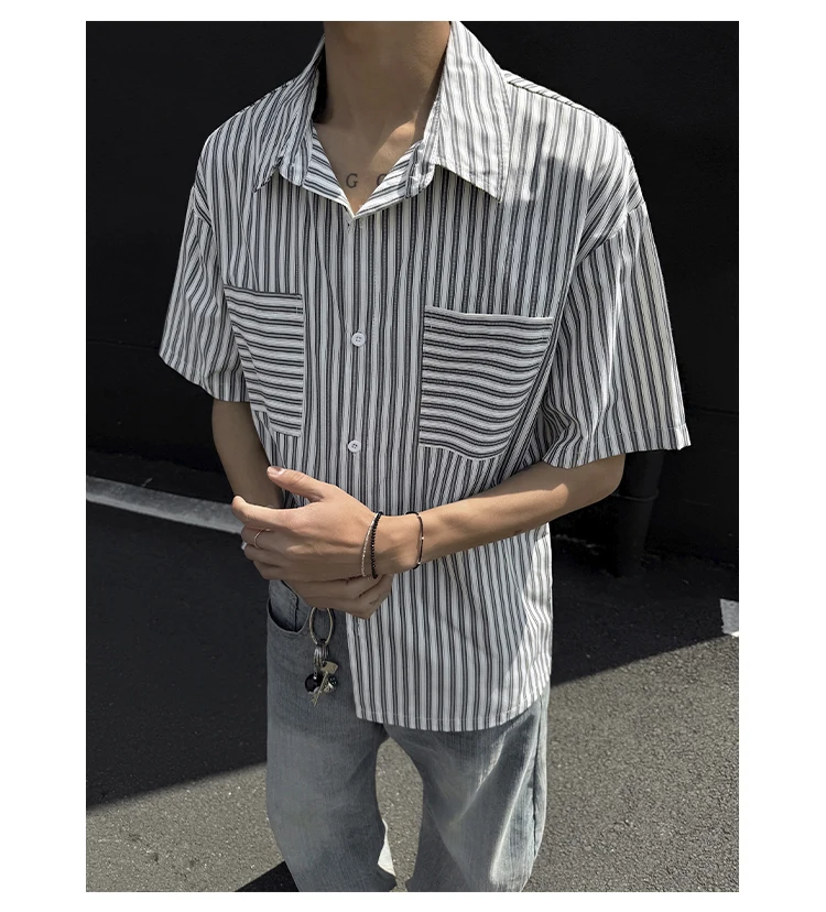 Summer Short Sleeved Shirt Men Fashion Pocket Casual Shirt Men Streetwear Korean Loose Black Striped Shirt Mens Plus Size 5XL