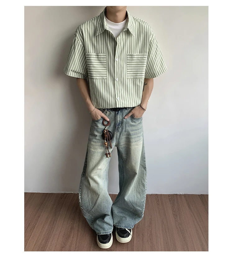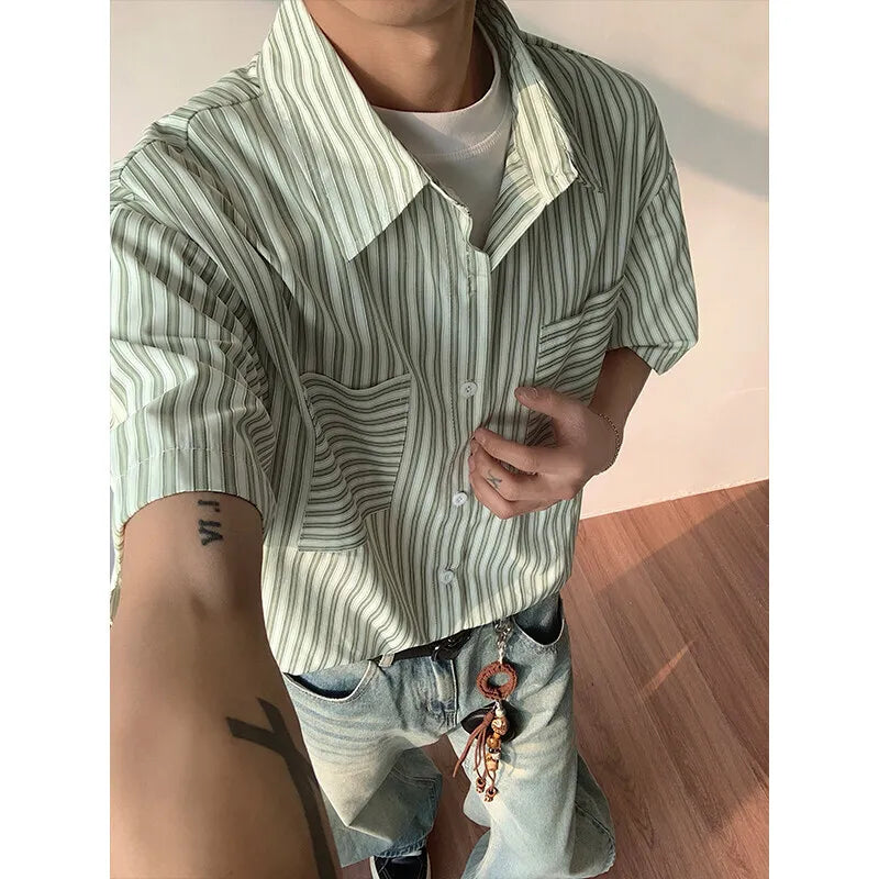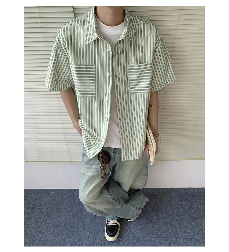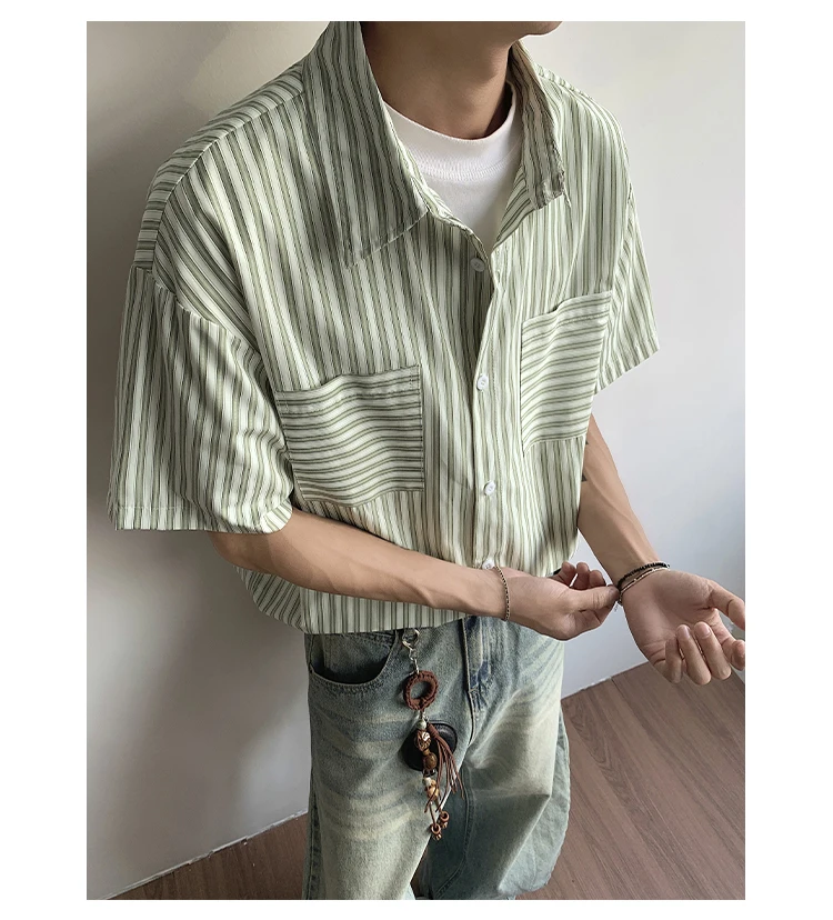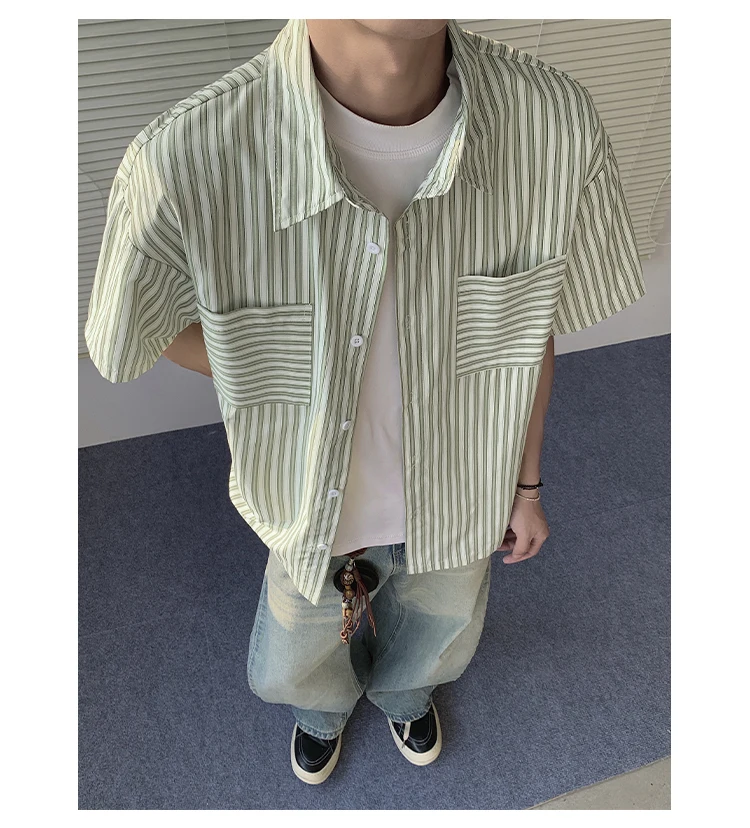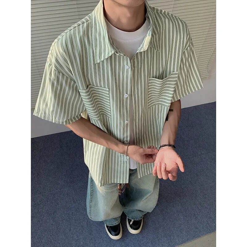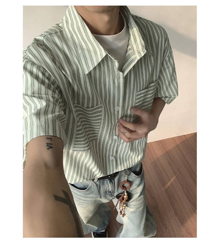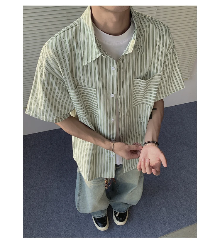 Summer Short Sleeved Shirt Men Fashion Pocket Casual Shirt Men Streetwear Korean Loose Black Striped Shirt Mens Plus Size 5XL