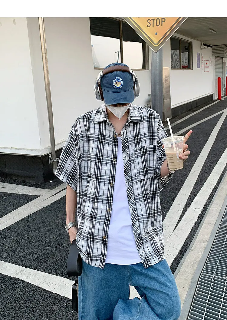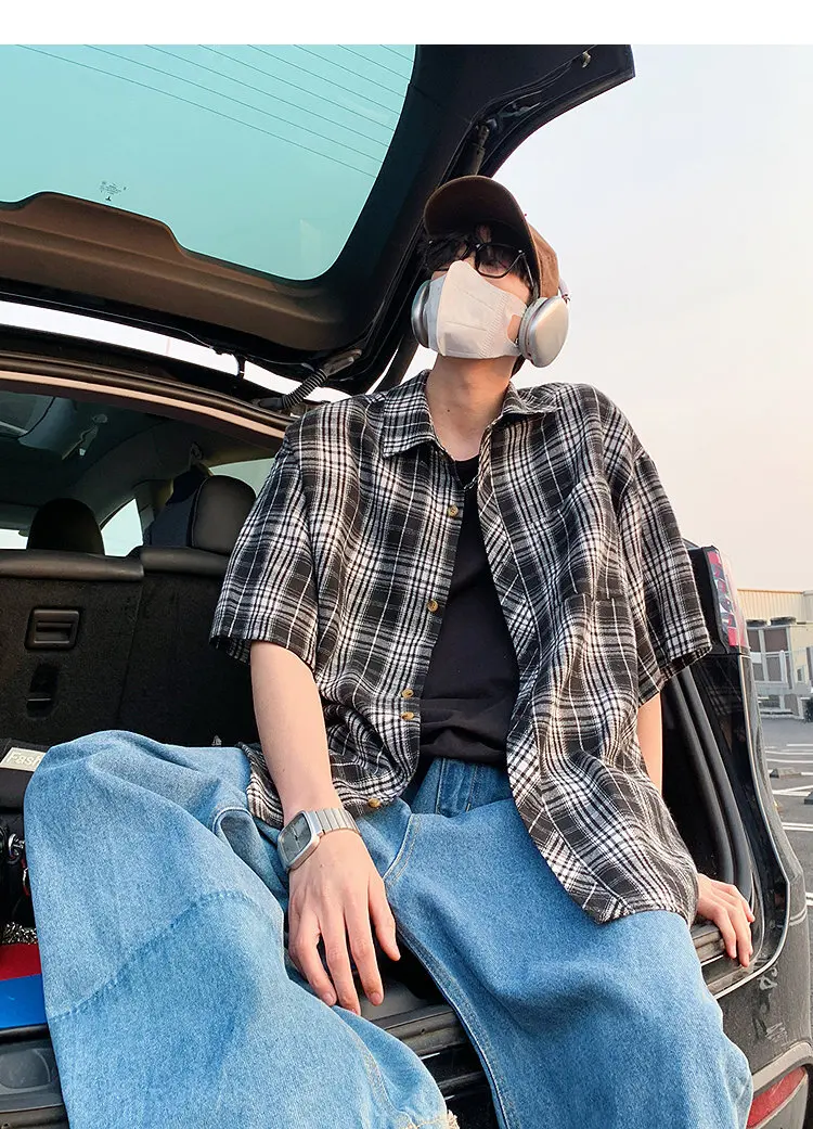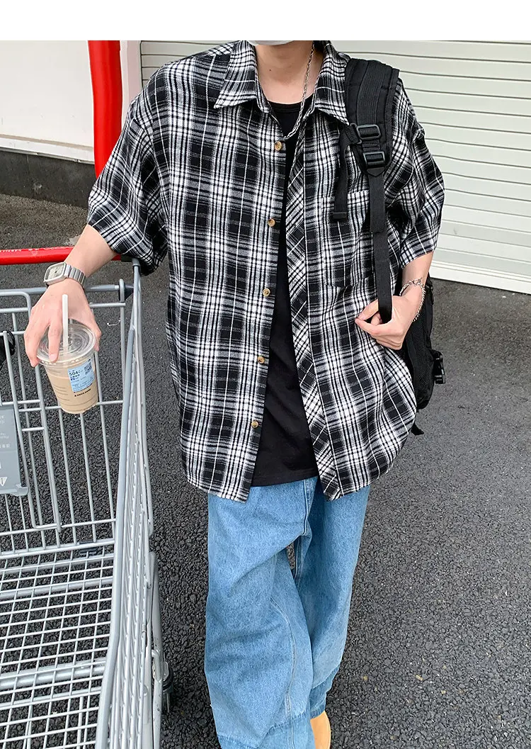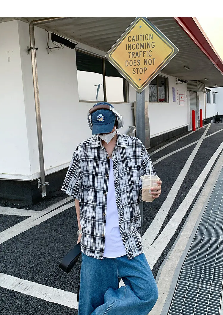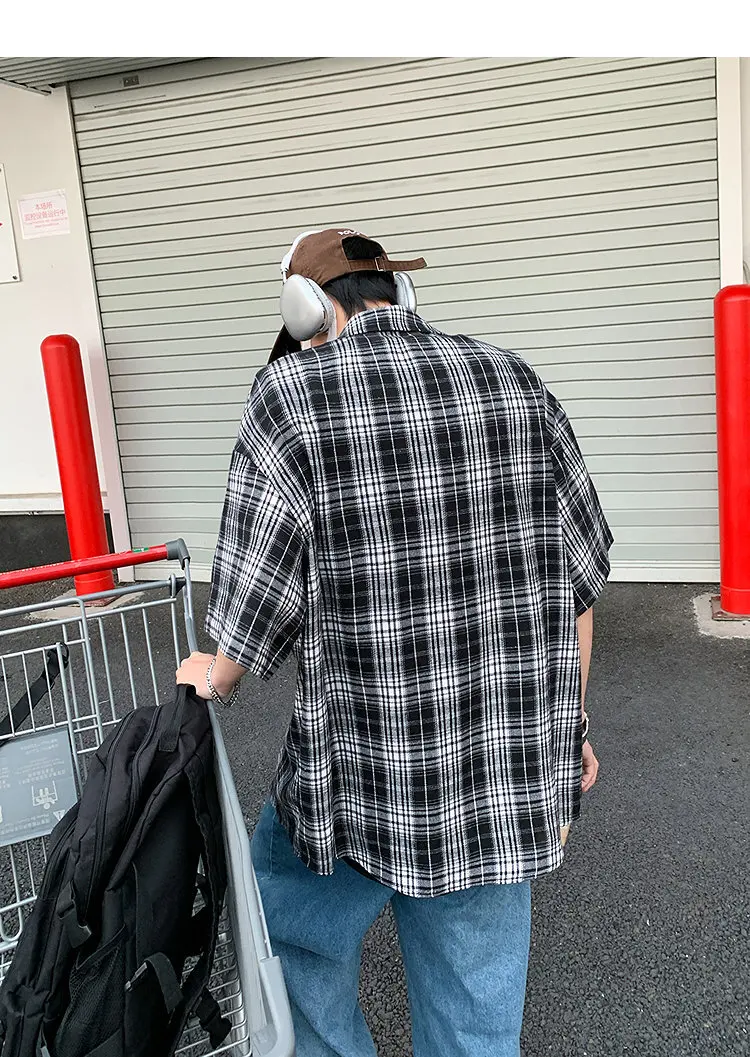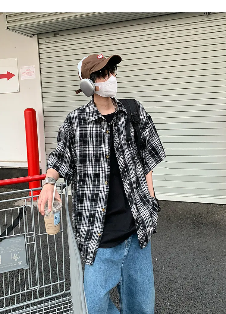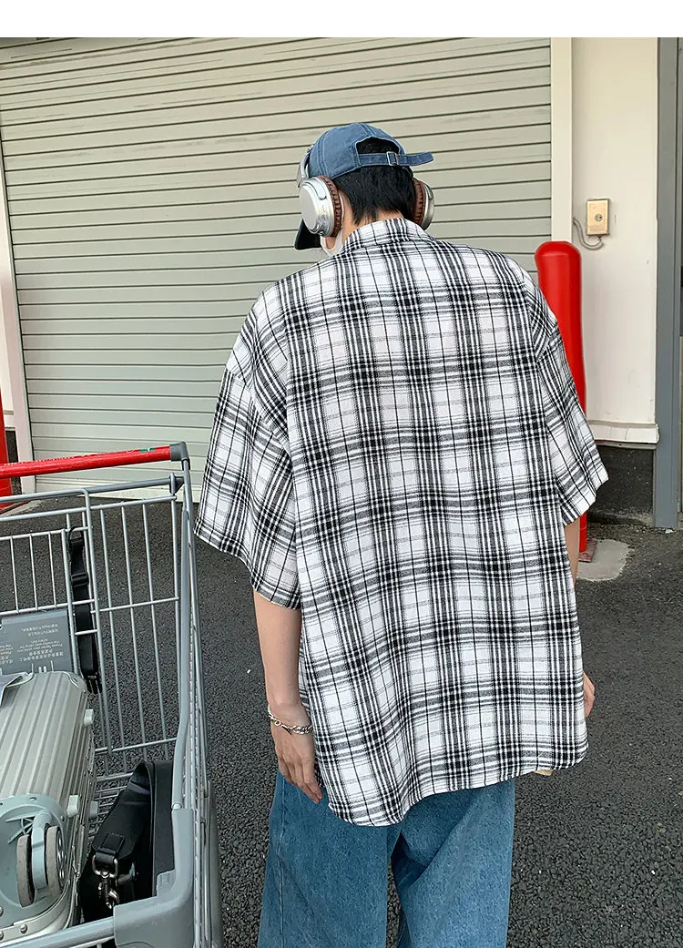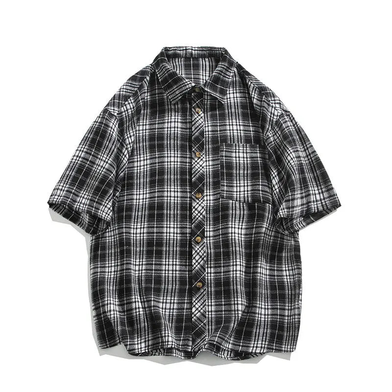 Summer Short Sleeved Shirt Men Fashion Retro Plaid Shirt Mens Streetwear Loose Black White Casual Shirt Man Large Size 4XL