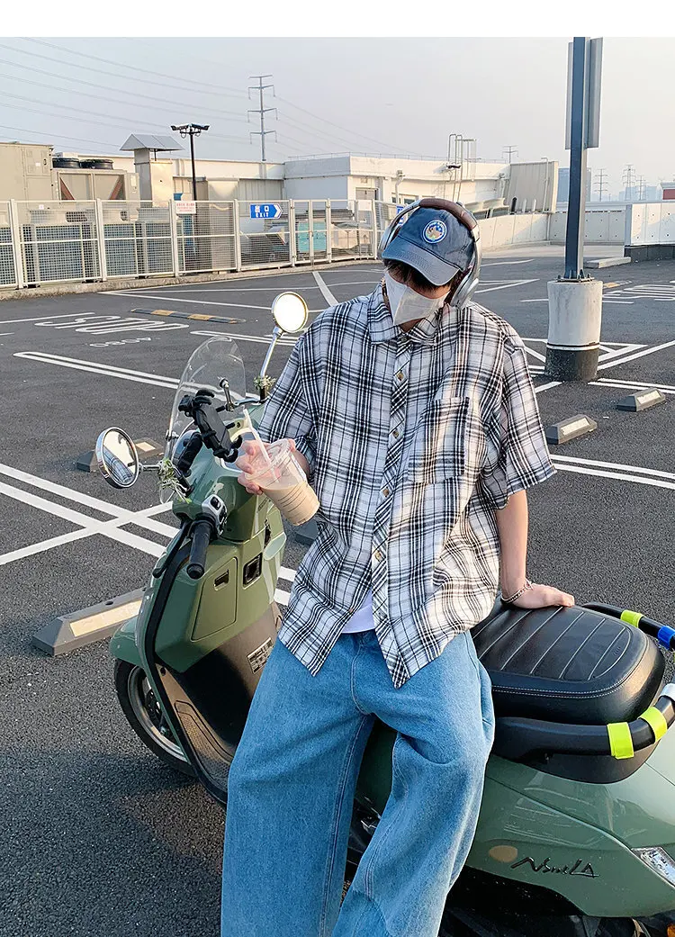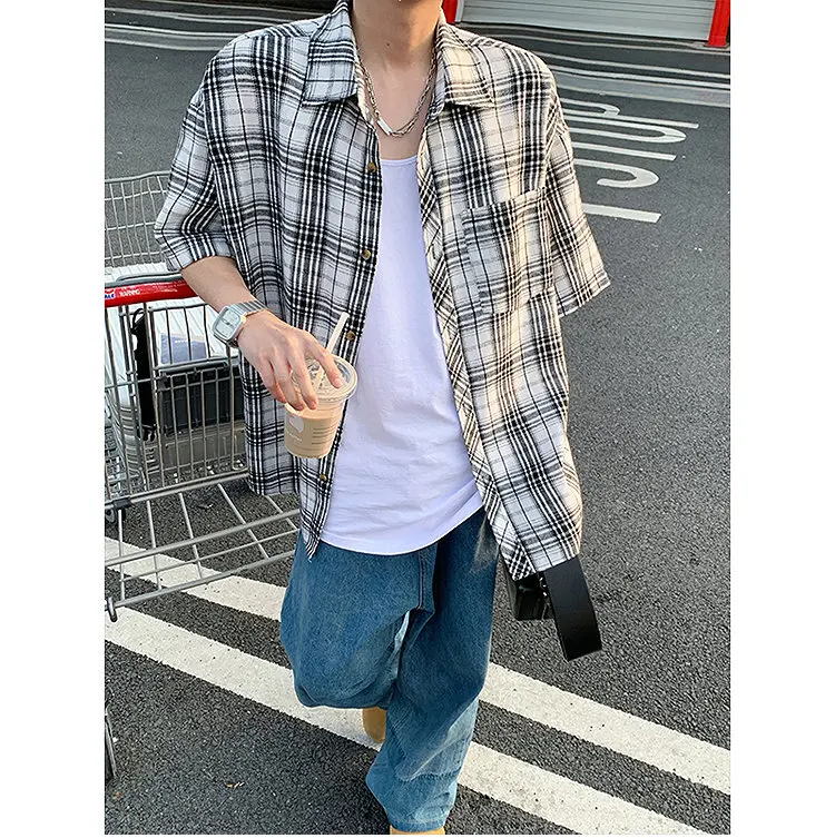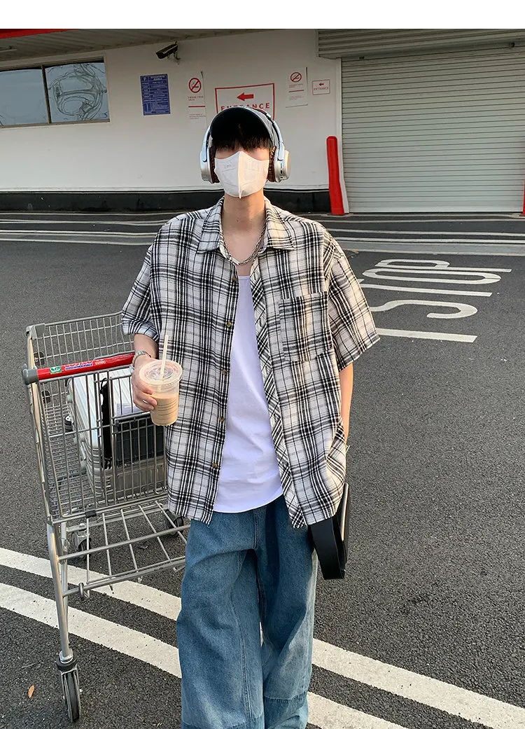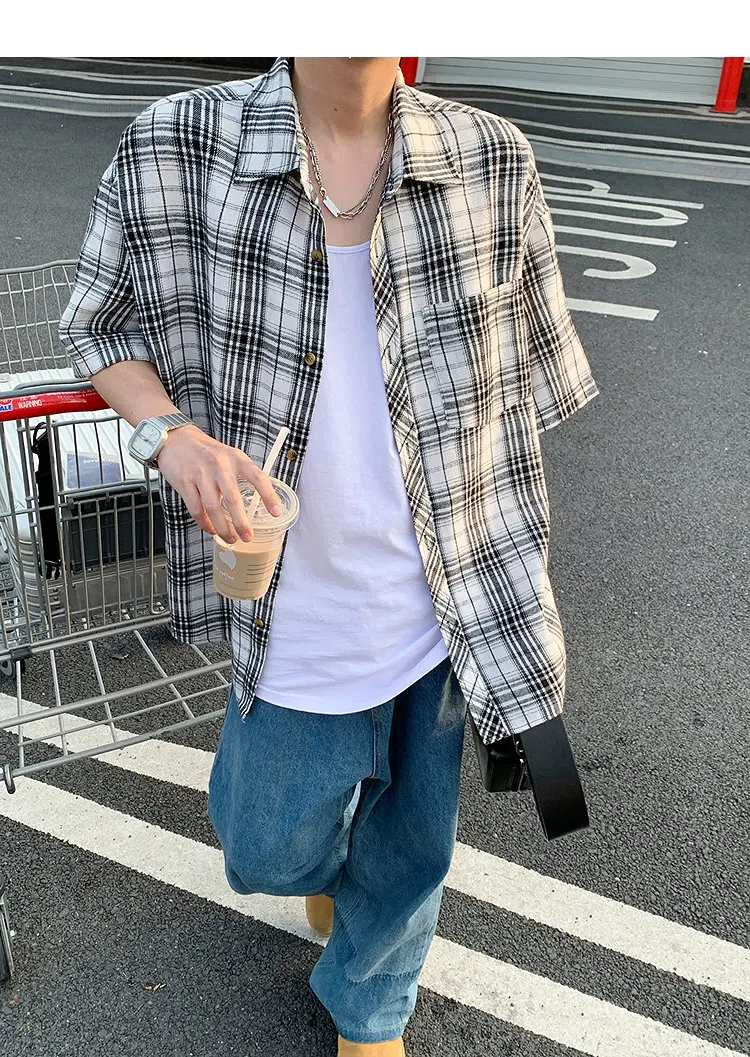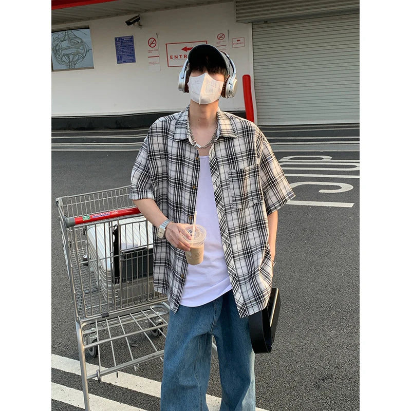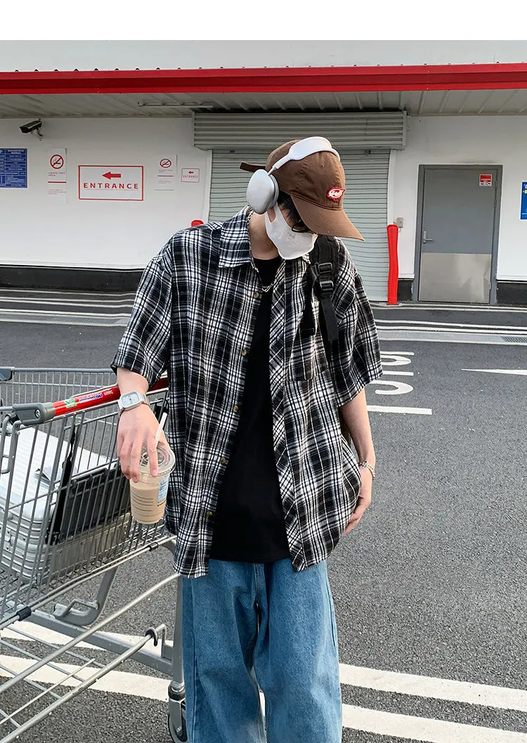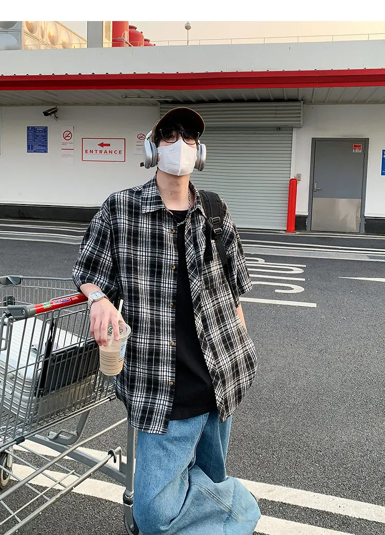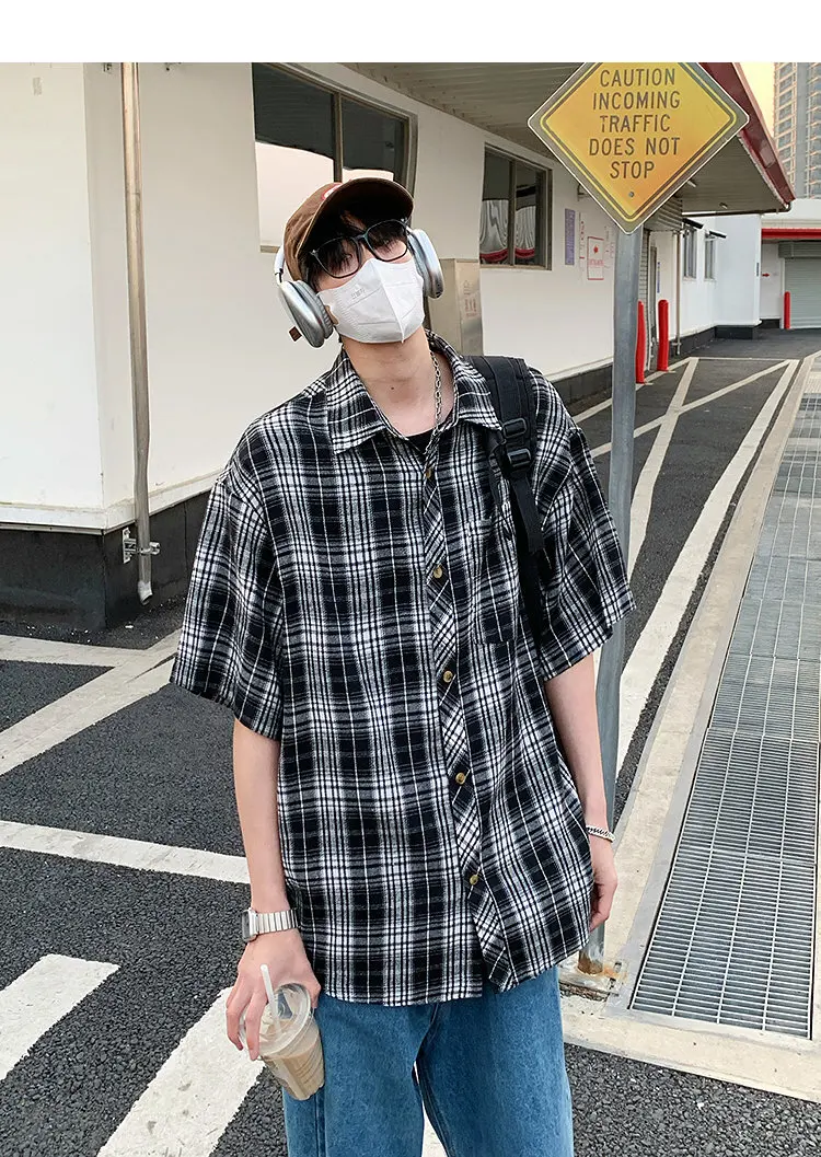 Summer Short Sleeved Shirt Men Fashion Retro Plaid Shirt Mens Streetwear Loose Black White Casual Shirt Man Large Size 4XL
