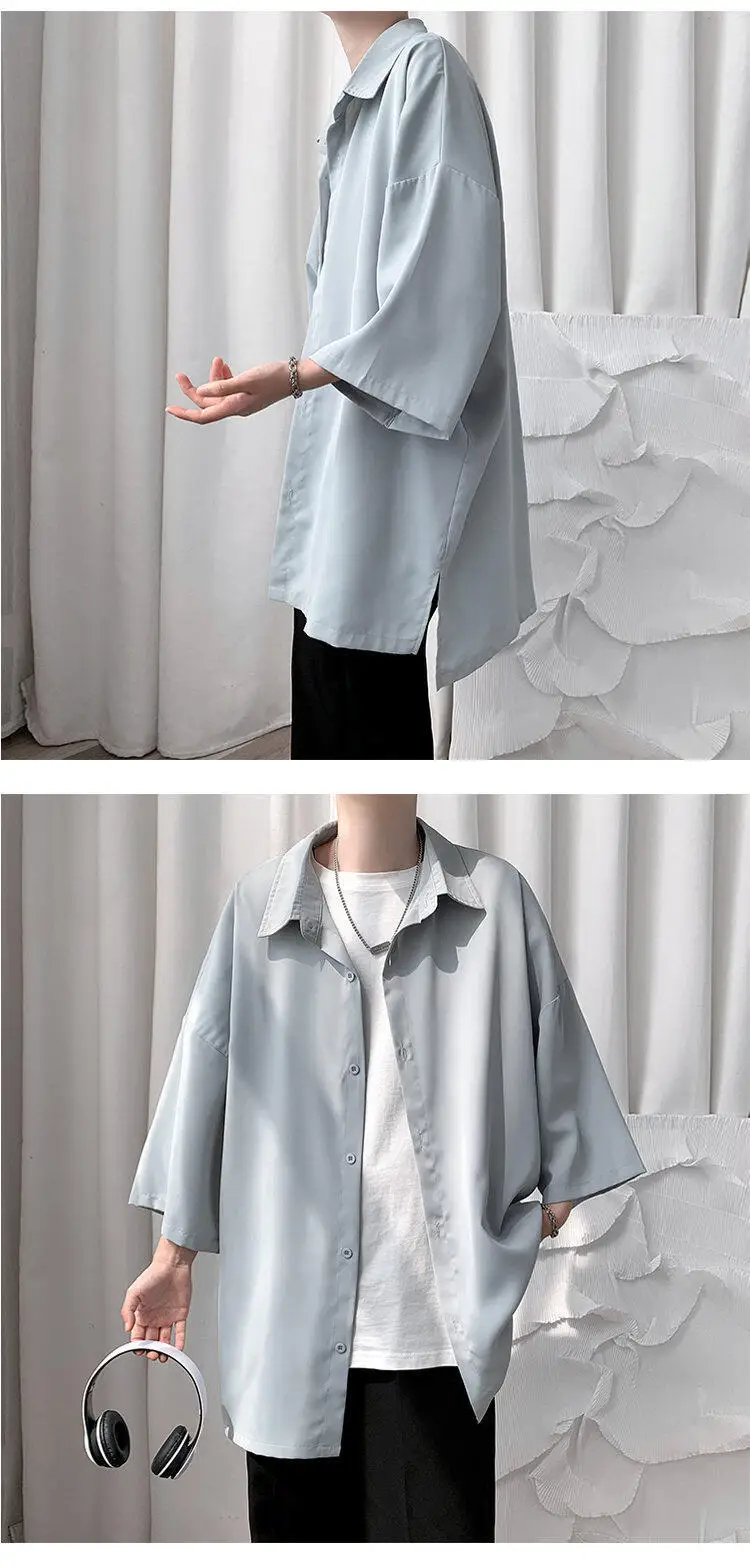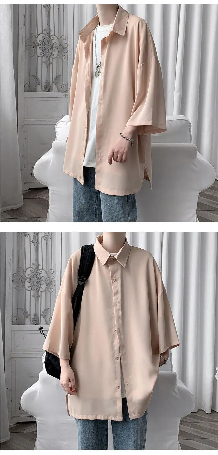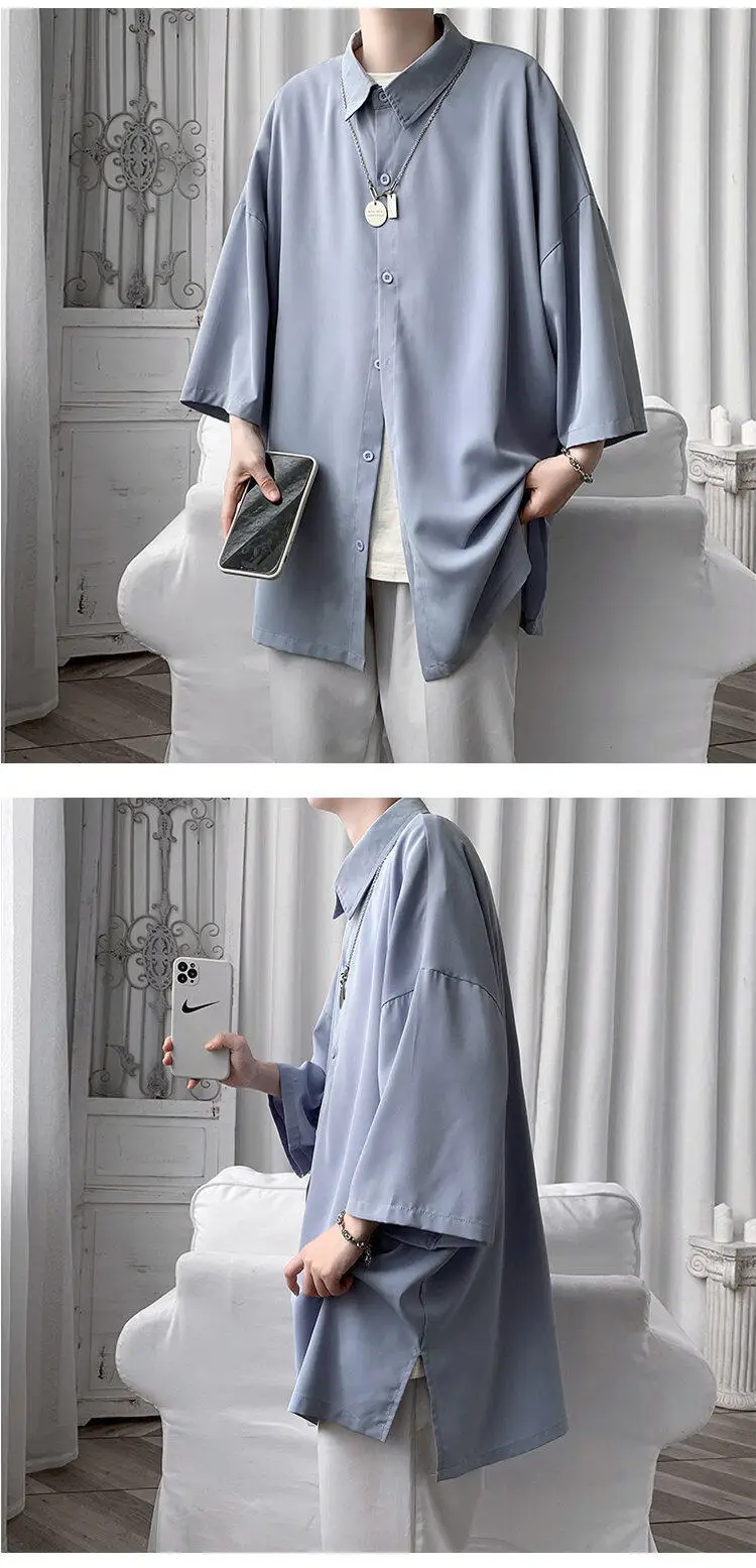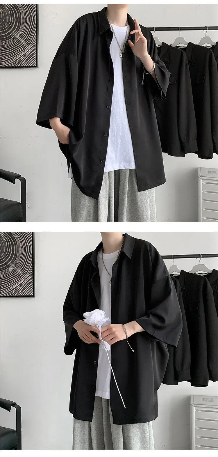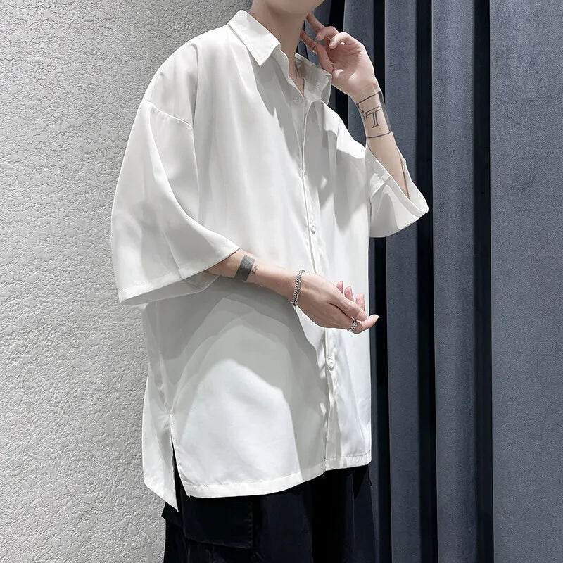 Summer Short Sleeved Shirt Men Fashion Society Mens Black Dress Shirt Korean Loose Ice Silk Shirts Mens Oversized White Shirt