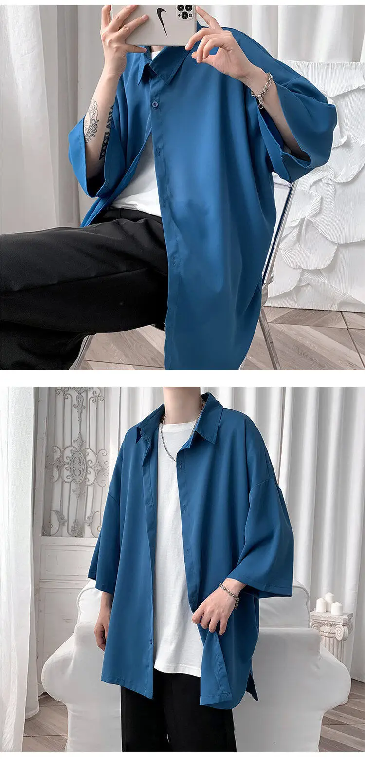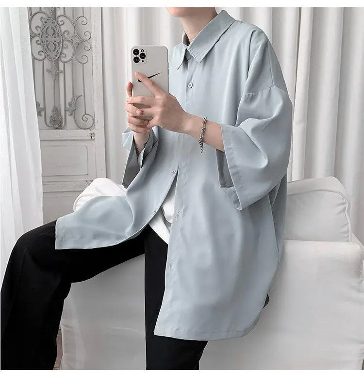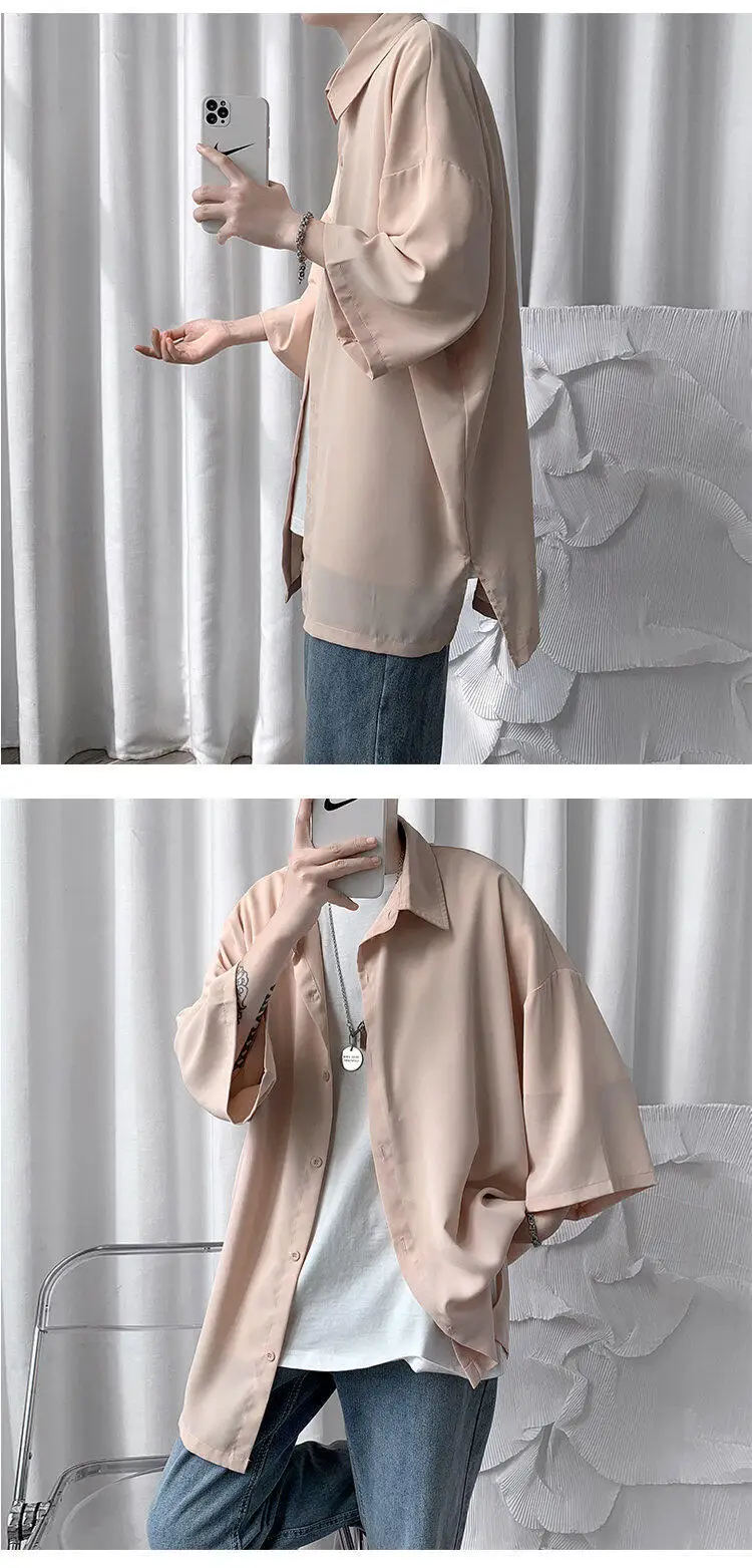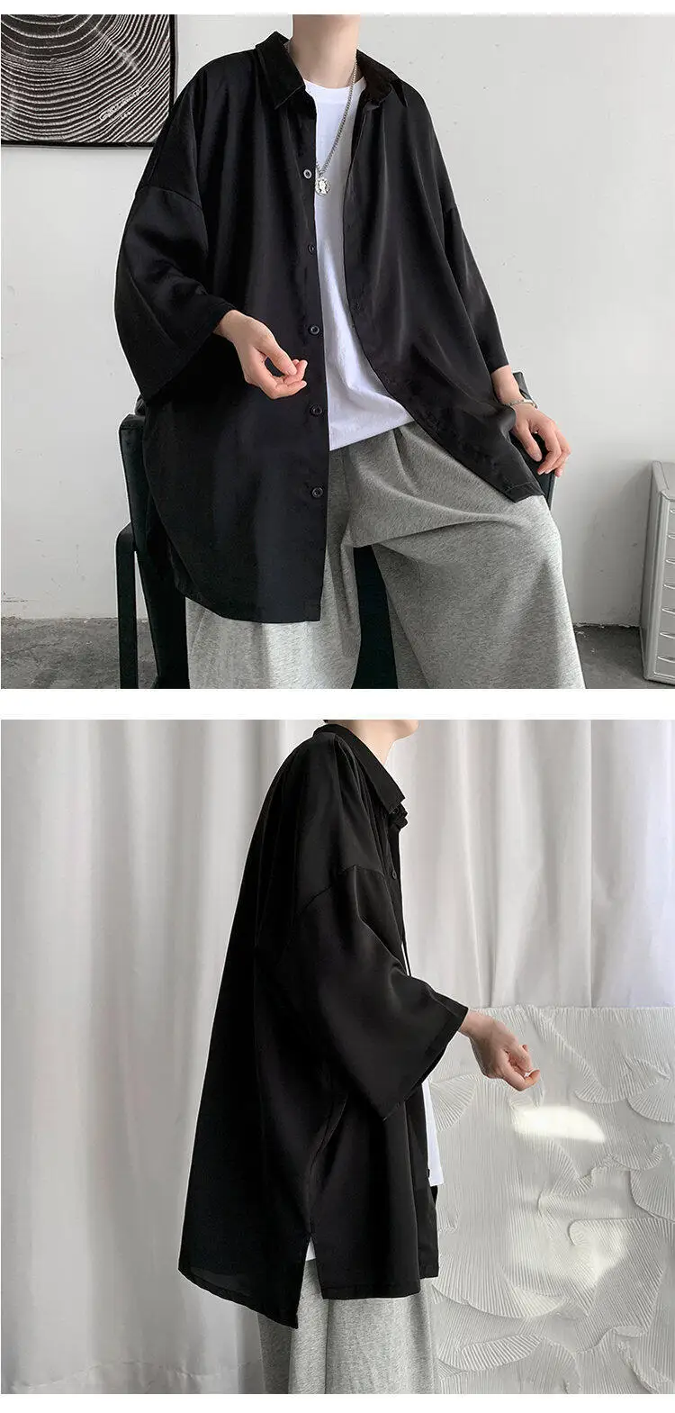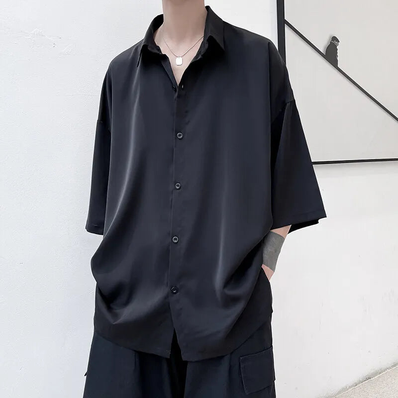 Summer Short Sleeved Shirt Men Fashion Society Mens Black Dress Shirt Korean Loose Ice Silk Shirts Mens Oversized White Shirt