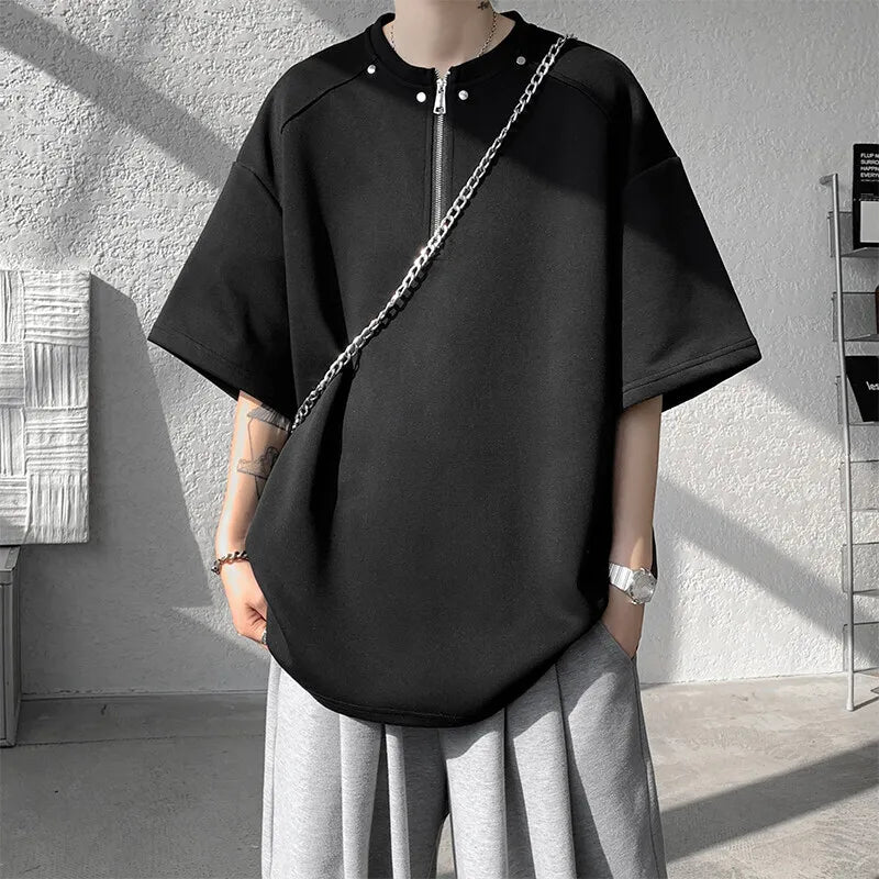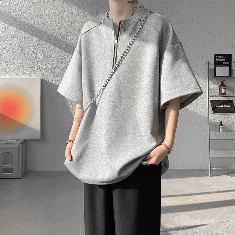 Summer Short Sleeved T-shirt Men Oversized Gray Black Casual T Shirt Men Streetwear Hip-hop Loose Zipper T Shirt Mens Top M-3XL