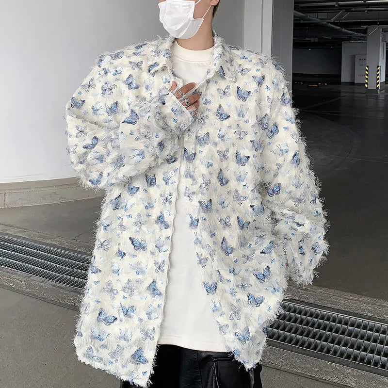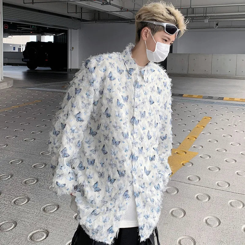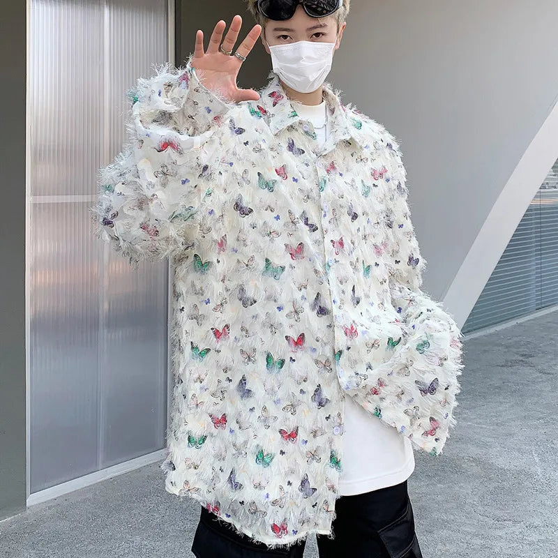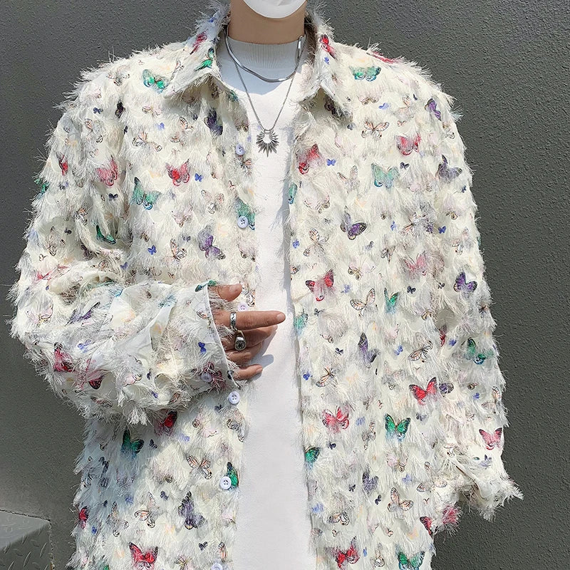 Summer Thin Shirt Three-dimensional Butterfly Decor Long Sleeve Shirt Tassel Casual Fashion Loose Male Sun-proof Clothing