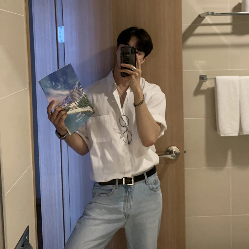 Summer Thin Shirts Mens Solid Color Short Sleeve Loose Handsome Fashion Casual Streetwear All-match Men's Clothing Green/White