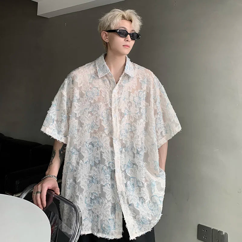 Transparent Floral Handsome Shirts Summer Thin Fashion Casual Streetwear Loose Shirt Breathable Short Sleeve Men's Clothing