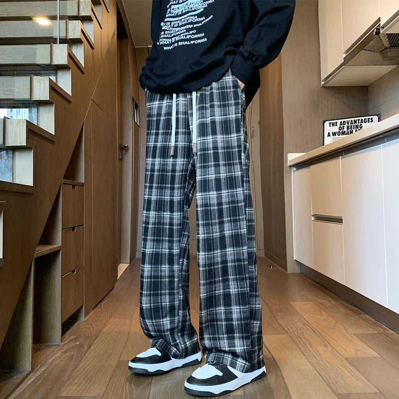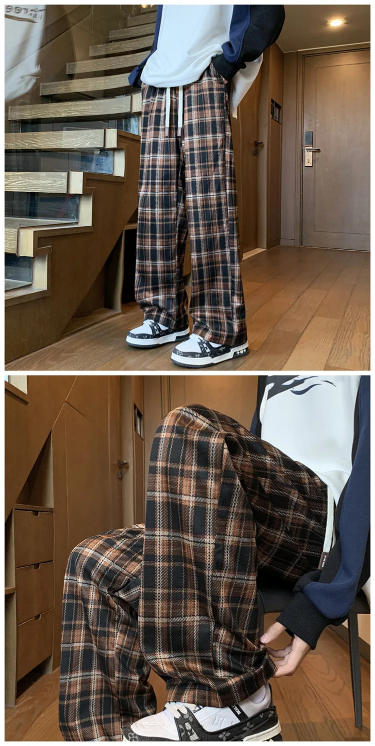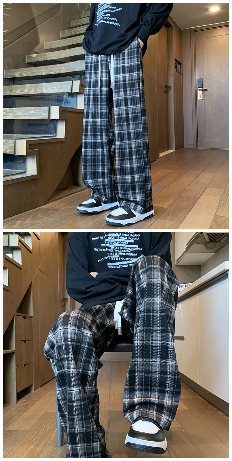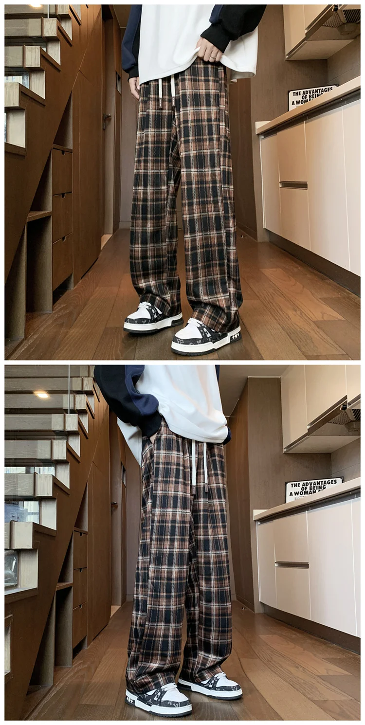 Autumn Classic Men's Plaid Pants Fashion Casual Long Straight Trousers Drawstring Wide Leg Check Pant