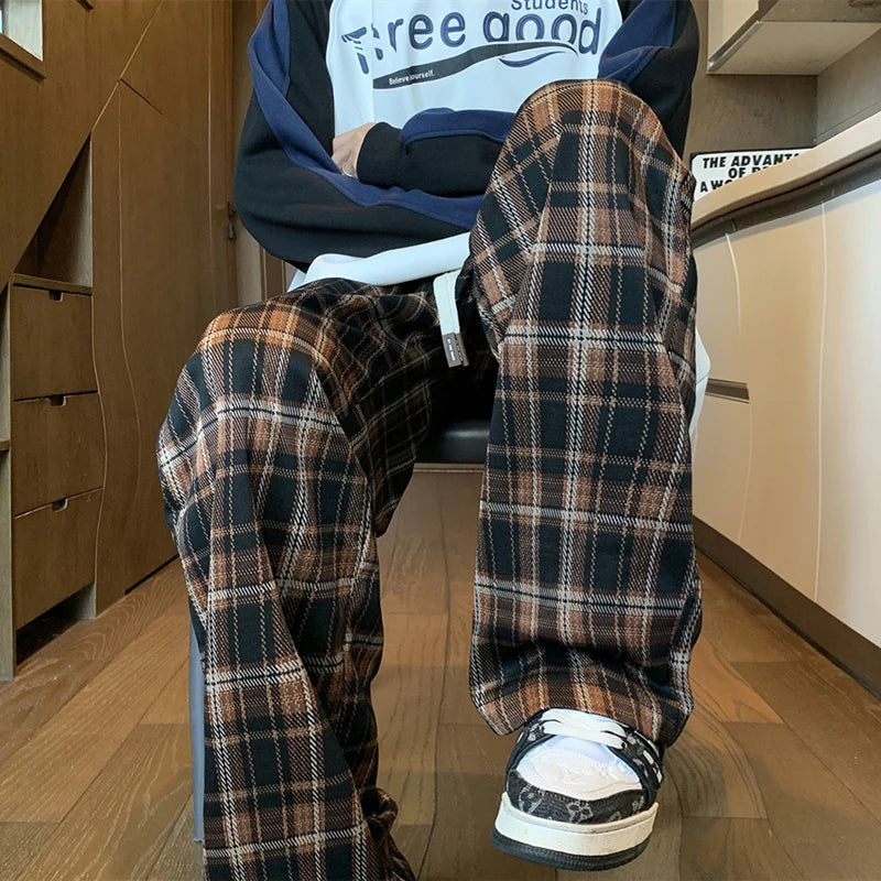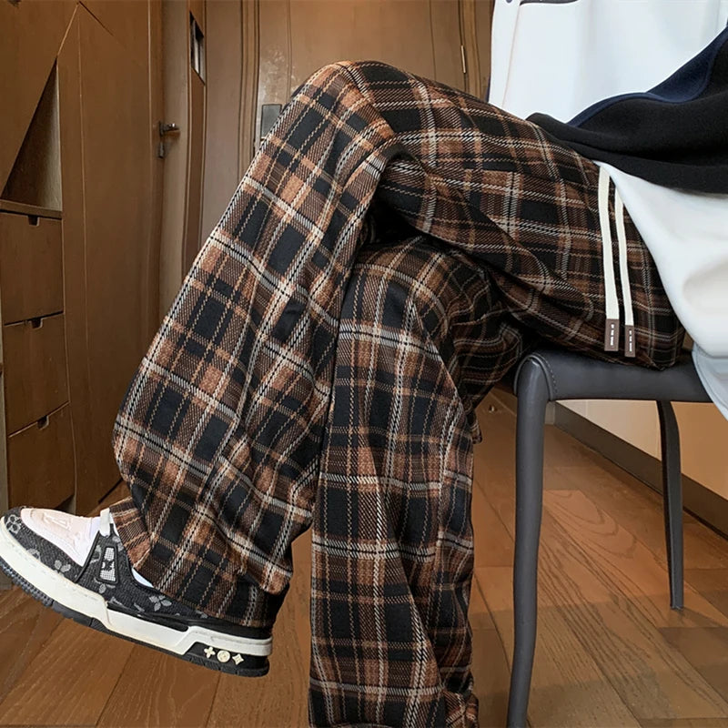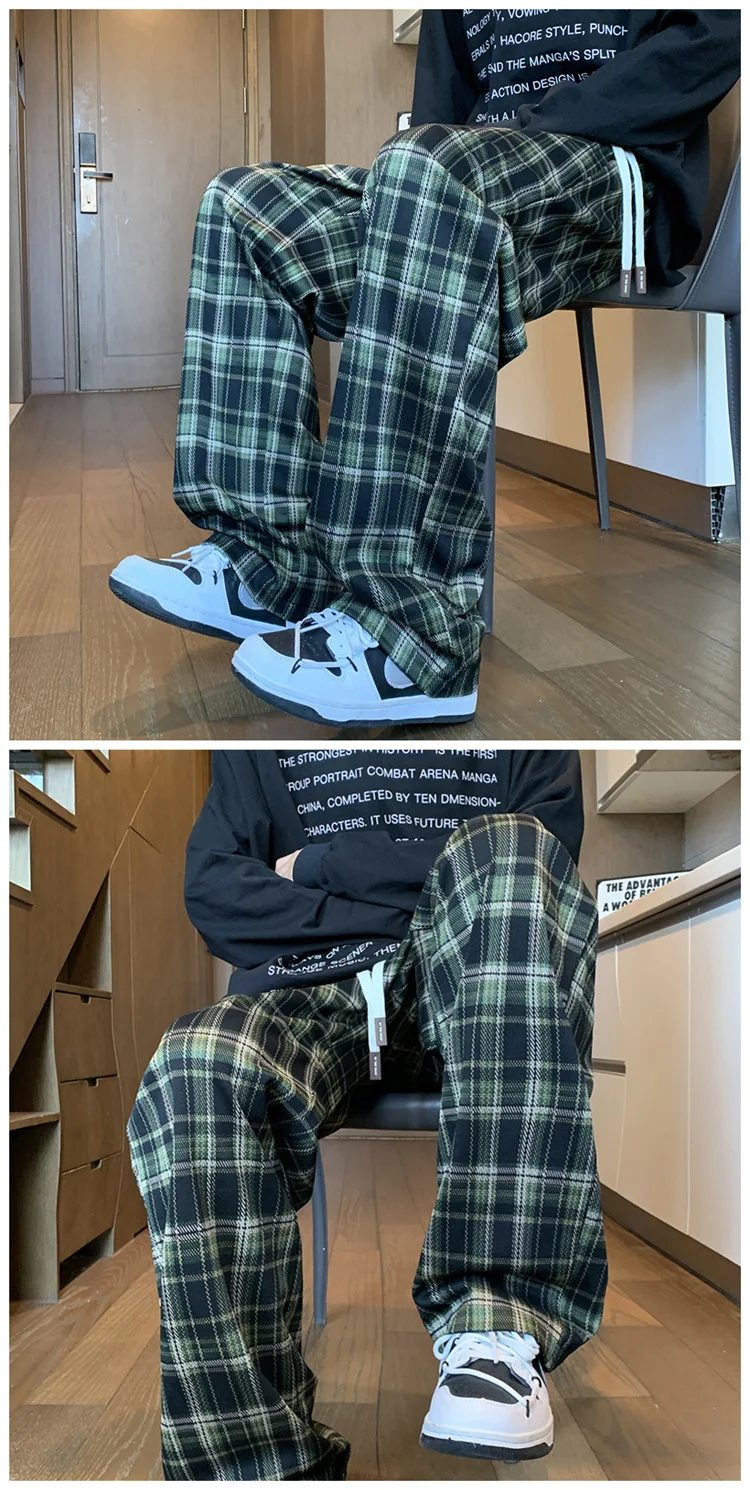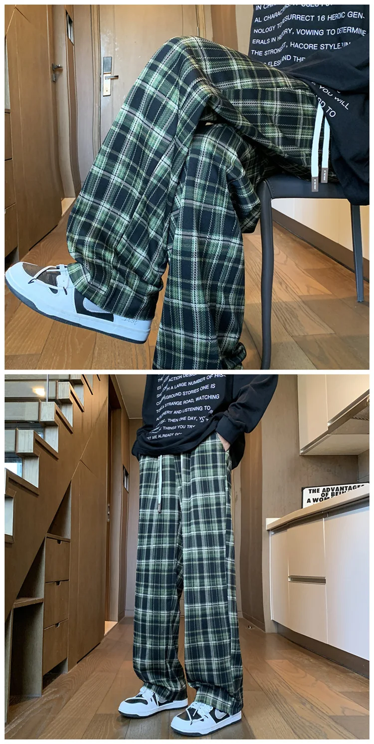 Autumn Classic Men's Plaid Pants Fashion Casual Long Straight Trousers Drawstring Wide Leg Check Pant