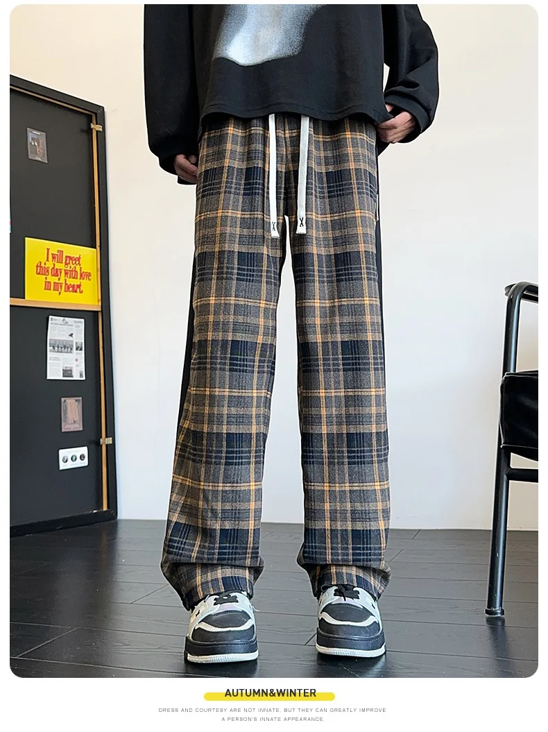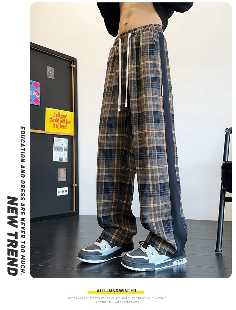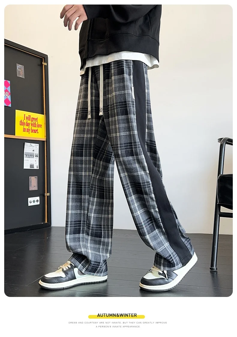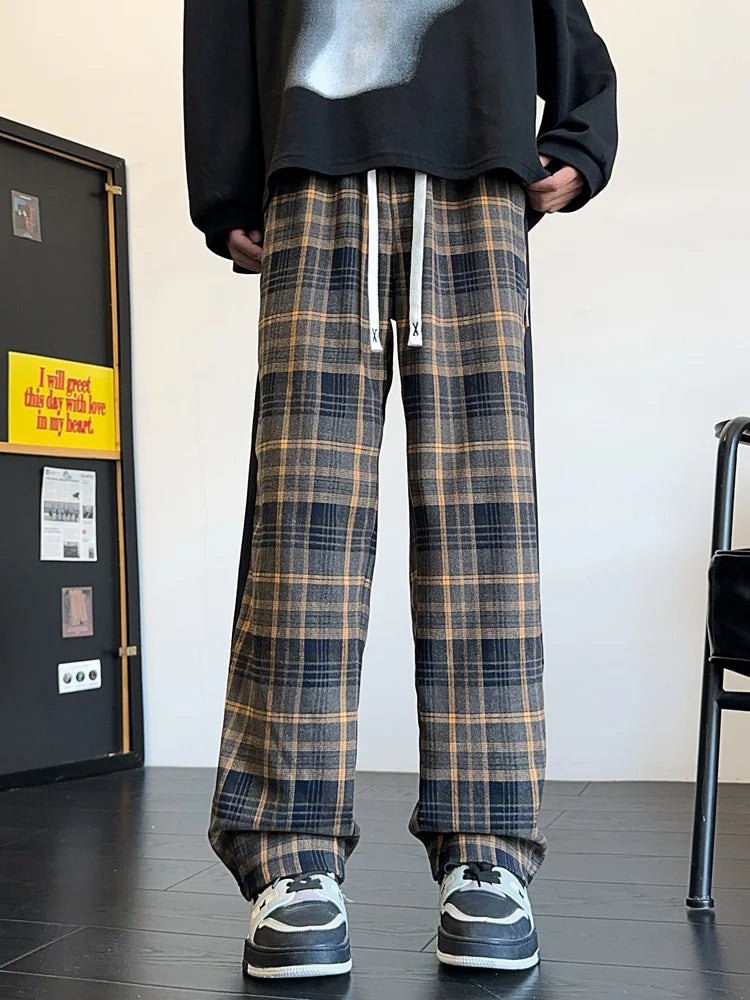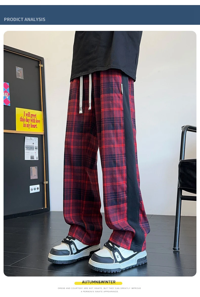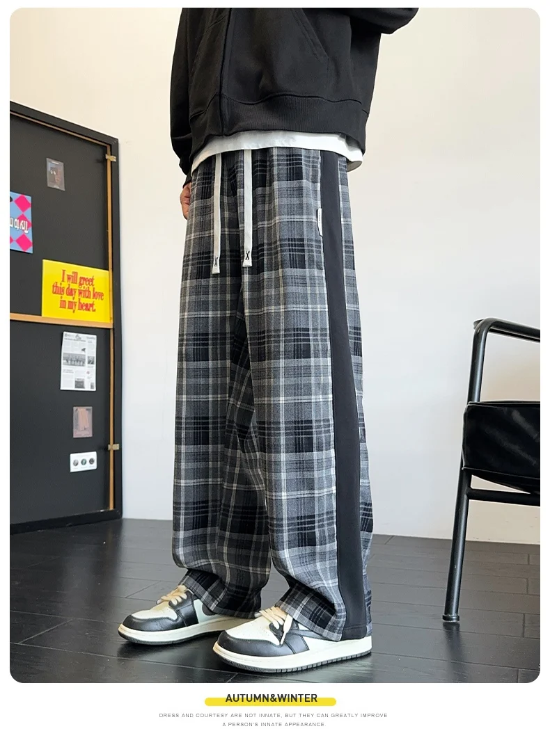 Men's Fashion Plaid Casual Pants Baggy Straight High Street Trousers Elastic Waist Drawstring Classic Male Clothing Trendy Brand