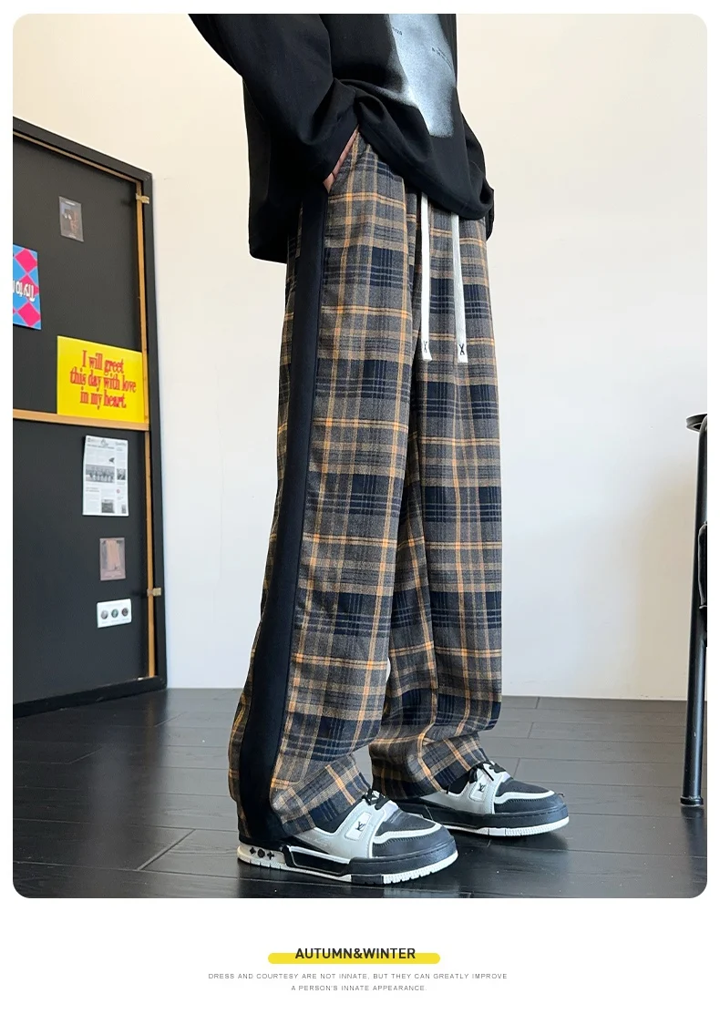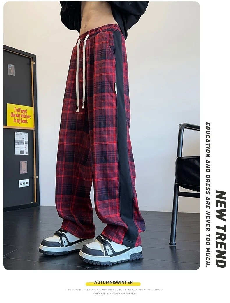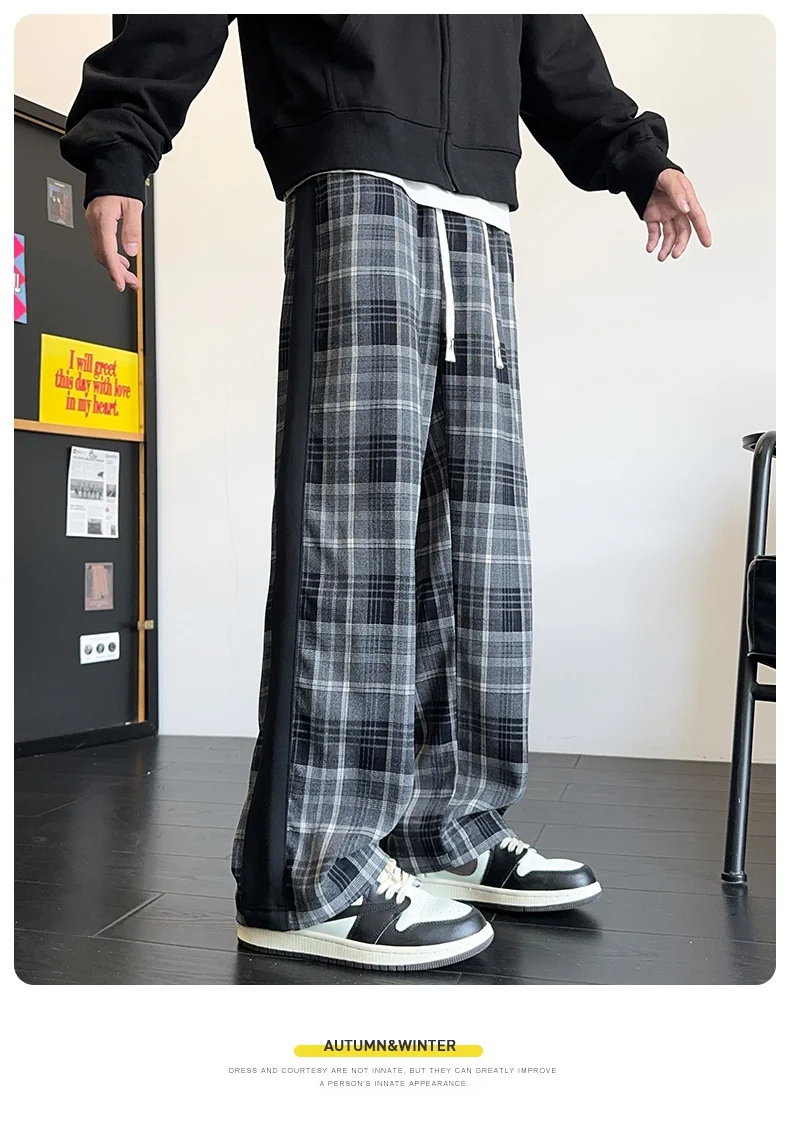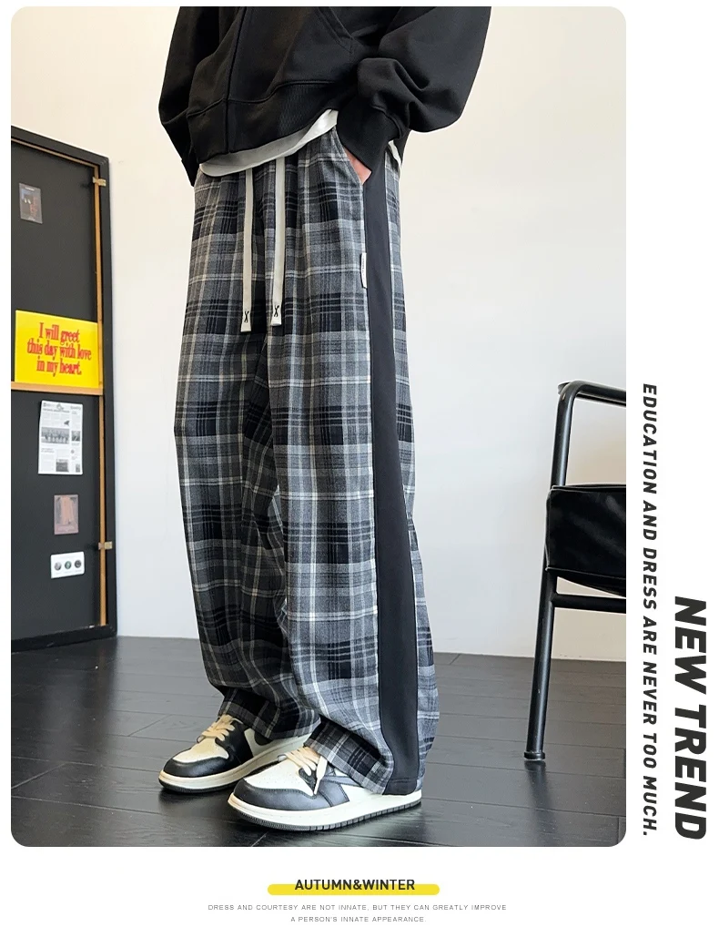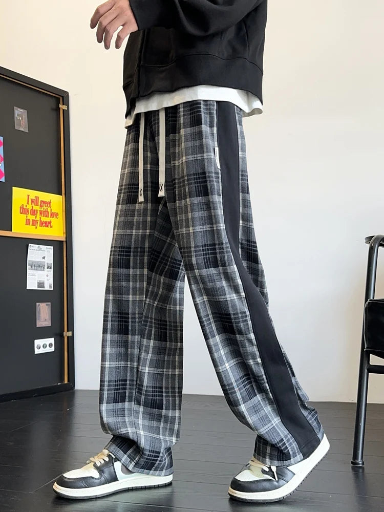 Men's Fashion Plaid Casual Pants Baggy Straight High Street Trousers Elastic Waist Drawstring Classic Male Clothing Trendy Brand