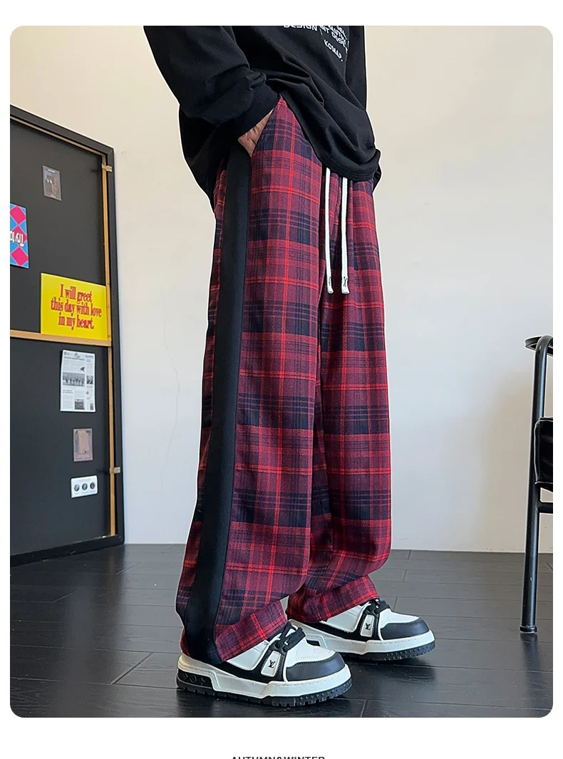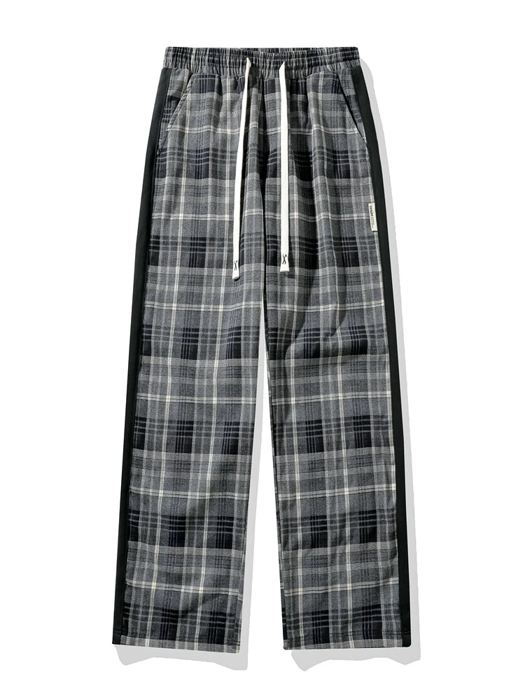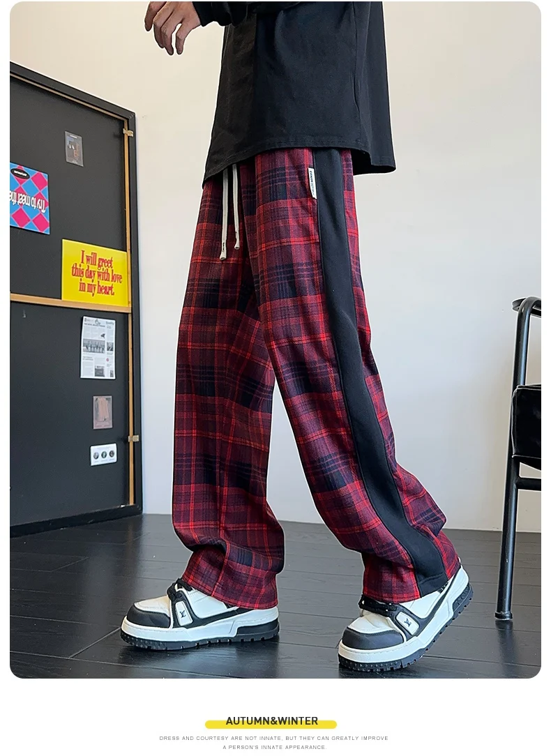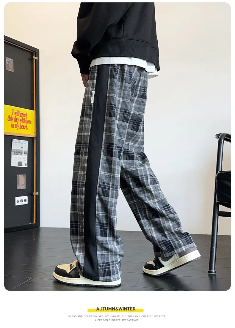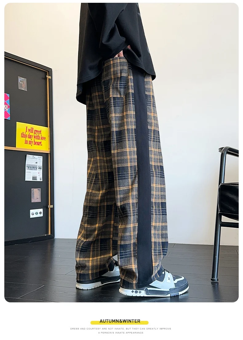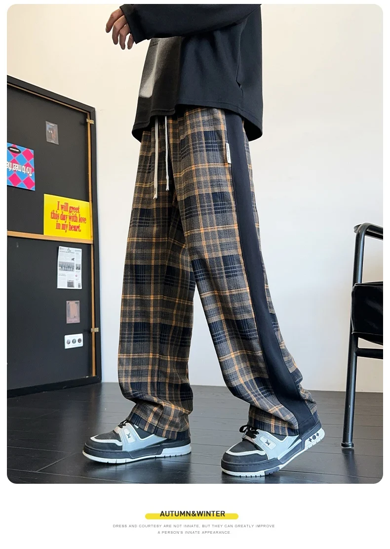 Men's Fashion Plaid Casual Pants Baggy Straight High Street Trousers Elastic Waist Drawstring Classic Male Clothing Trendy Brand