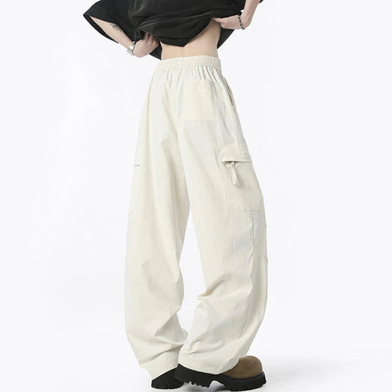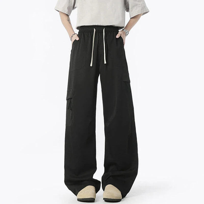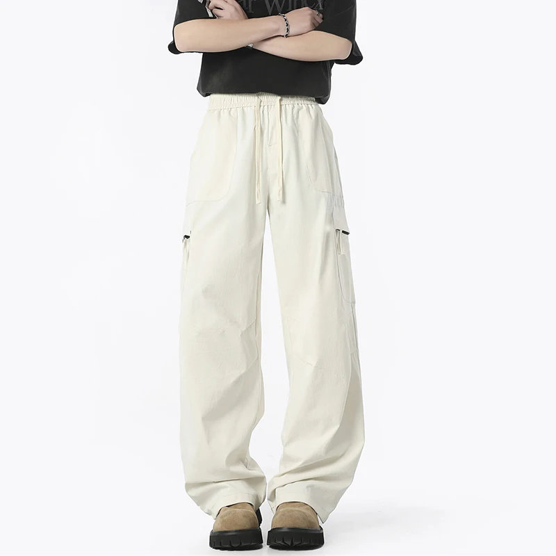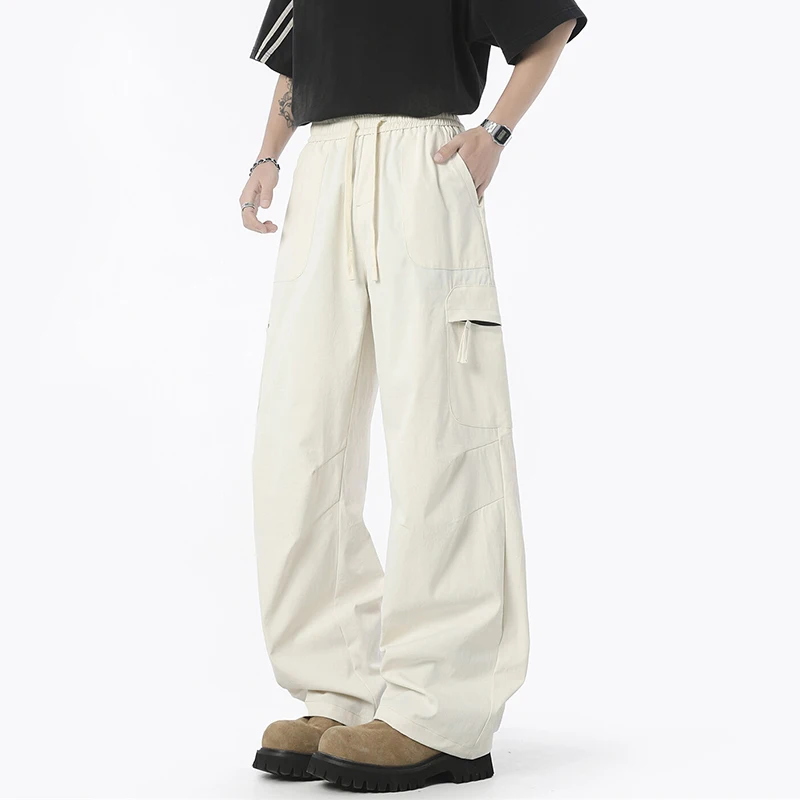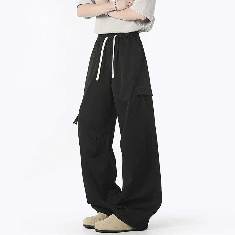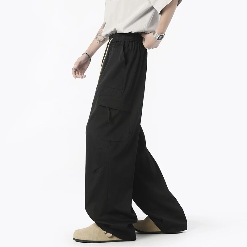 Side Pocket Men's Casual Trousers Solid Color Korean Style Elastic Waist Pants Straight Leg Loose Male Bottom Simple