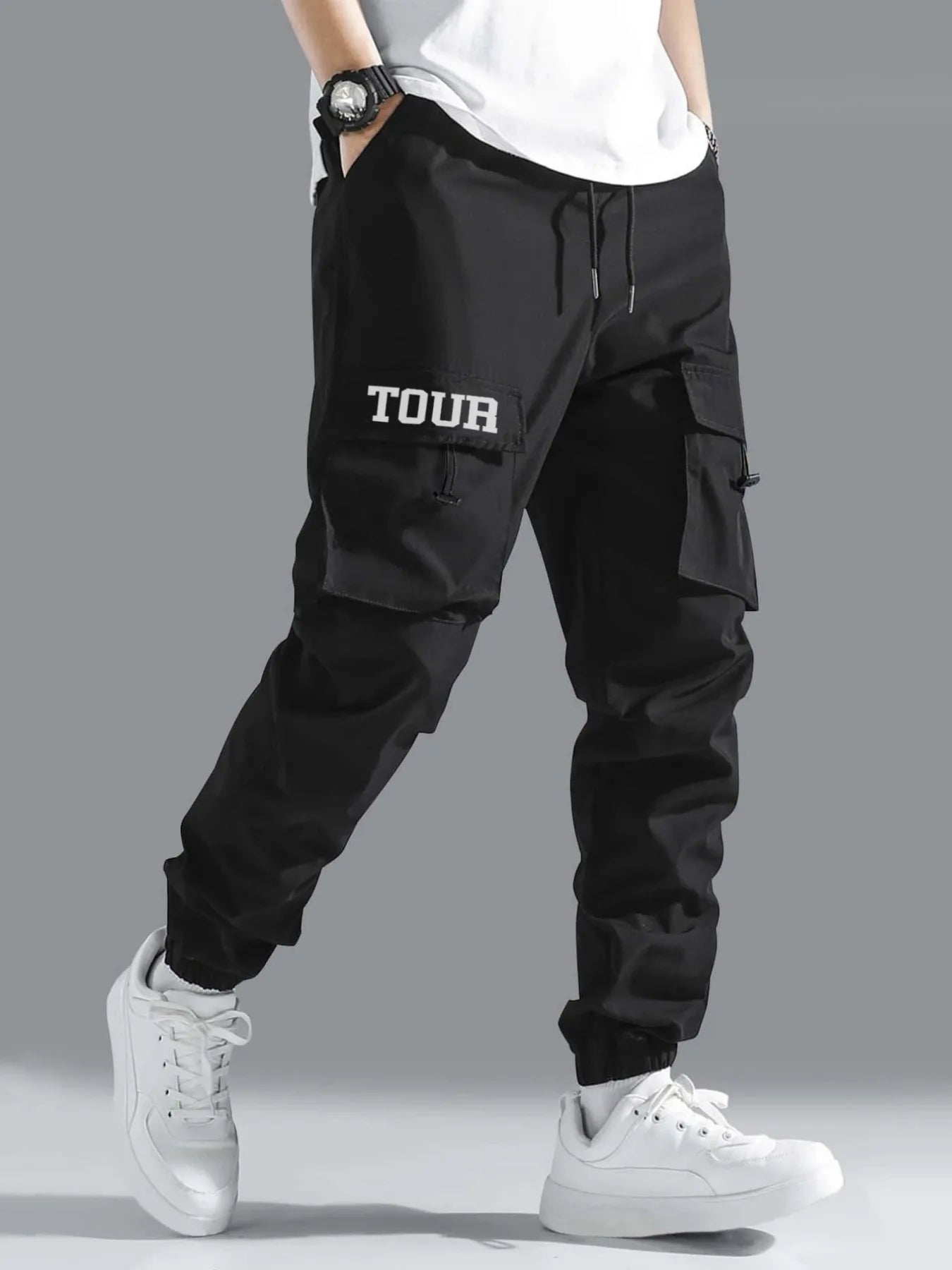 Men Flap Pocket Side Drawstring Waist Cargo Pants