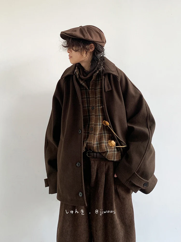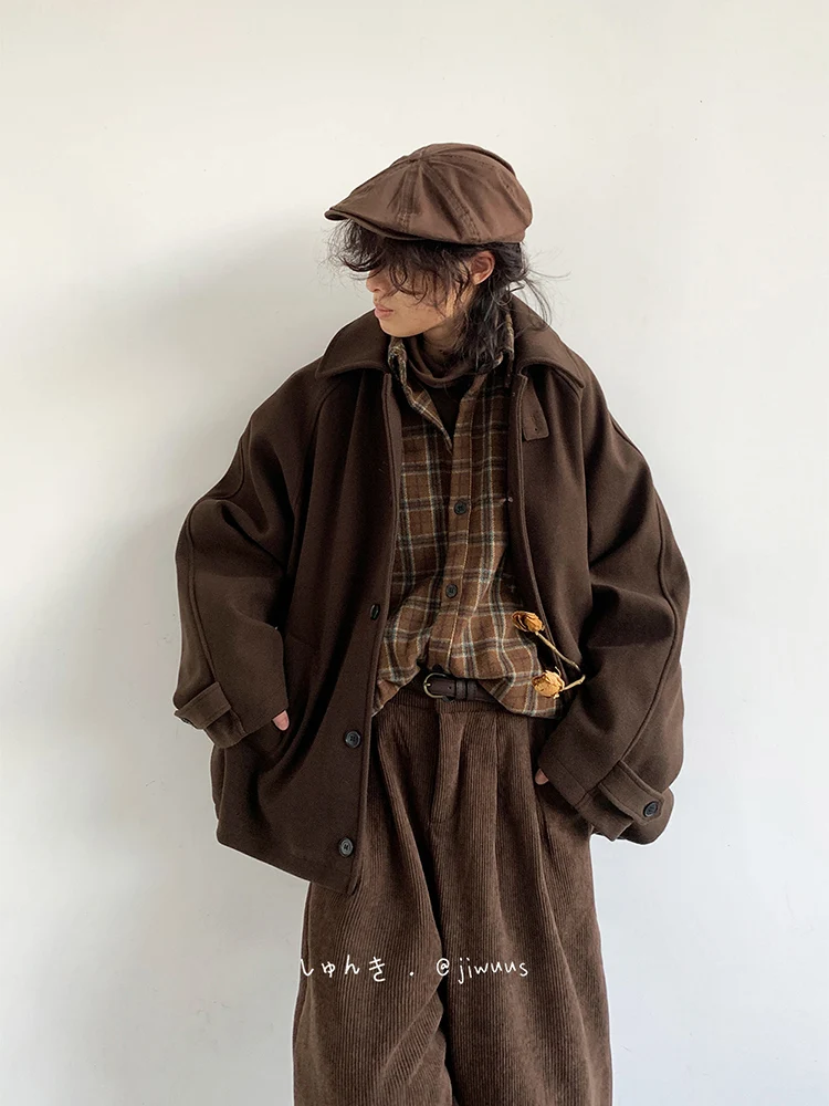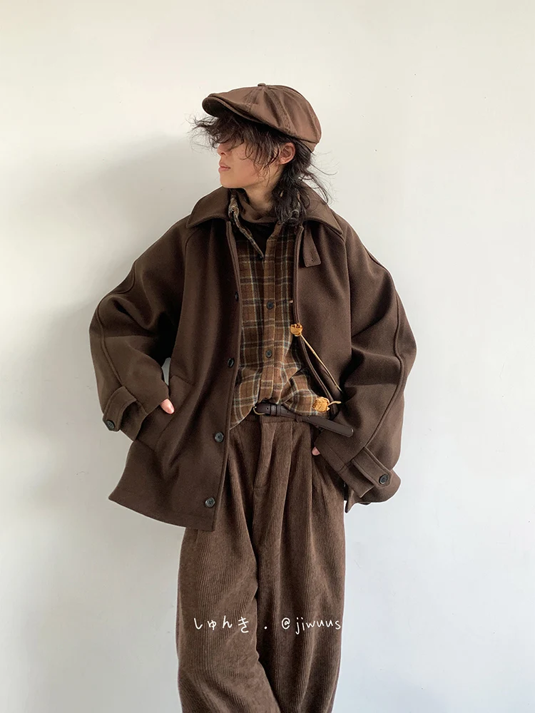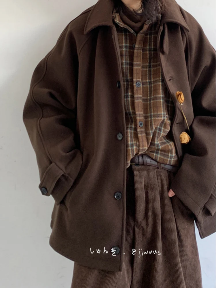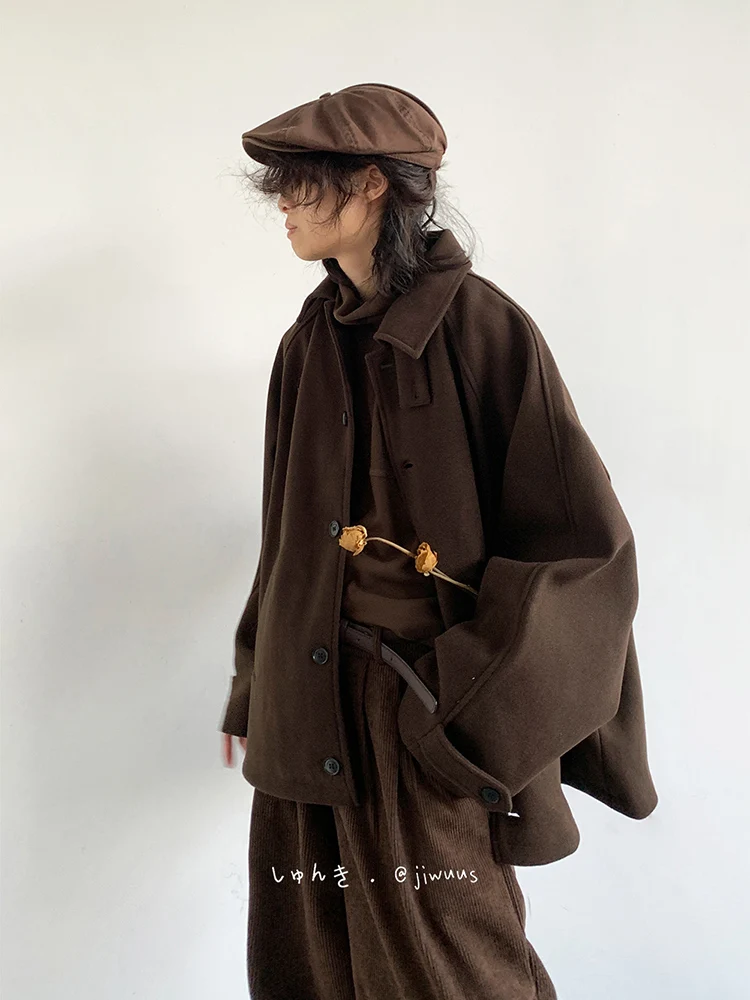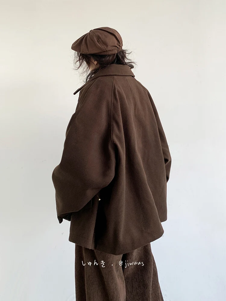 Autumn Winter Oversized Warm Soft Caramel Woolen Jacket Men Raglan Sleeve Loose Casual Unisex Clothing