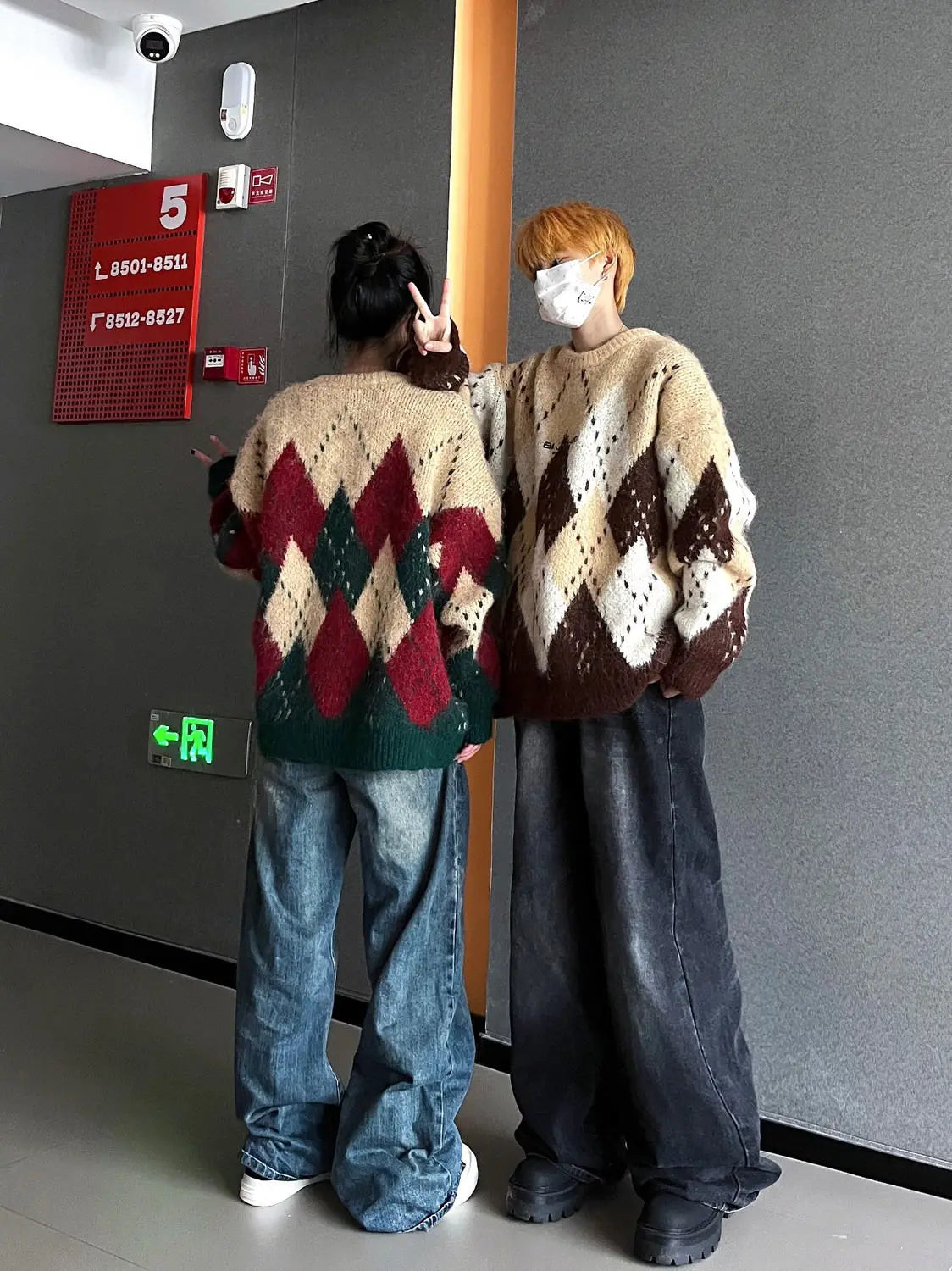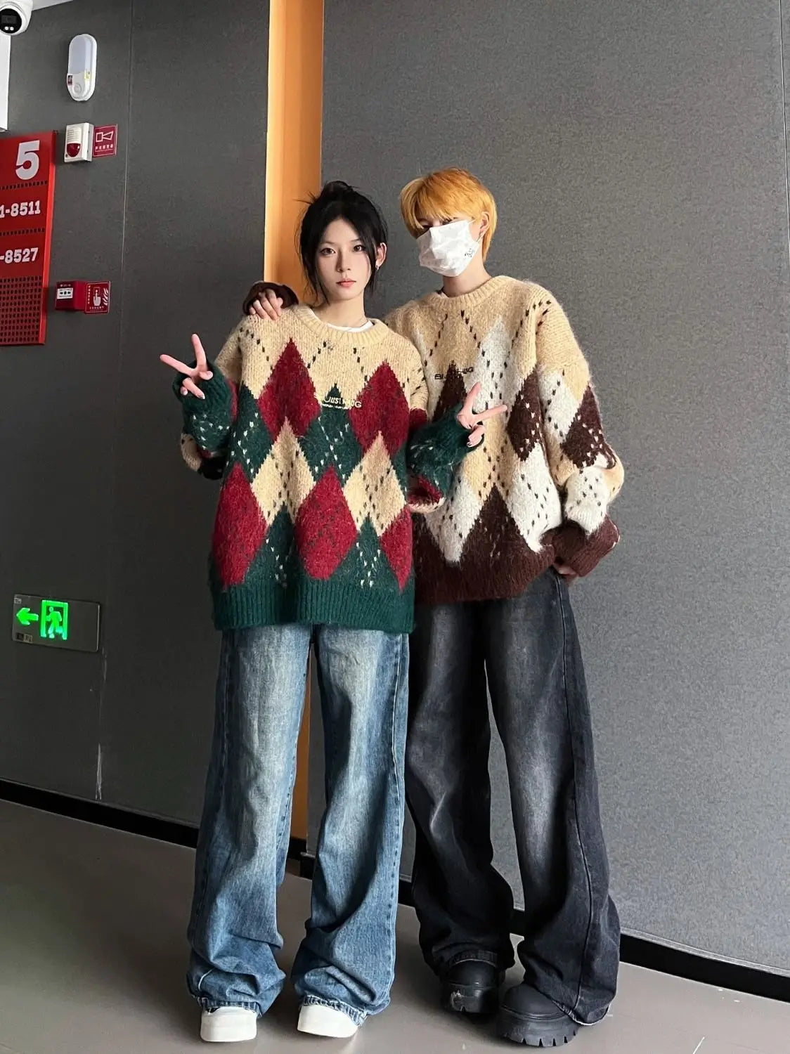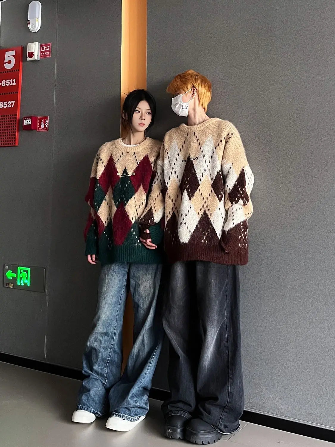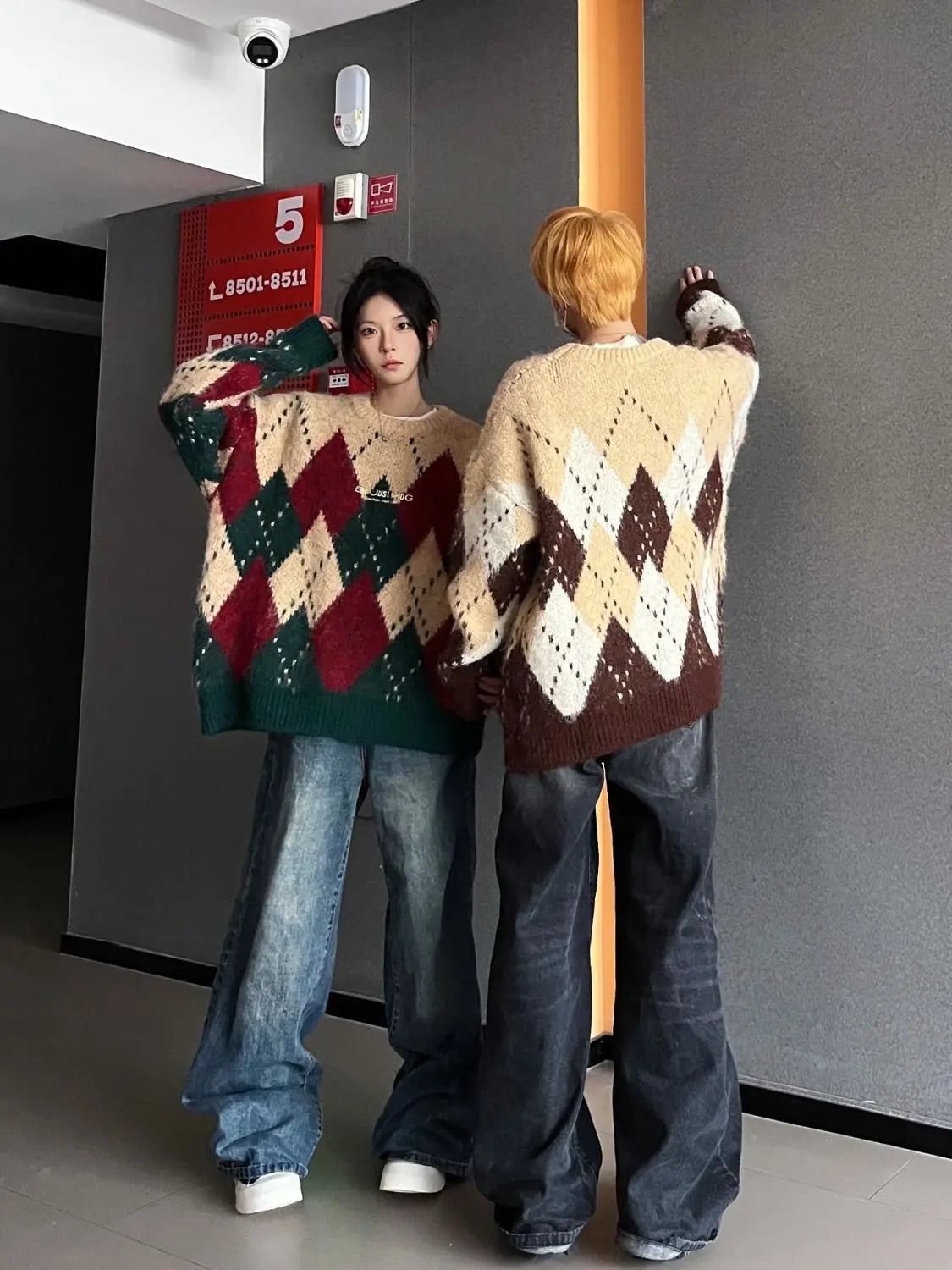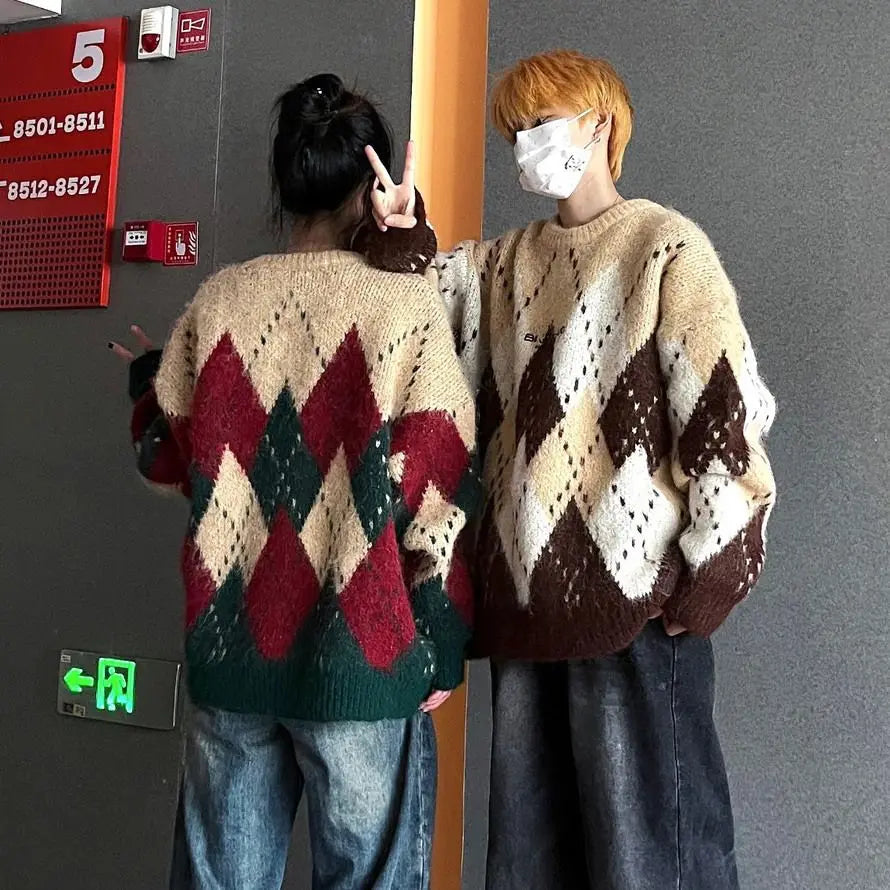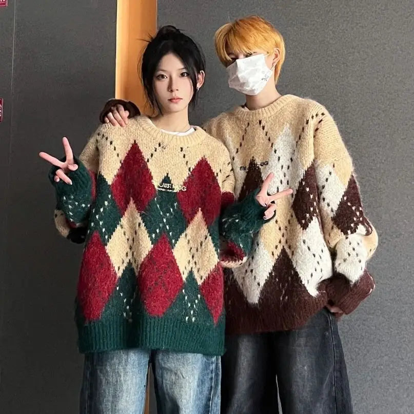 Autumn and winter men and women street personalized design spliced round neck sweater for couples loose retro knitted casual top