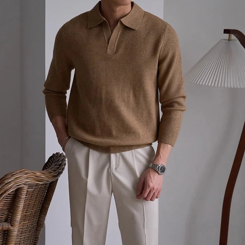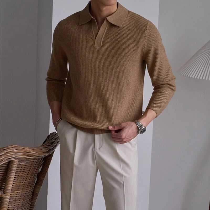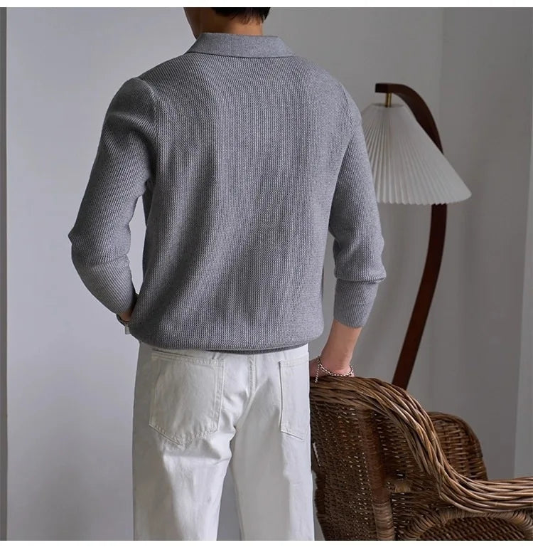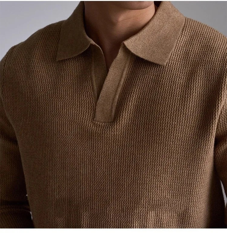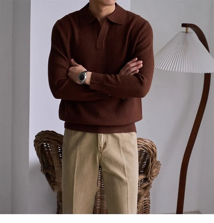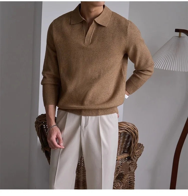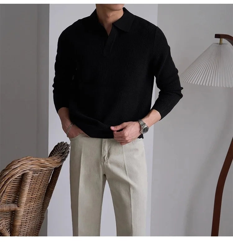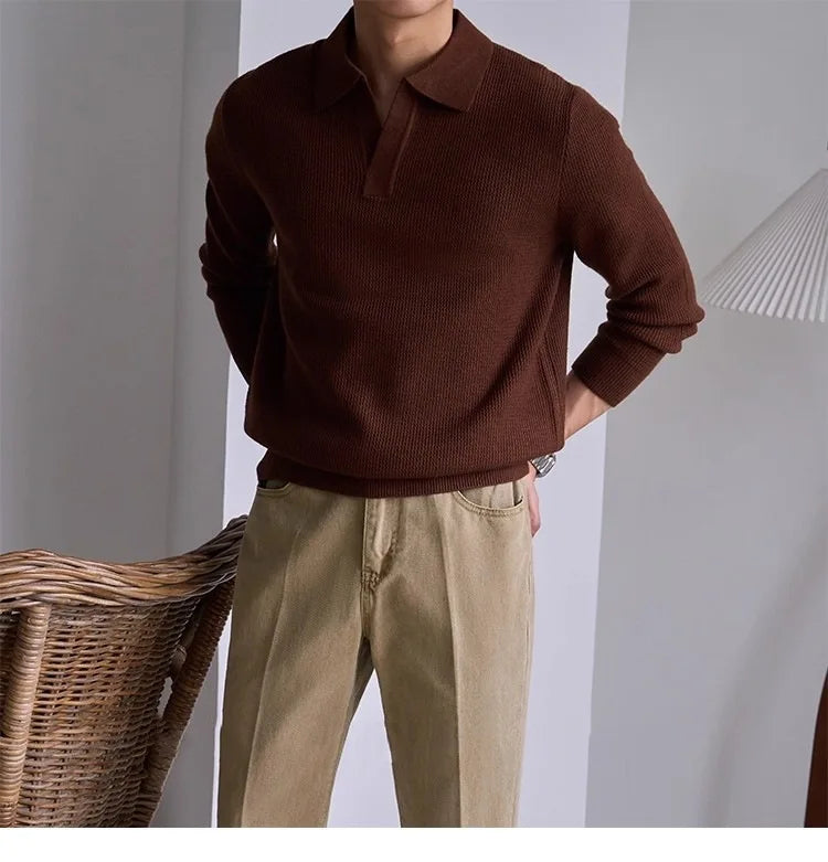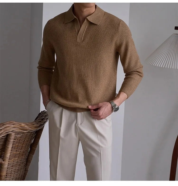 Men's American Retro Polo Sweater Luxury Trendy Business V Neck Knit Solid Color Pullover Leisure Slim-fit Long Sleeve Knitwear