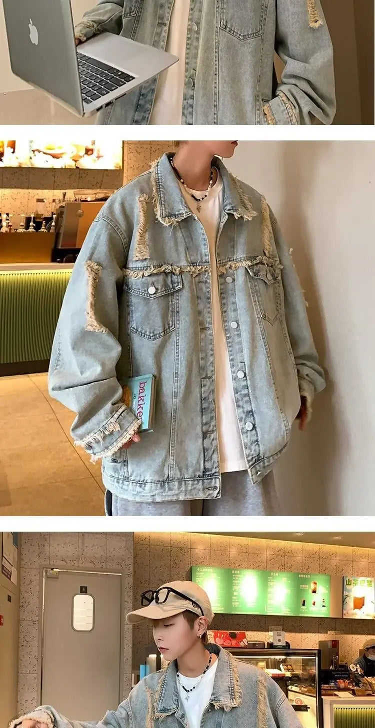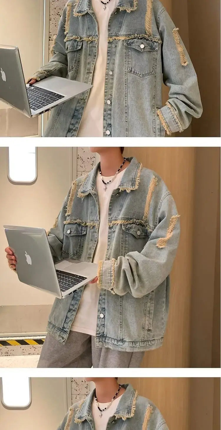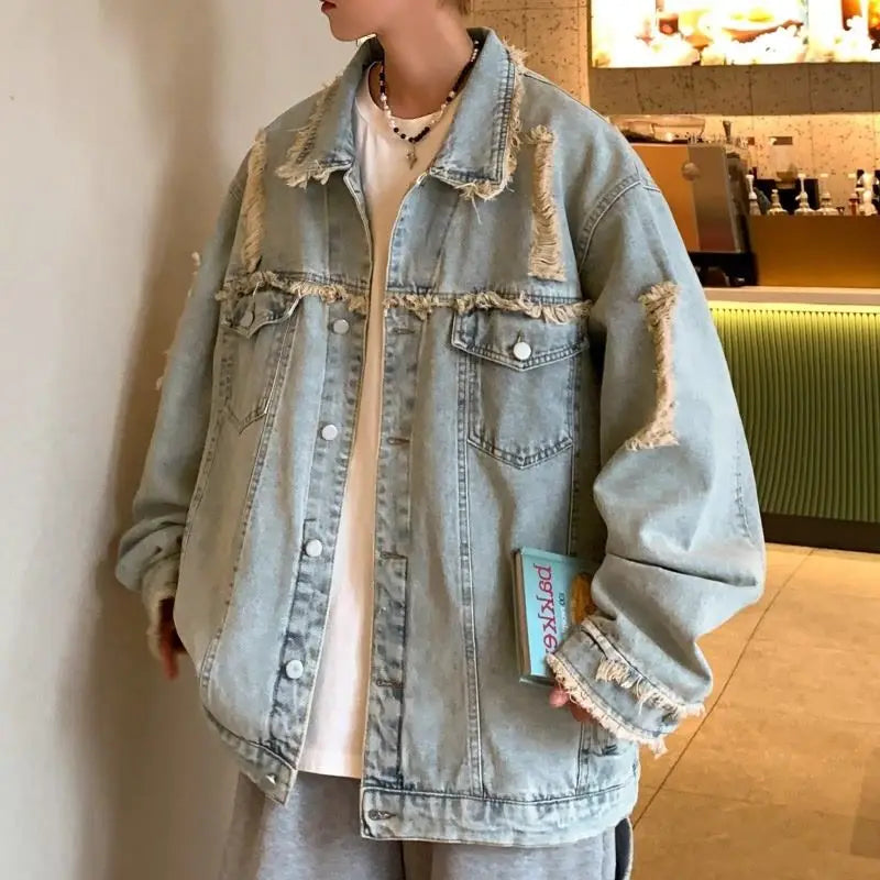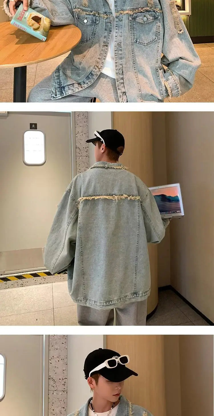 Men's Ripped Denim Jacket Autumn American Retro Washed Hip Hop Streetwear Cool Trendy Loose Casual Jacket Button Up Jeans Coat