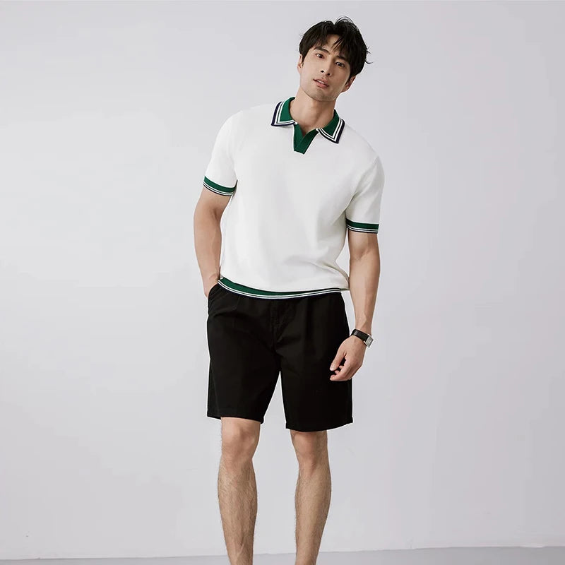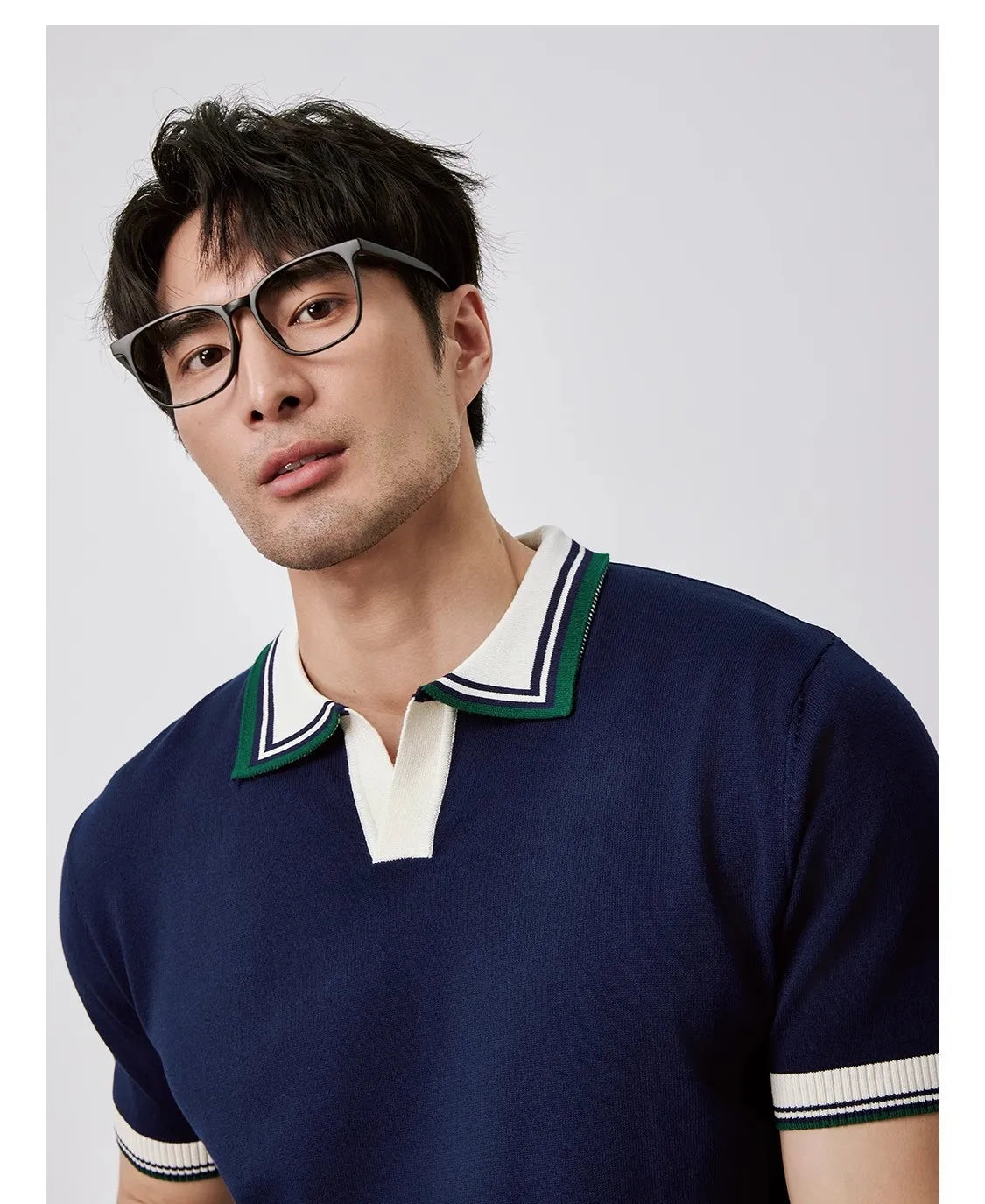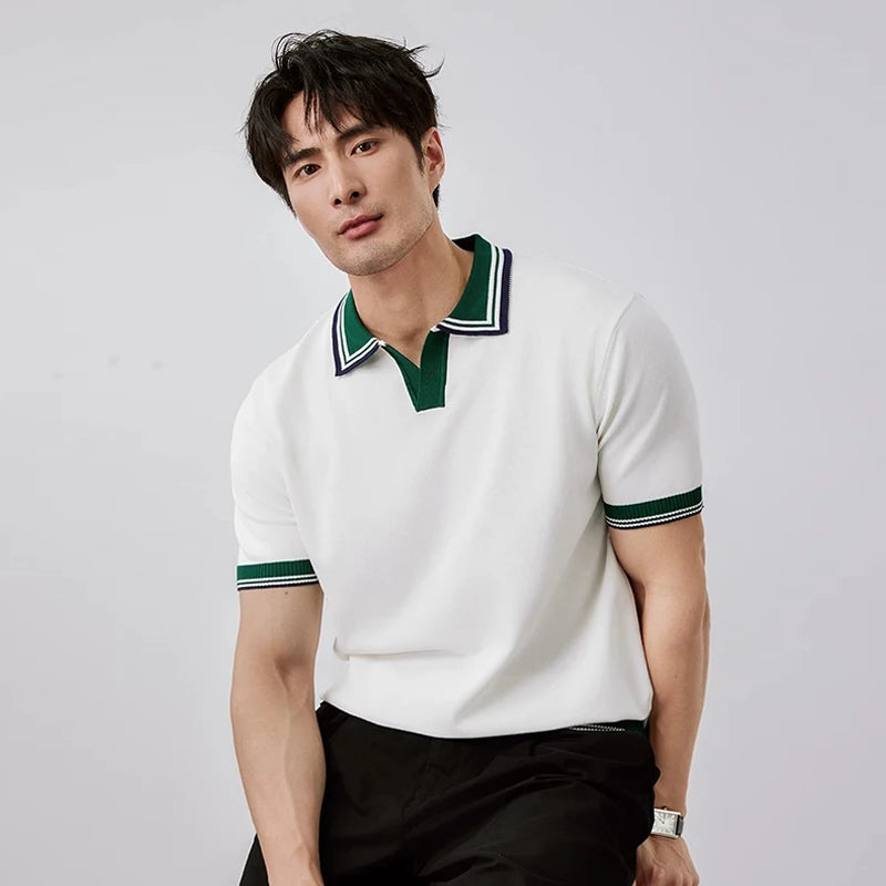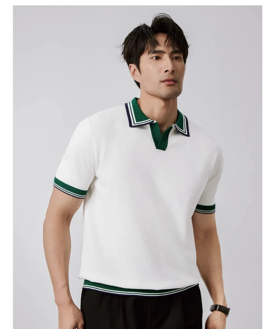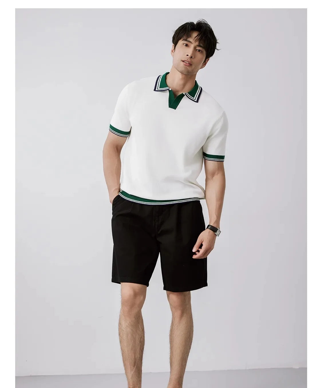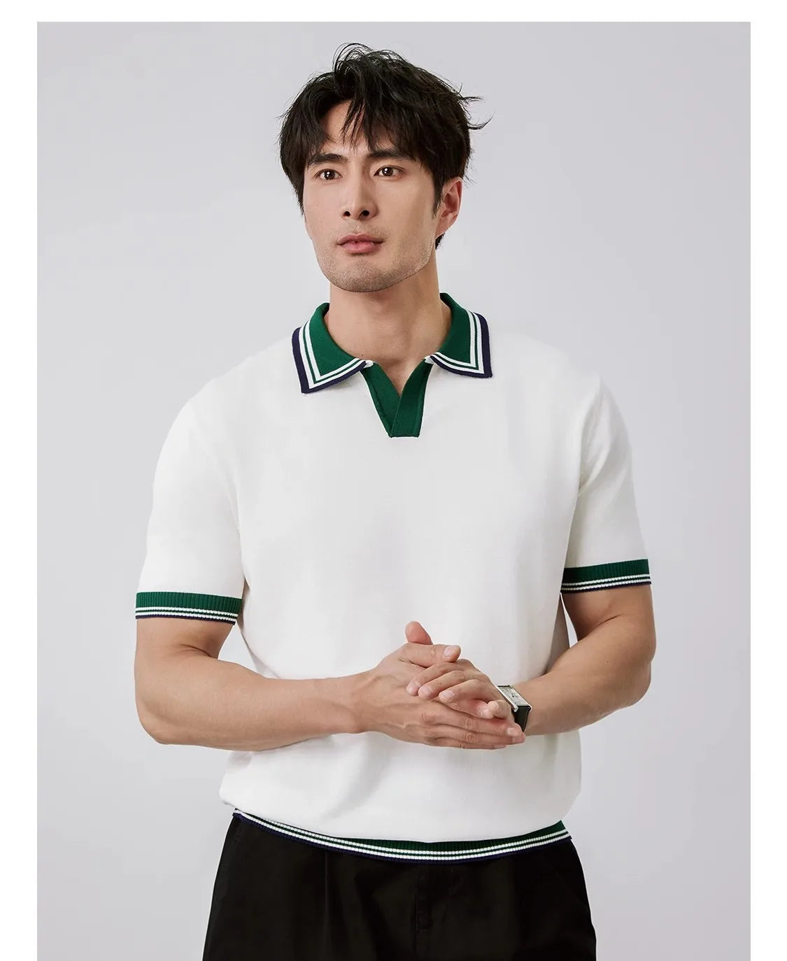 New Japanese Trendy Men Polo Shirt Light Luxury Slim-fit V Neck T-shirt Leisure Patchwork Short Sleeve Tops Retro Knitwear M-3XL