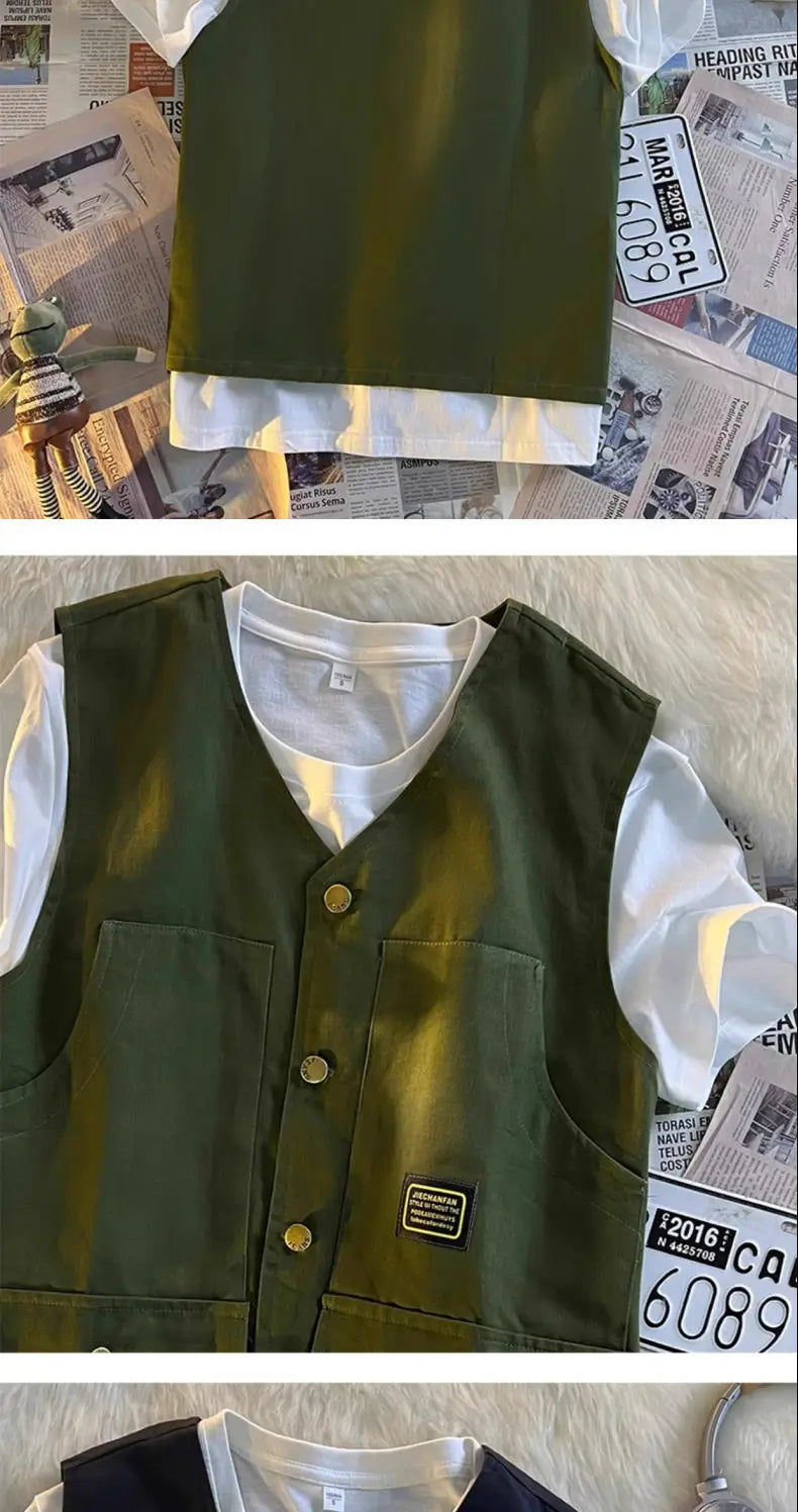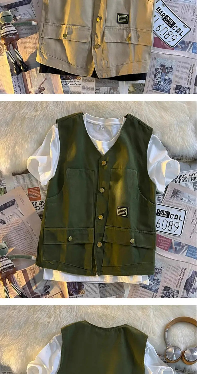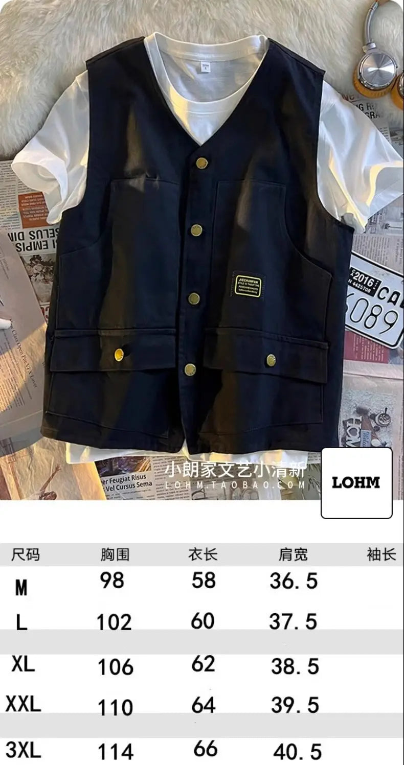 Summer Workwear Vest Men Hong Kong Style High Street Outfit Casual Hip-hop Waistcoat Versatile Loose Sleeveless Jacket