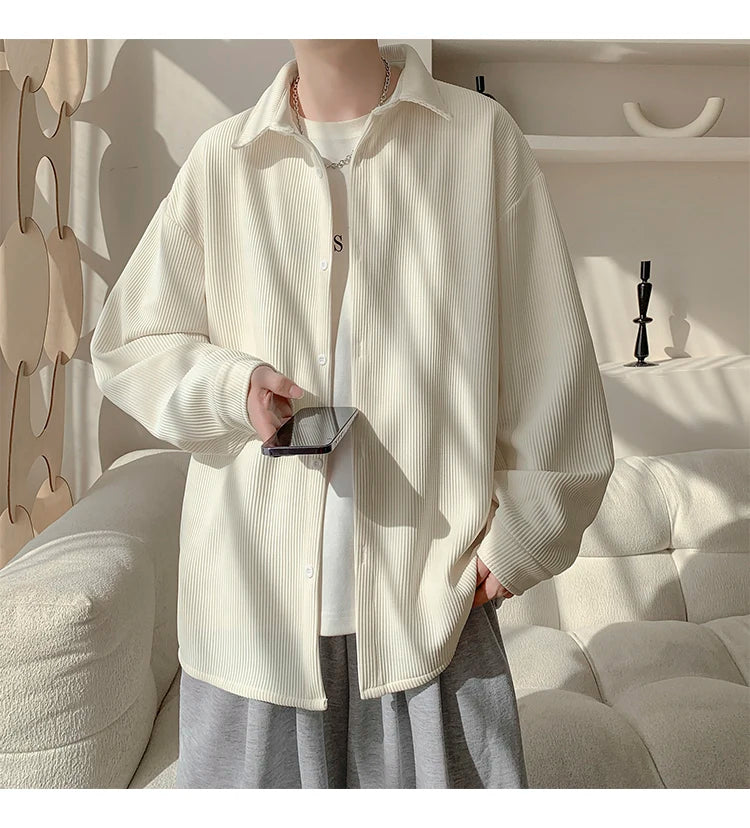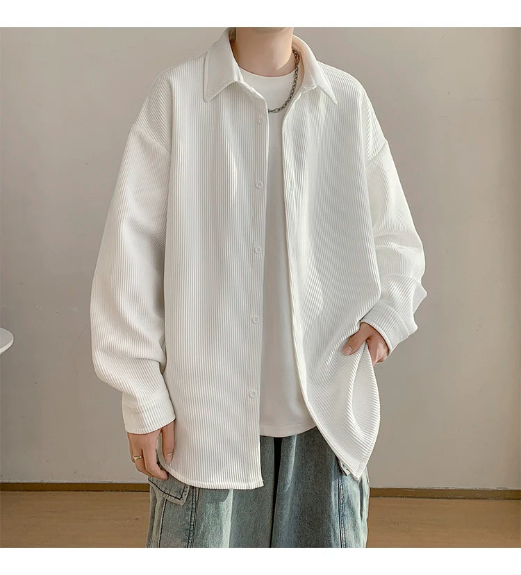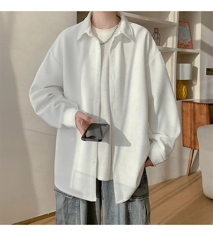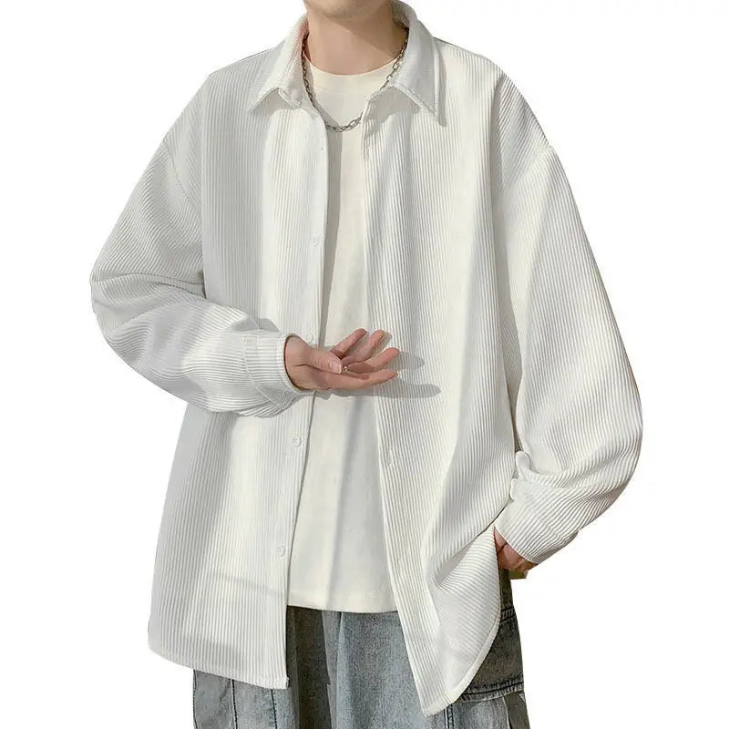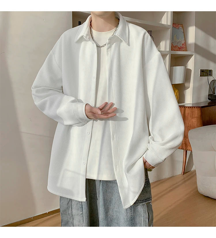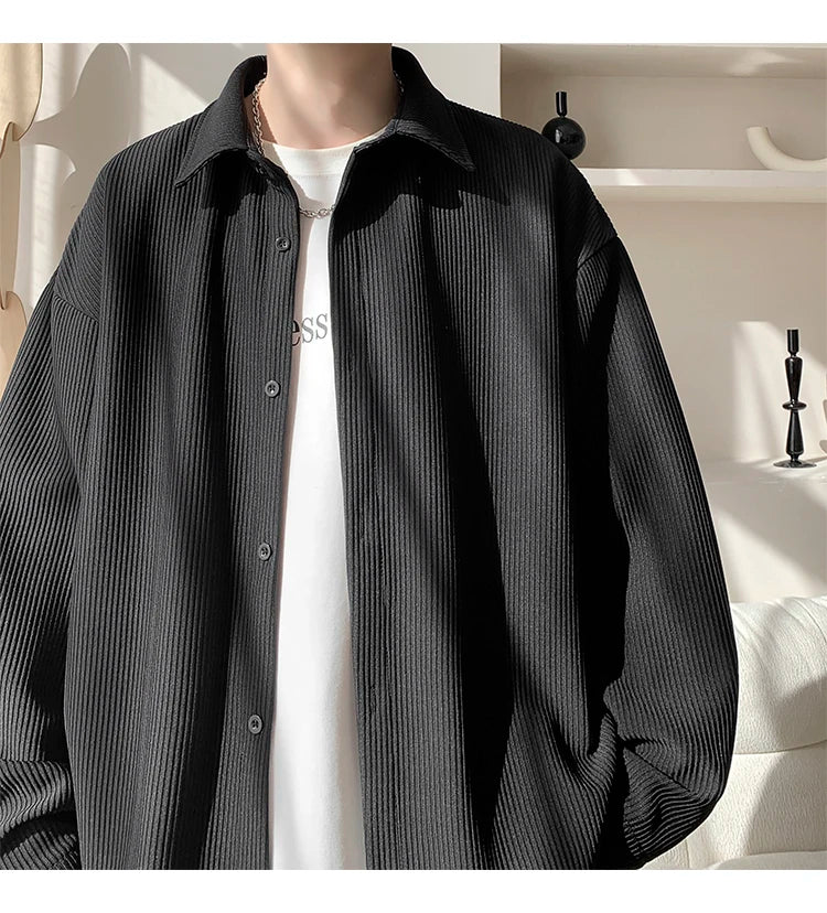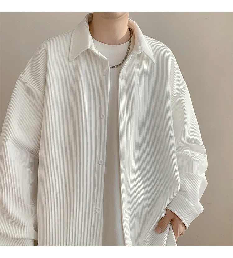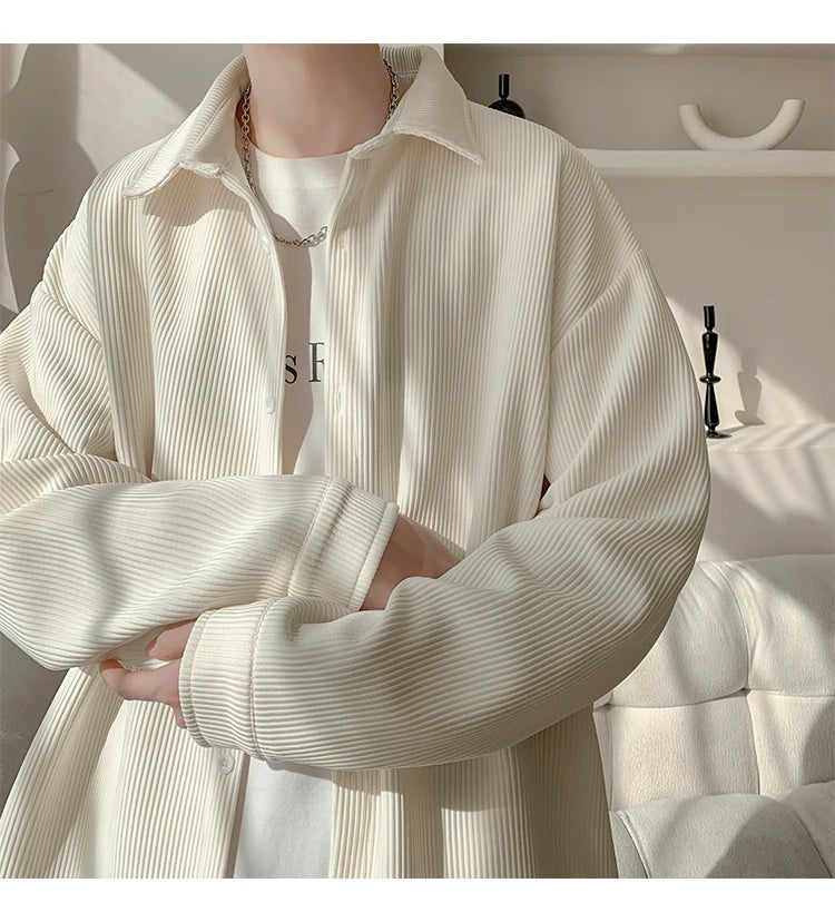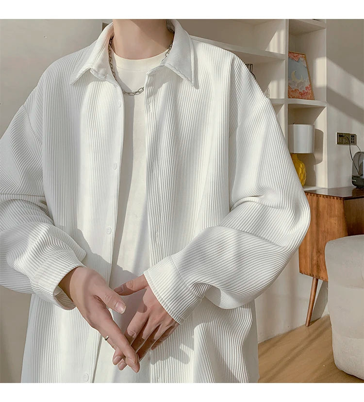 White Long Sleeved Shirt Men Fashion Black Casual Shirt Men Streetwear Korean Loose Pleated Shirt Mens Ice Silk Shirts M-3XL