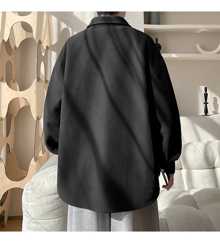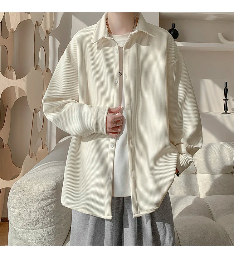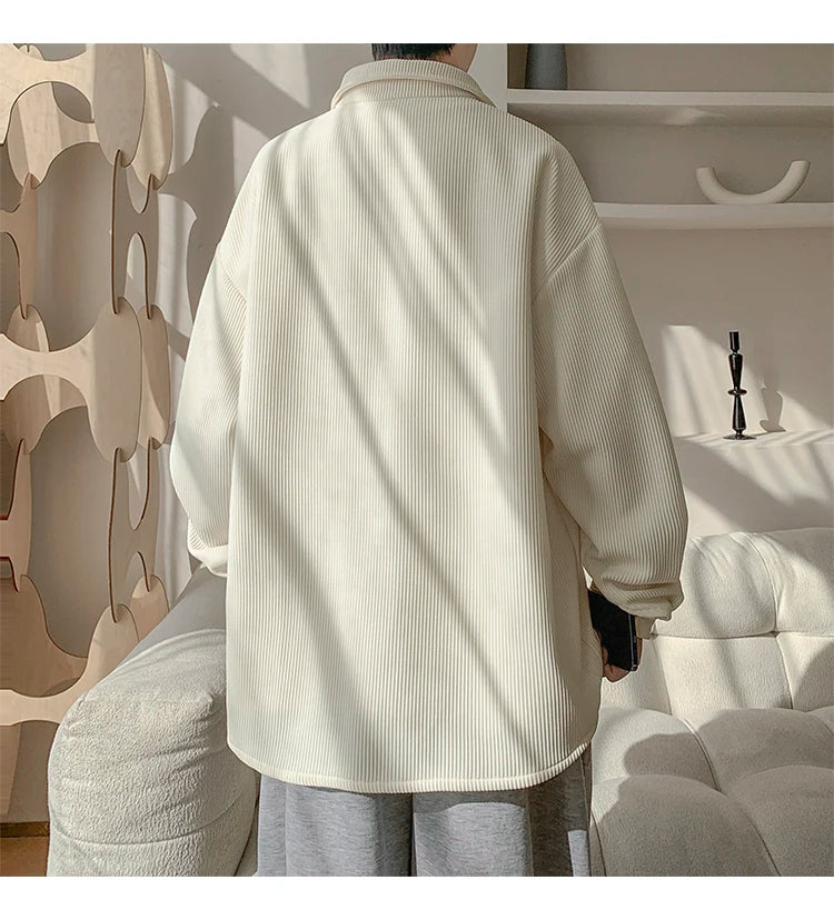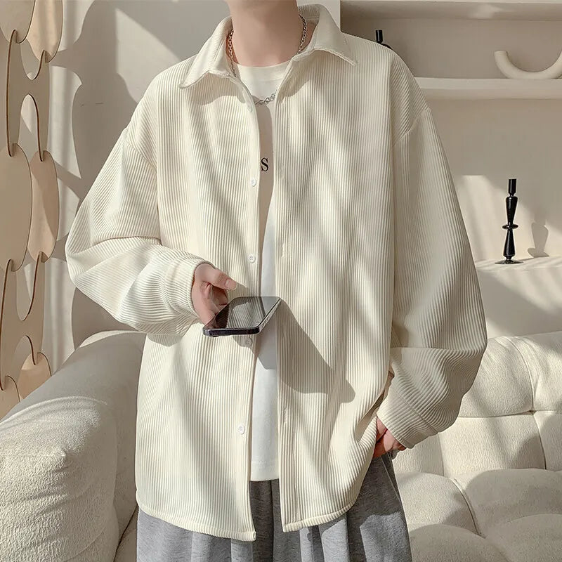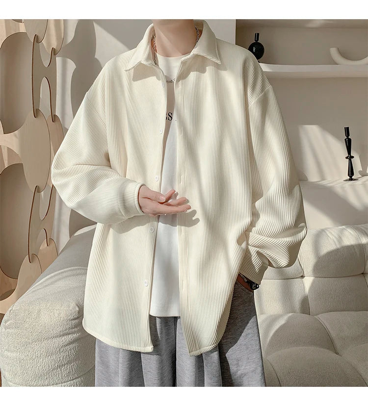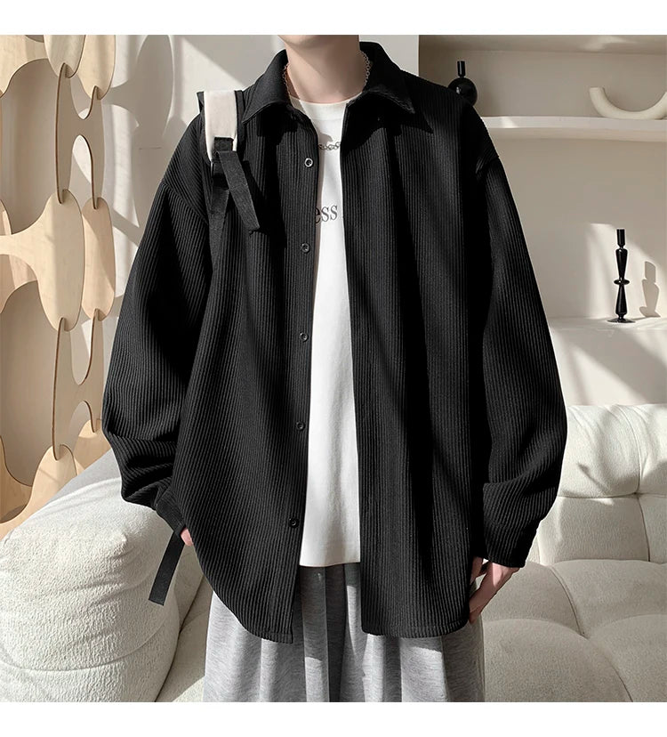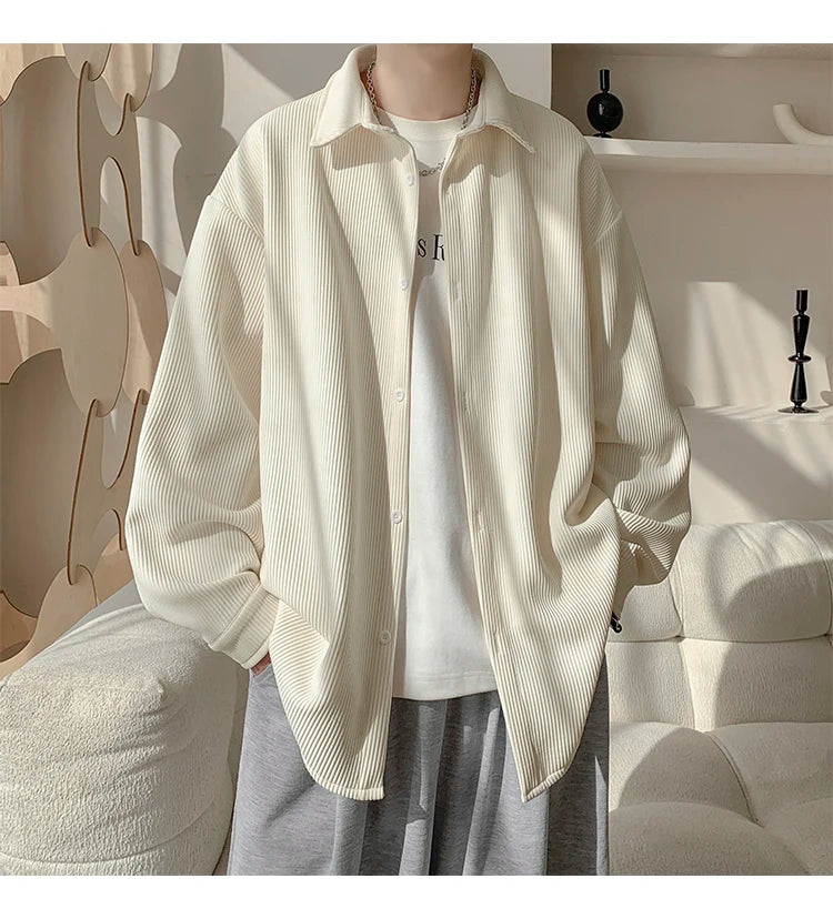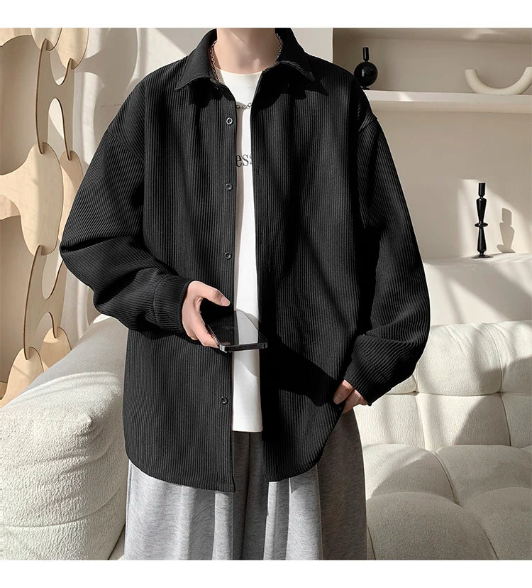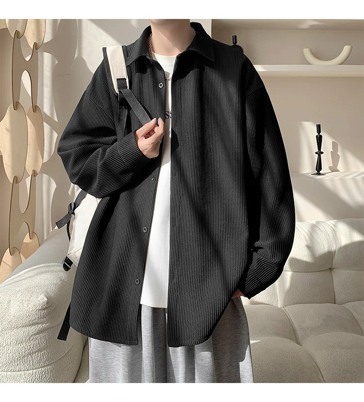 White Long Sleeved Shirt Men Fashion Black Casual Shirt Men Streetwear Korean Loose Pleated Shirt Mens Ice Silk Shirts M-3XL