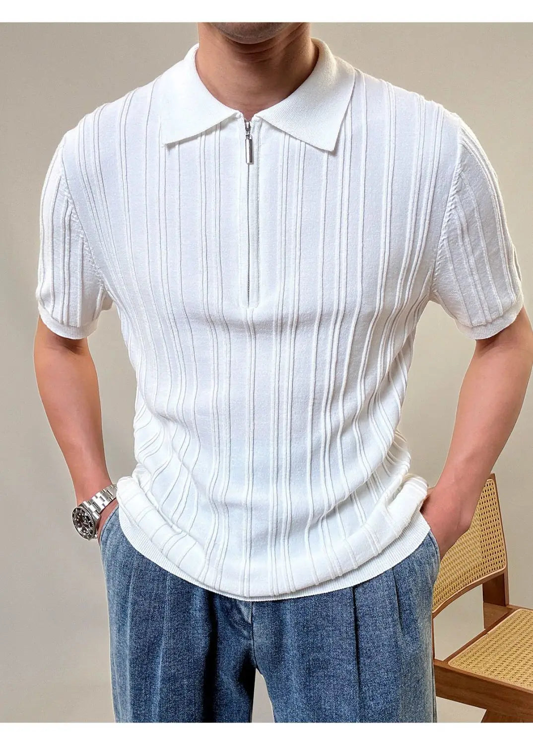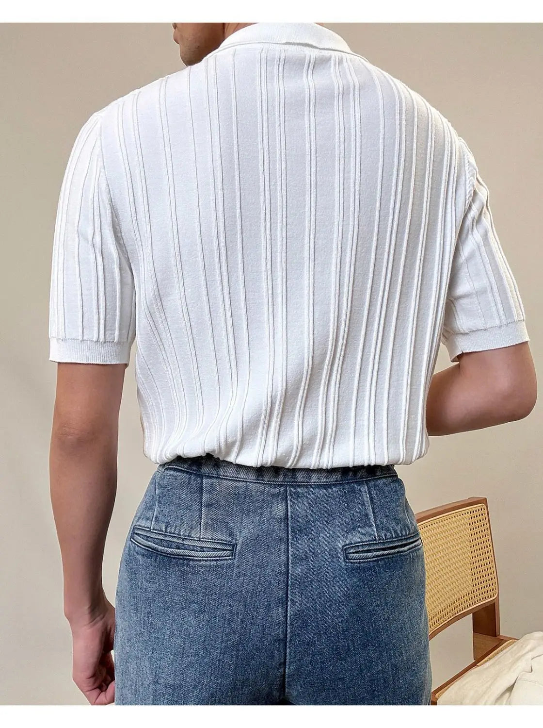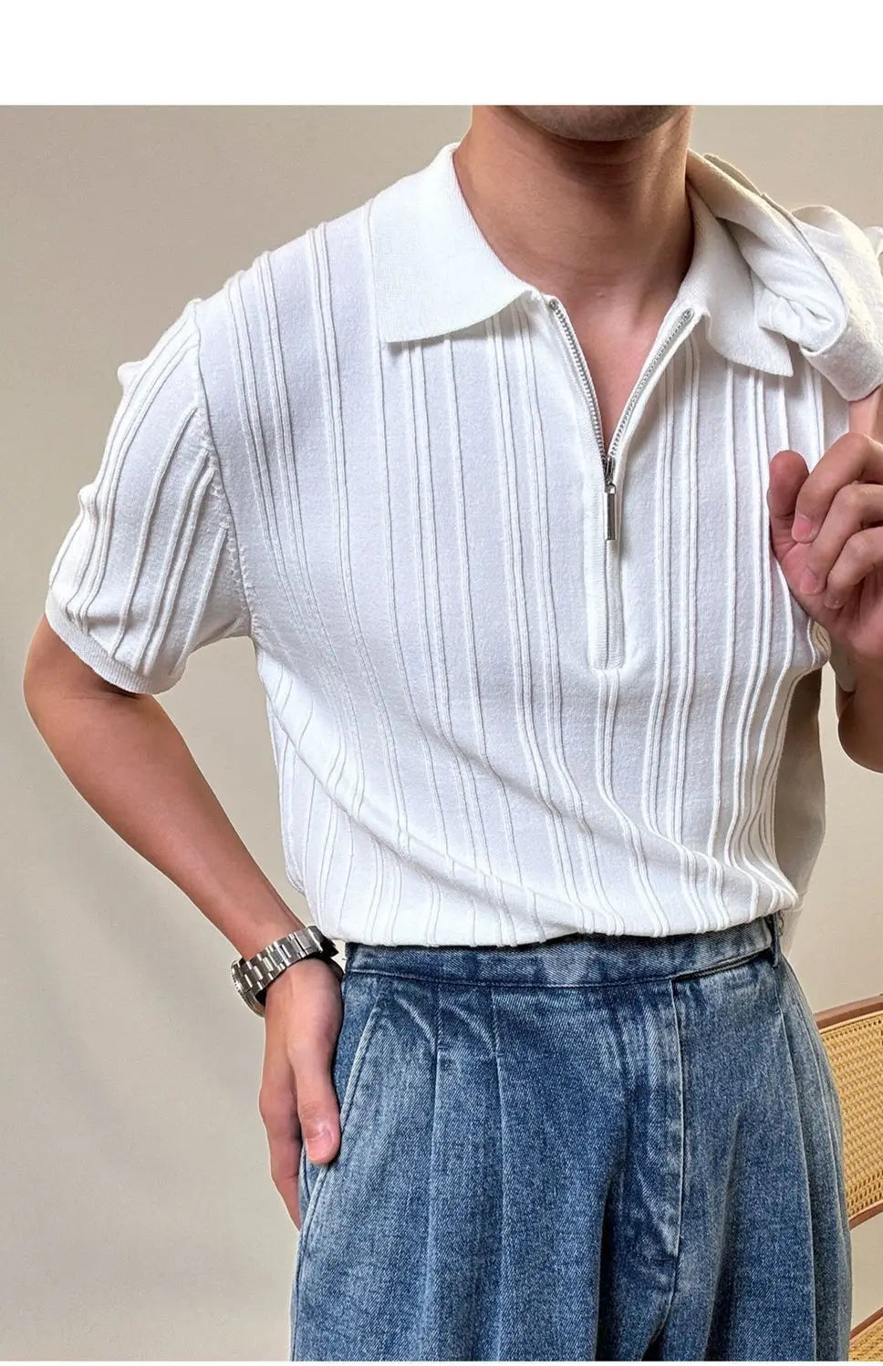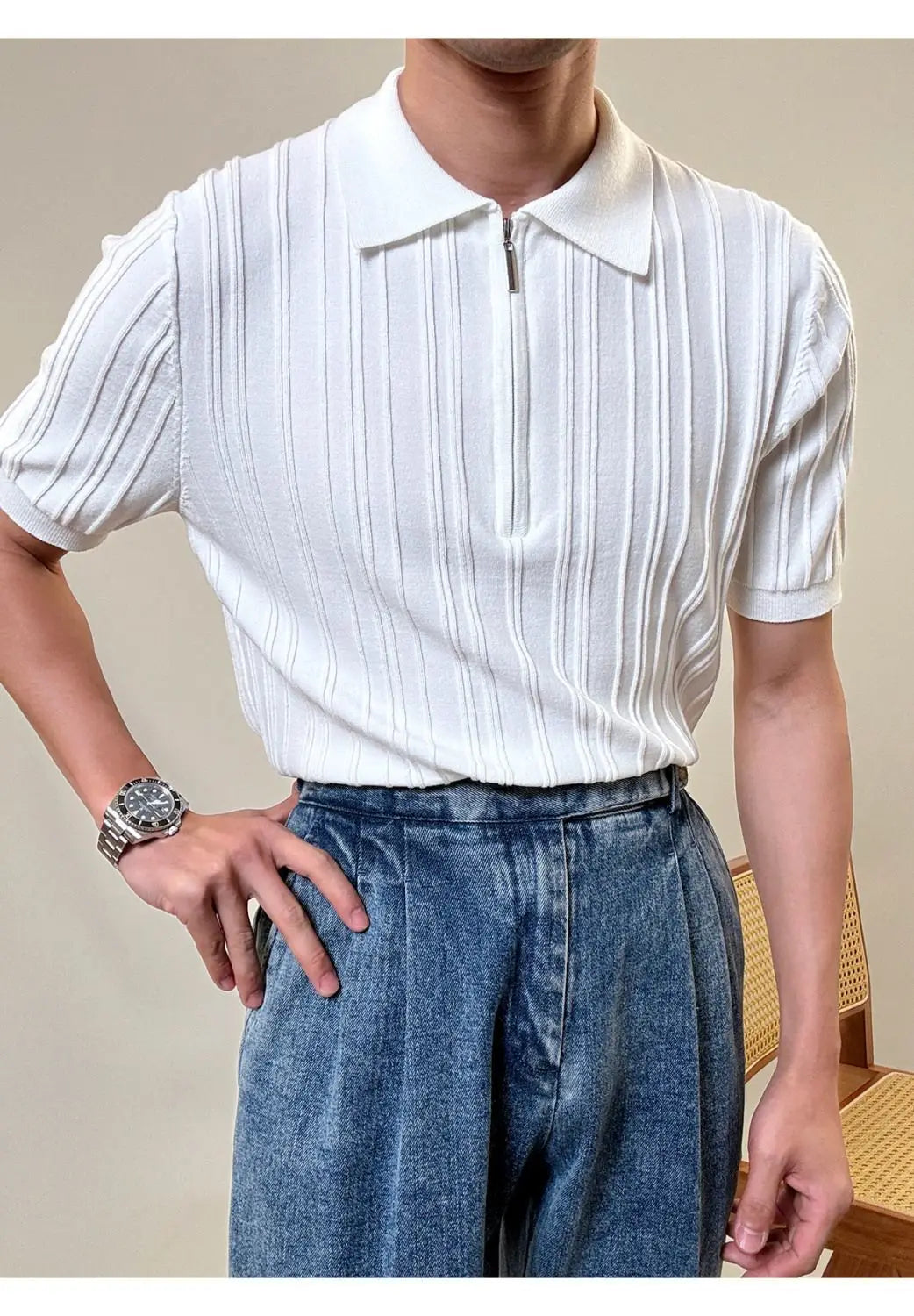 Zipper Knitted Short-sleeved Polo Shirt Men Summer American Retro Commuting Loose Vertical Striped Pit Strip Lapel T-shirt Men