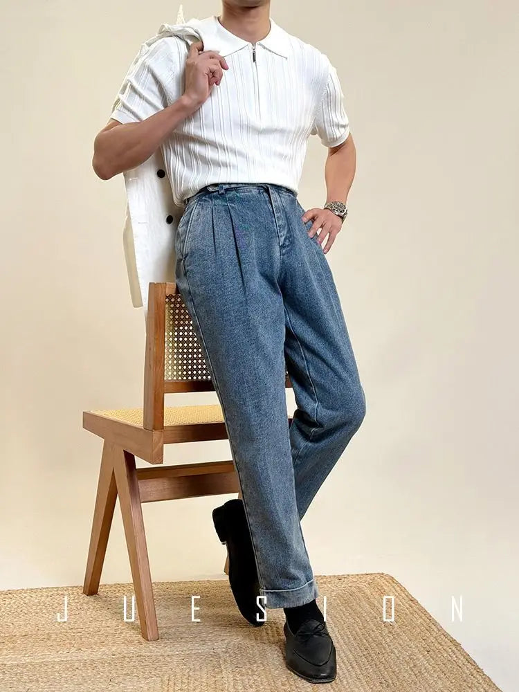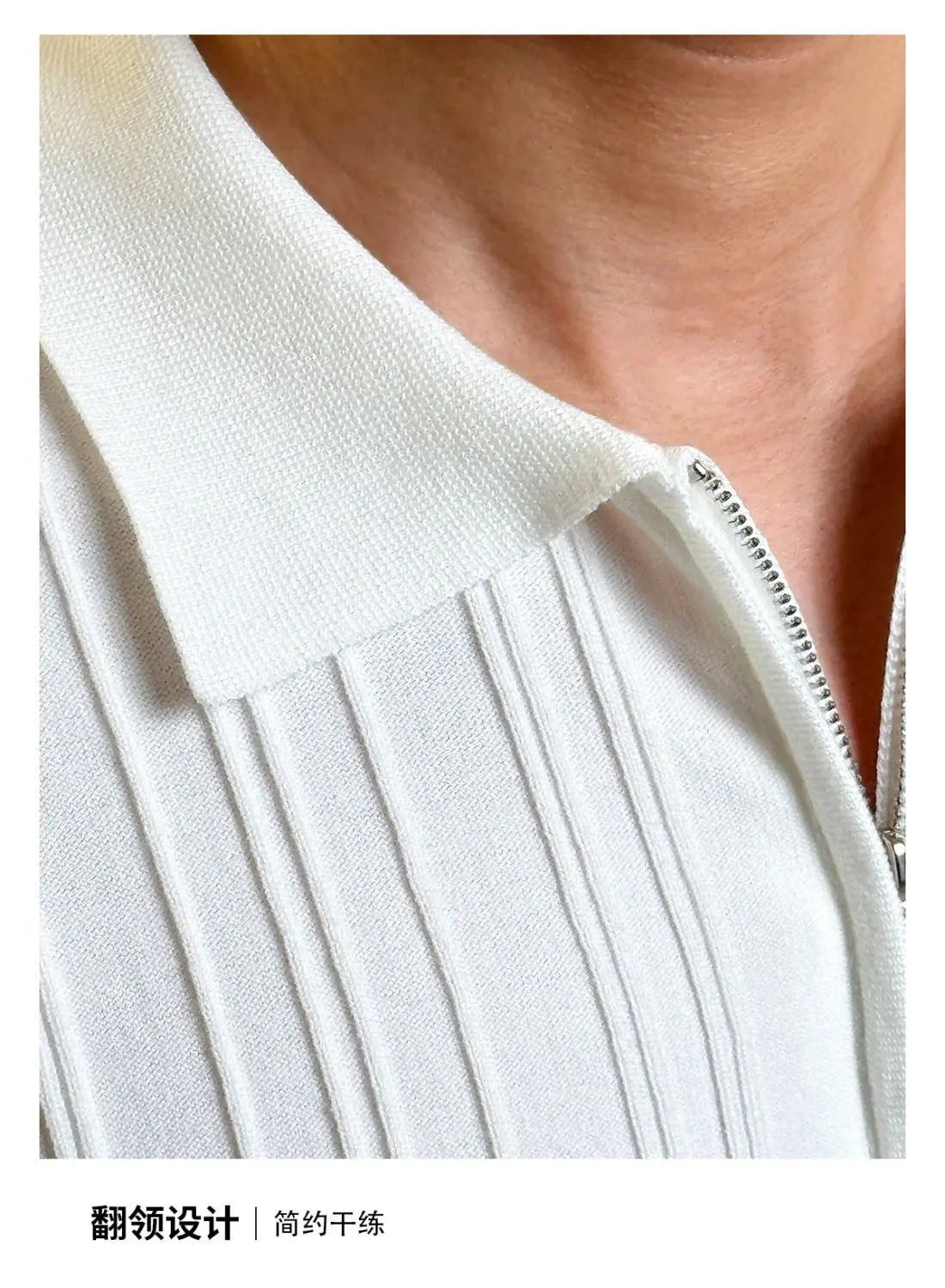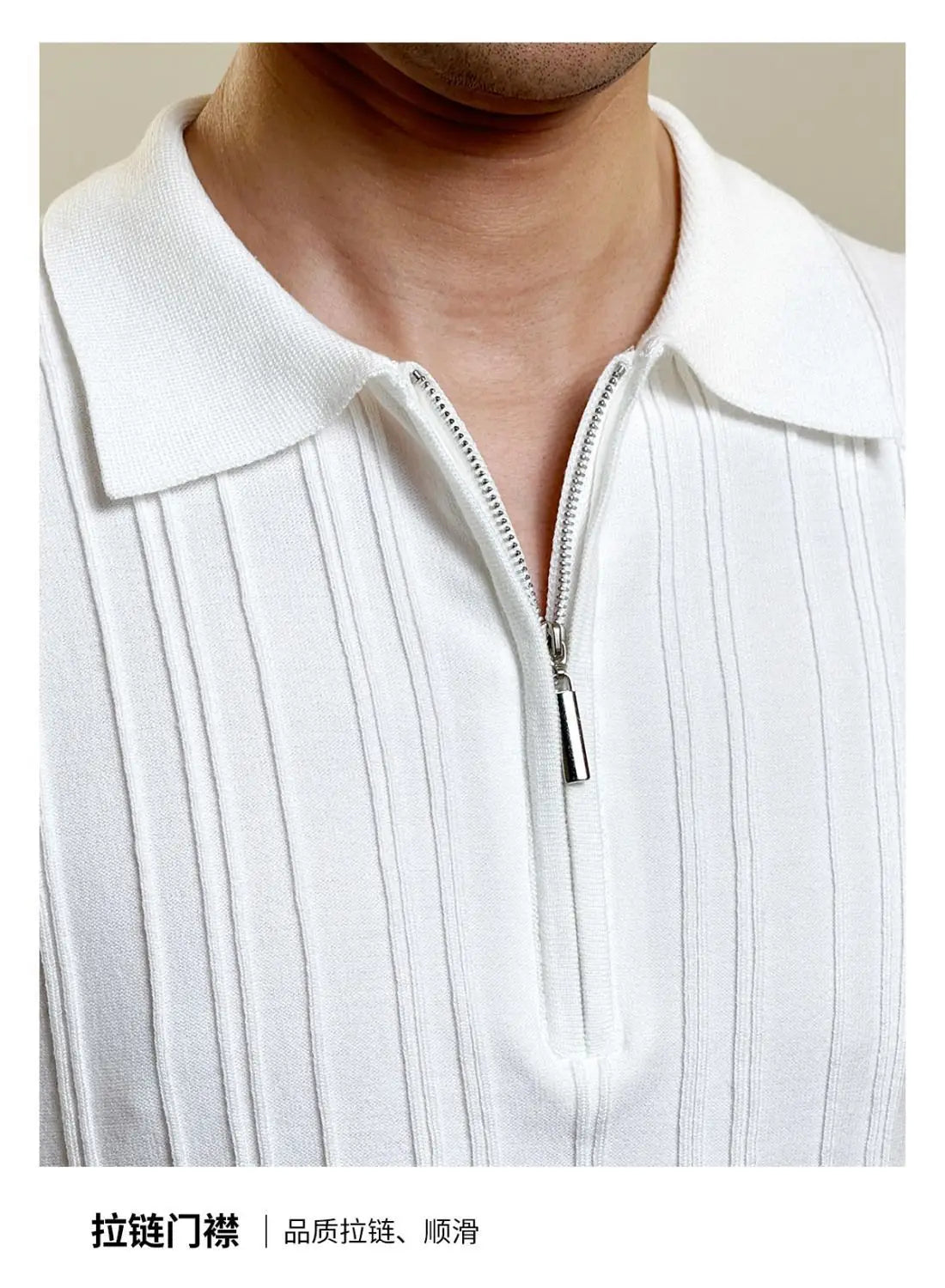 Zipper Knitted Short-sleeved Polo Shirt Men Summer American Retro Commuting Loose Vertical Striped Pit Strip Lapel T-shirt Men
