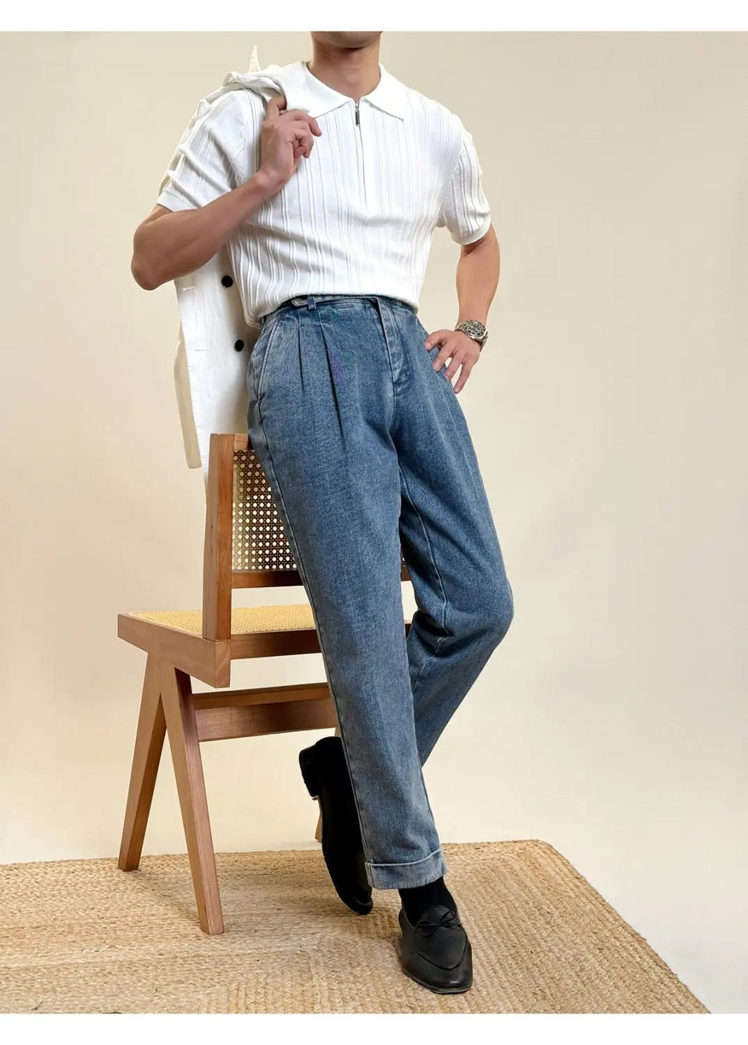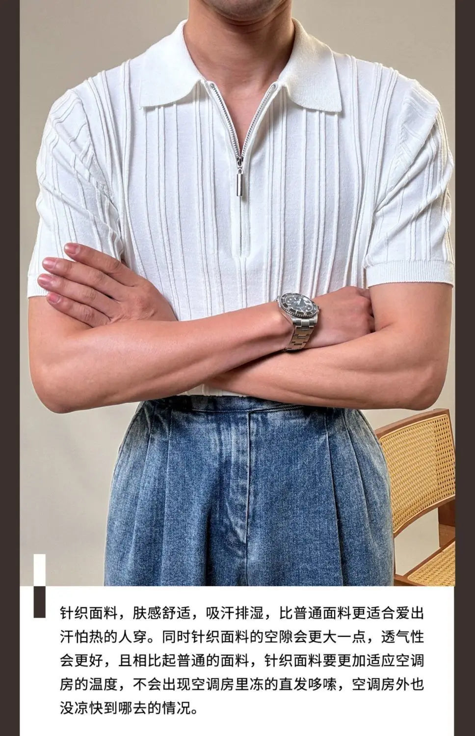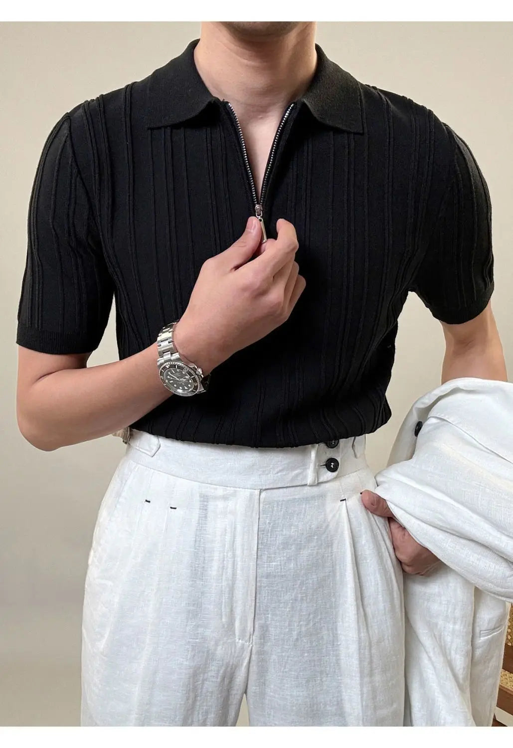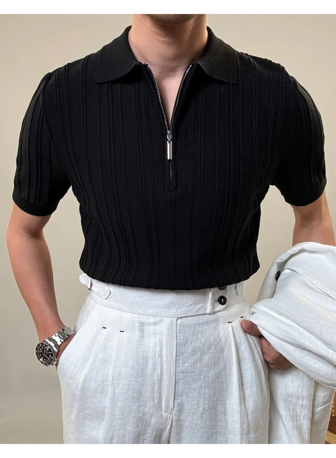 Zipper Knitted Short-sleeved Polo Shirt Men Summer American Retro Commuting Loose Vertical Striped Pit Strip Lapel T-shirt Men