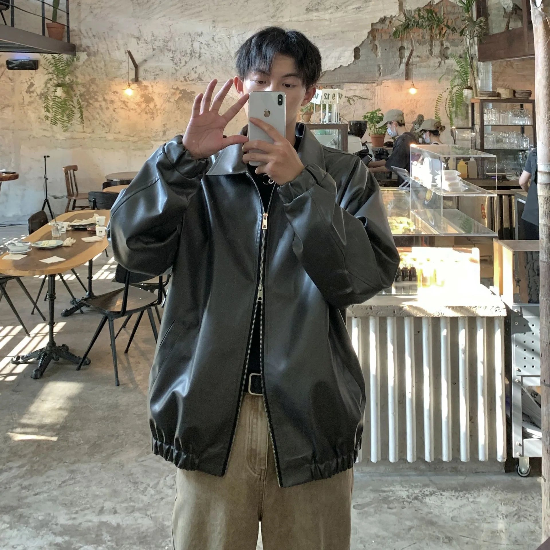 Men's Casual Texture PU Leather Jacket High Street Zipper Turn-down Collar Solid Color Long Sleeve Retro Coat Autumn M-3XL