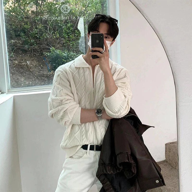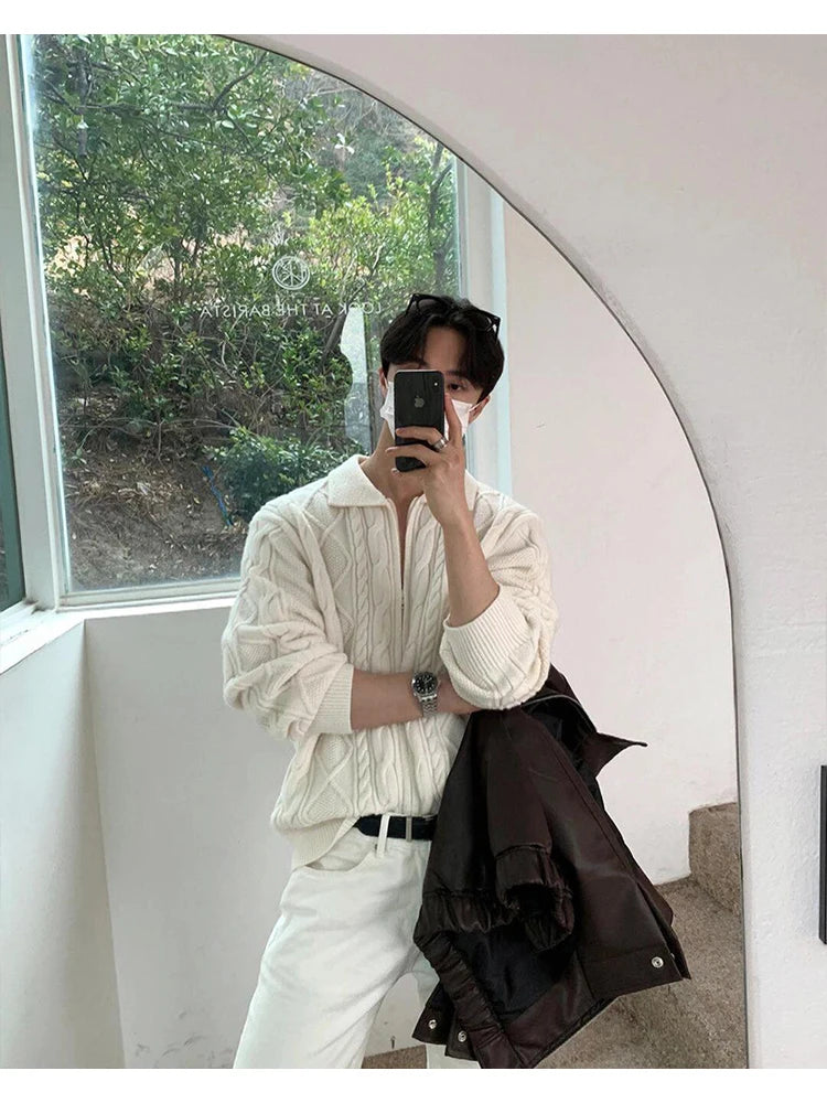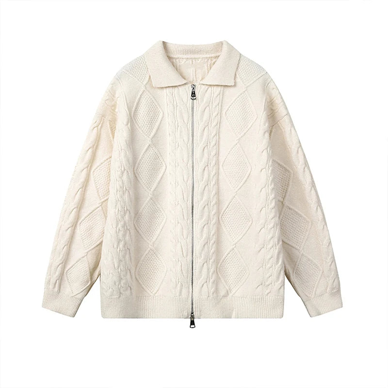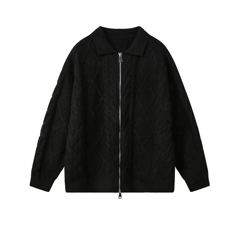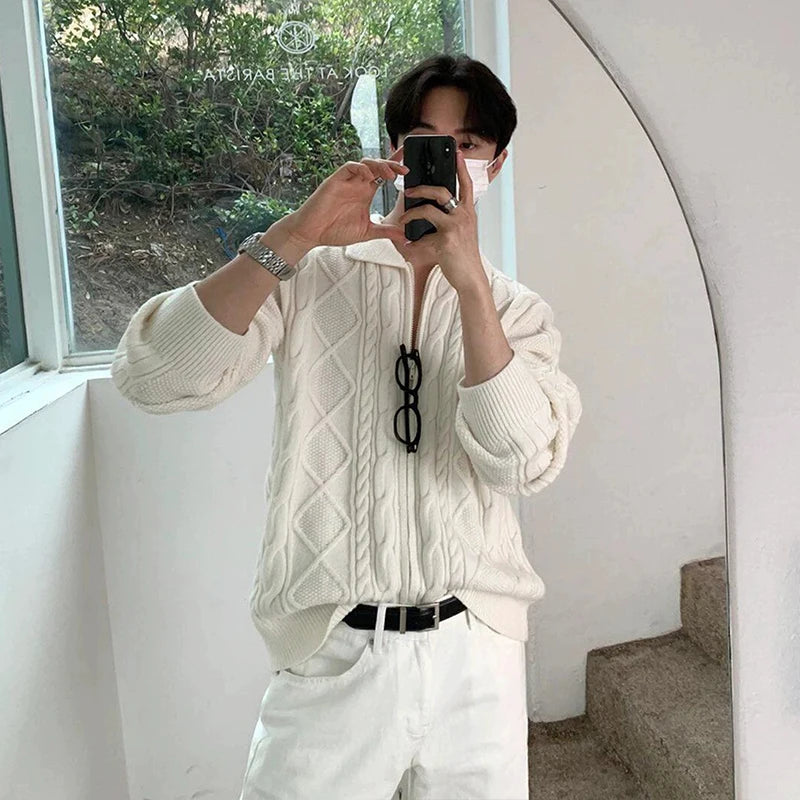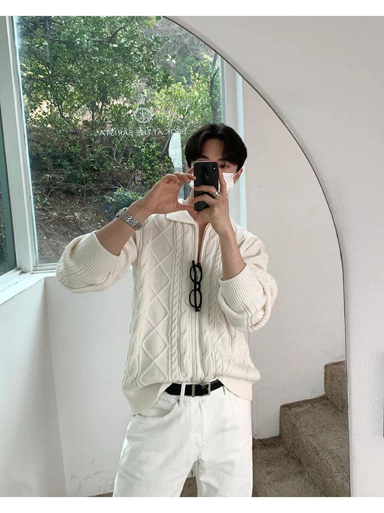 Diamond Graphics Textured Twist Zipper Men Cardigan Light Luxury Lapel Long Sleeve Sweater Coats Premium Quality Knitted Jackets