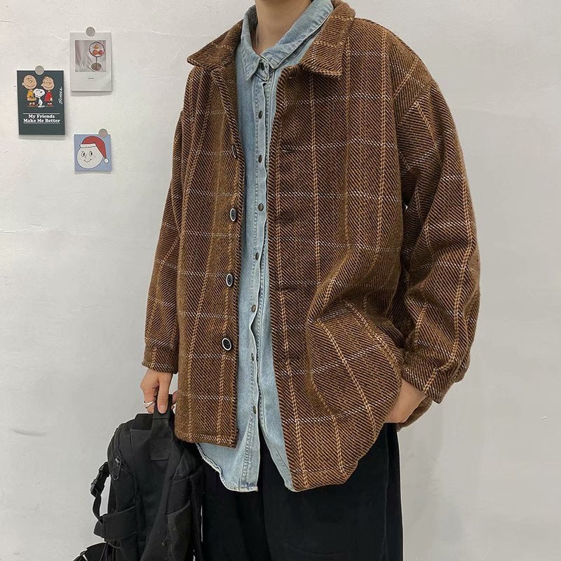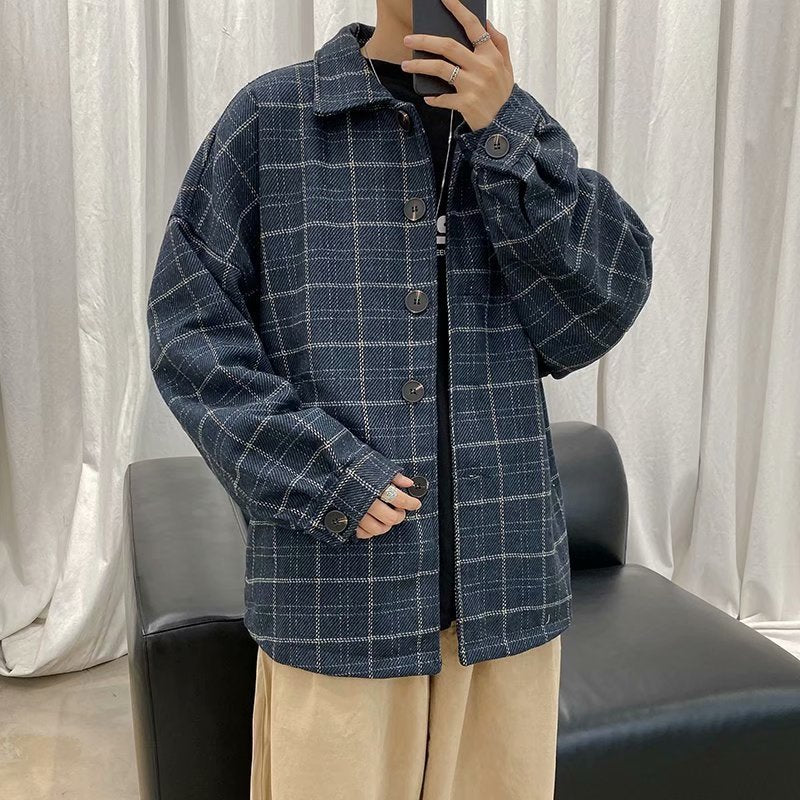 grunge outfits Autumn and Winter Plaid Woolen Coat Men's Loose Korean Style Trendy Ins Woolen Coat Retro Hong Kong Trendy
