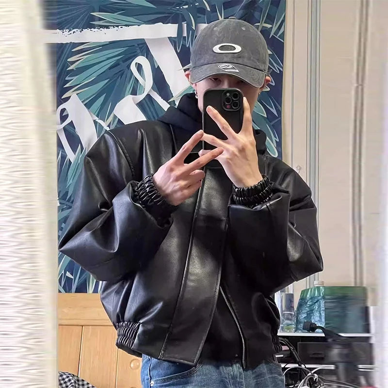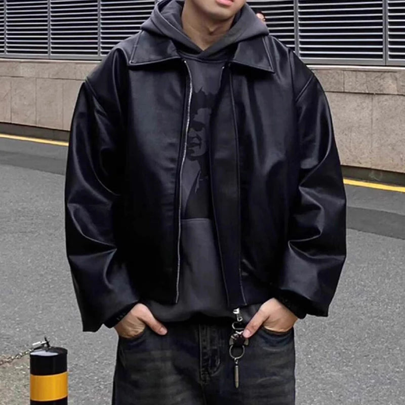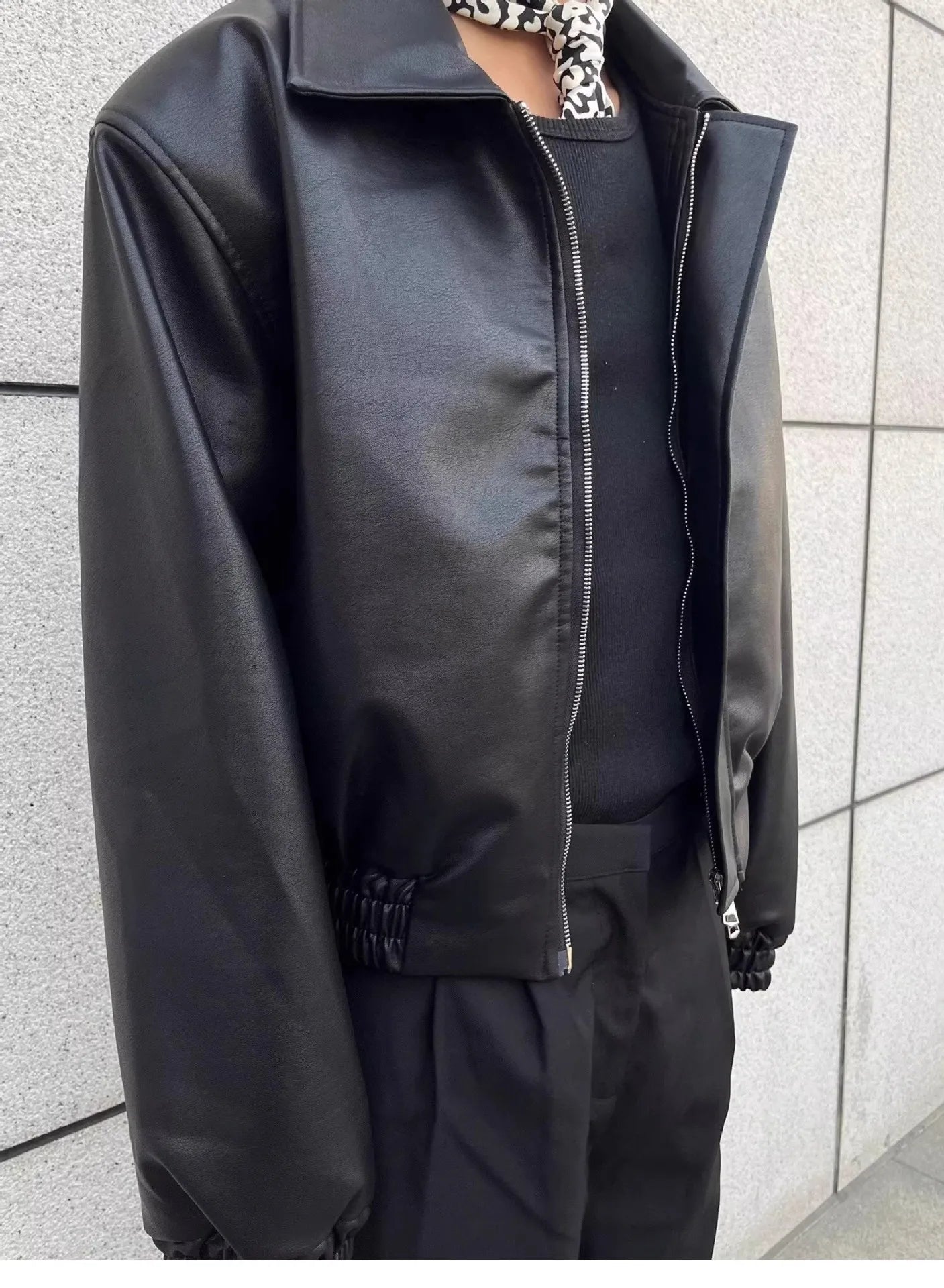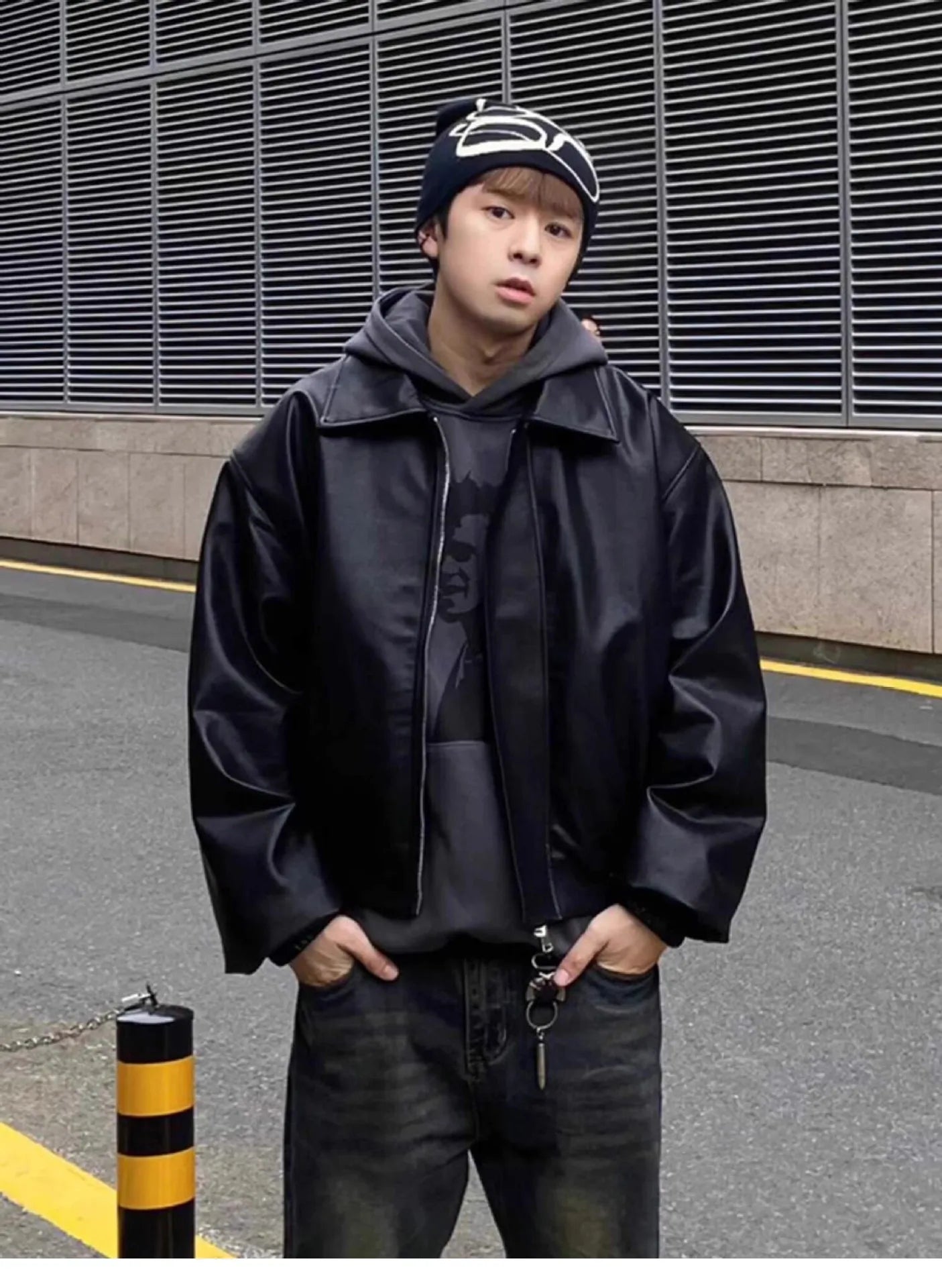 High Street Trendy PU Leather Crop Jacket Casual Textured Locomotive Zipper Turn-down Collar Solid Color Long Sleeve Men's Coats