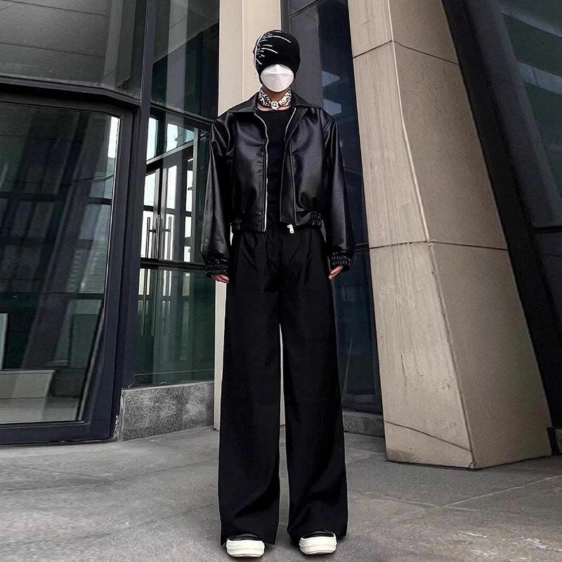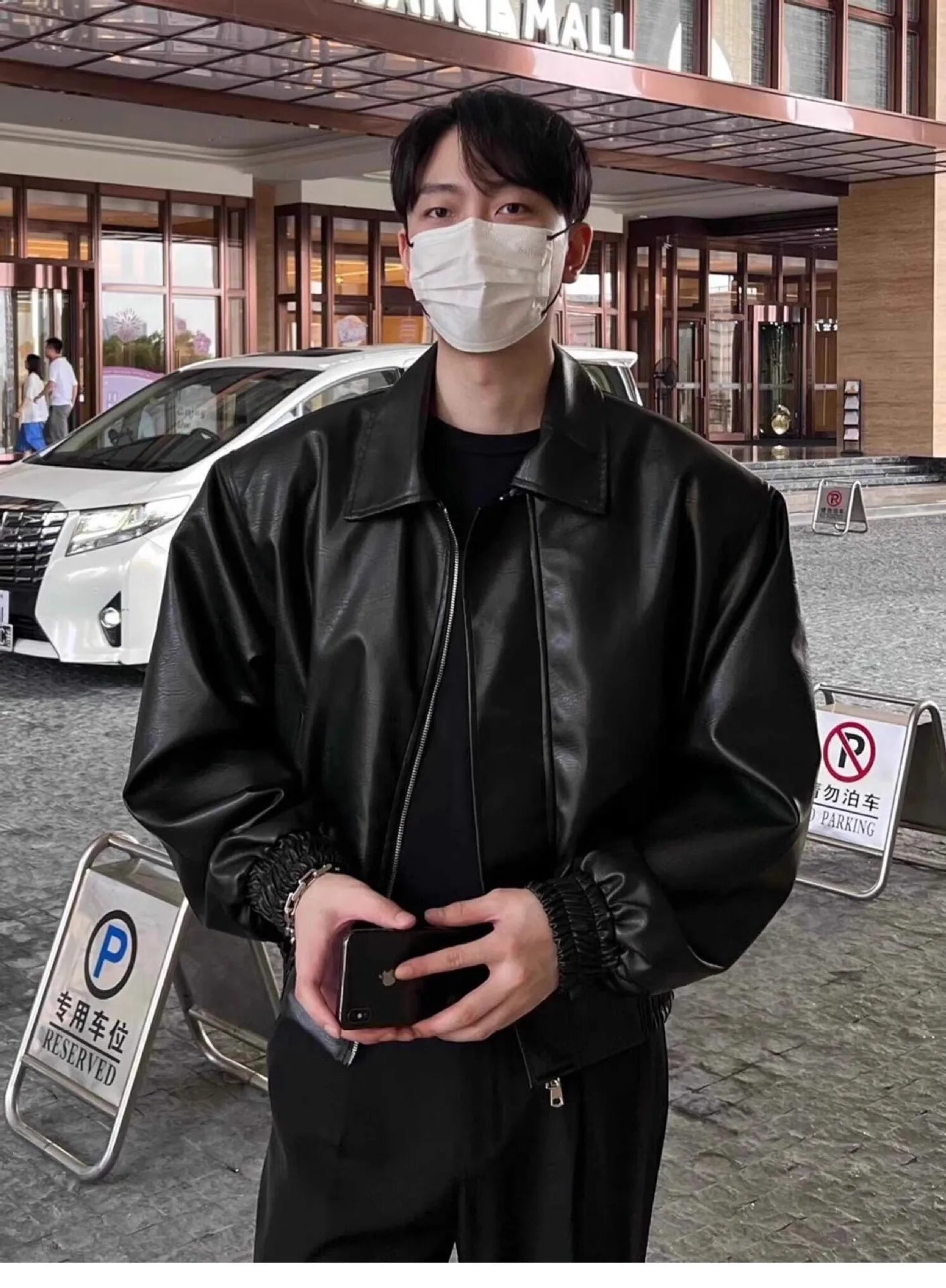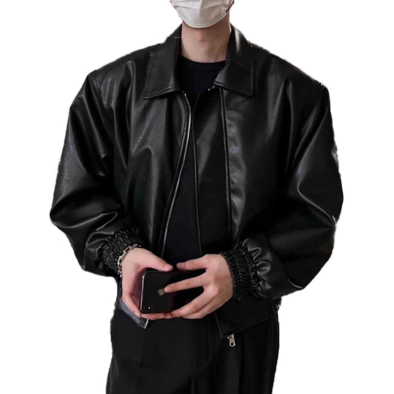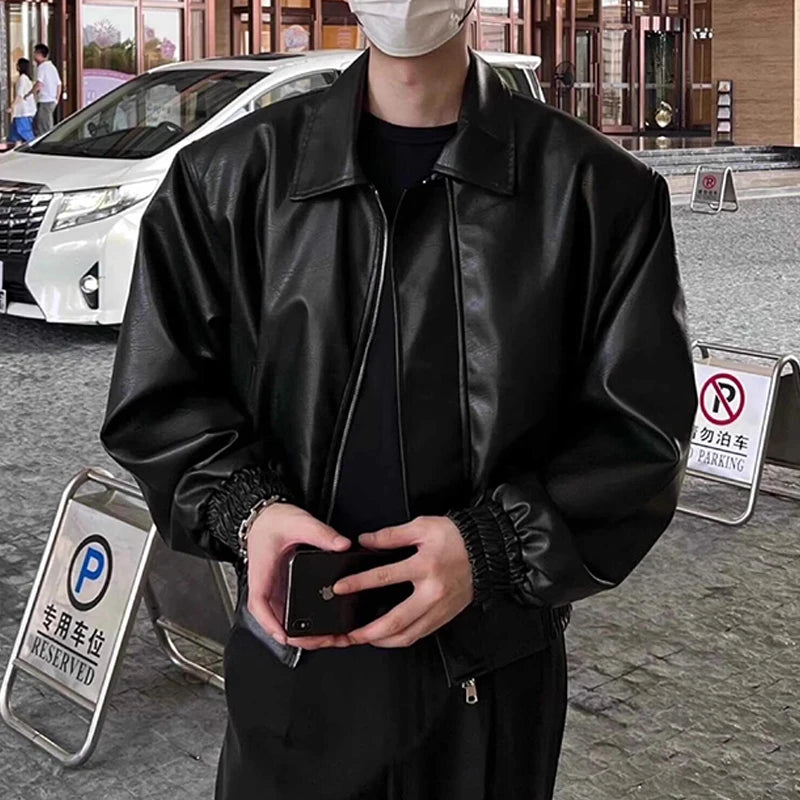 High Street Trendy PU Leather Crop Jacket Casual Textured Locomotive Zipper Turn-down Collar Solid Color Long Sleeve Men's Coats