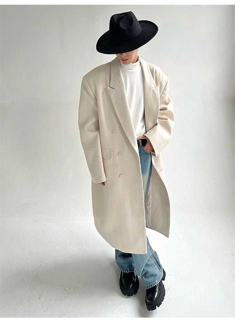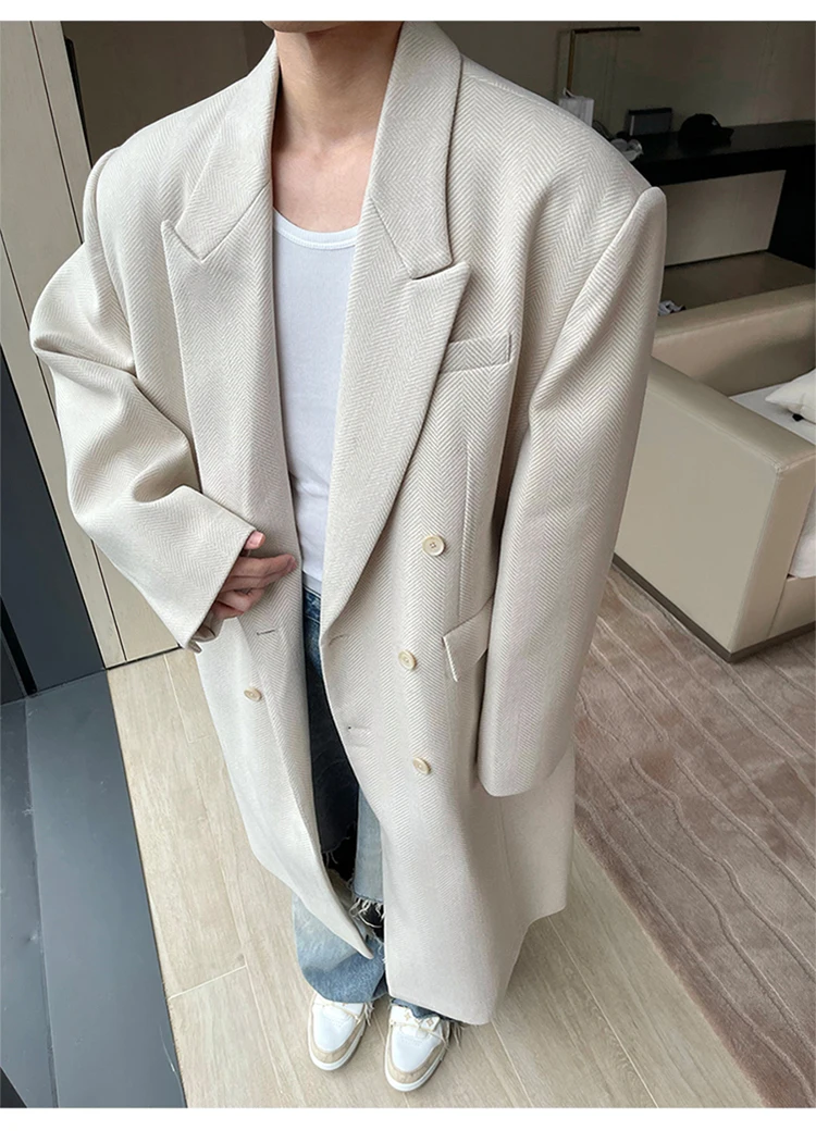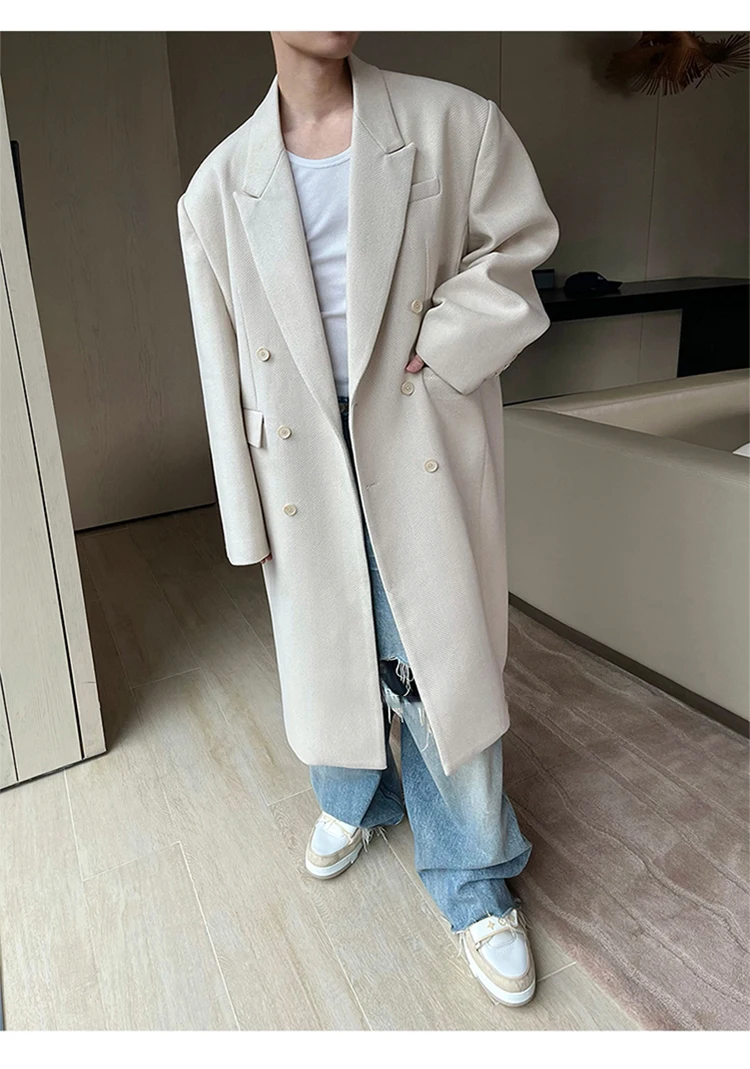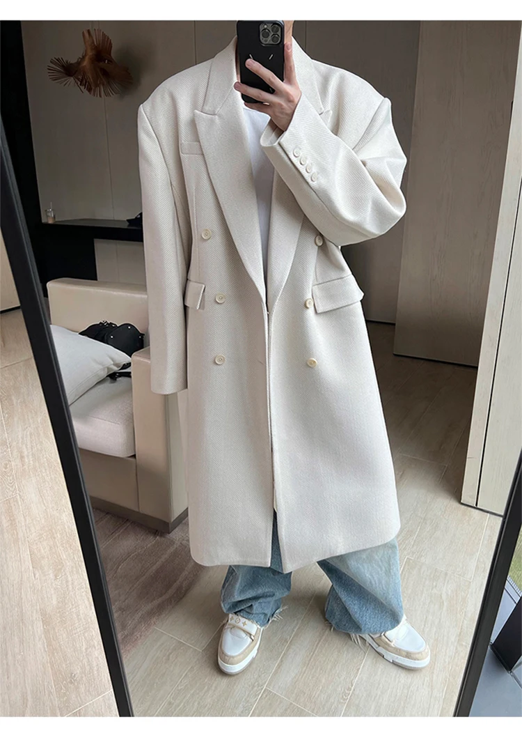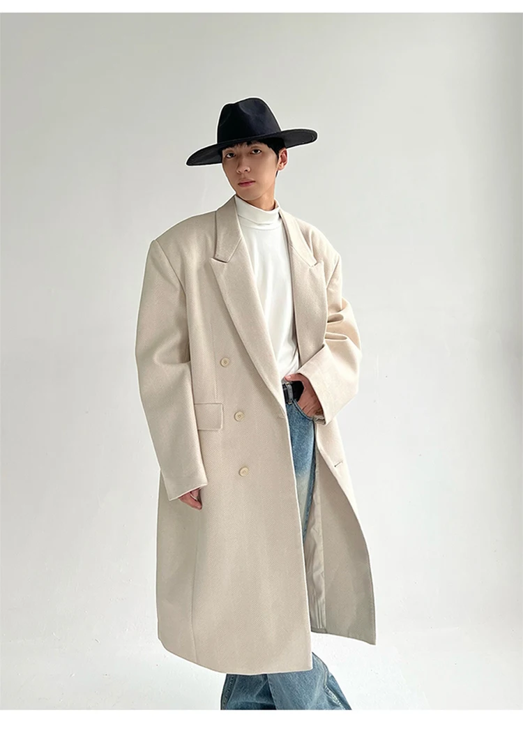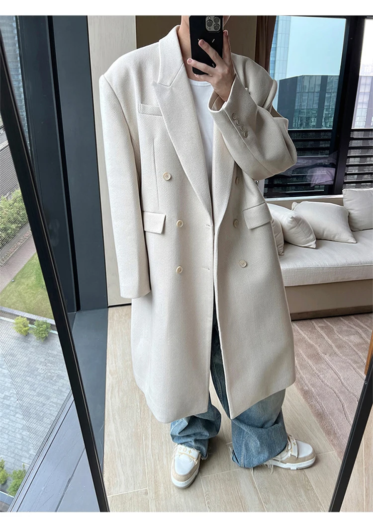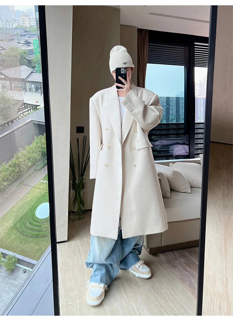 Autumn Winter Long Beige Oversized Thick Warm Soft Wool & Blends Coat Men Double Breasted Loose Korean Fashion