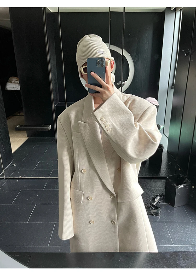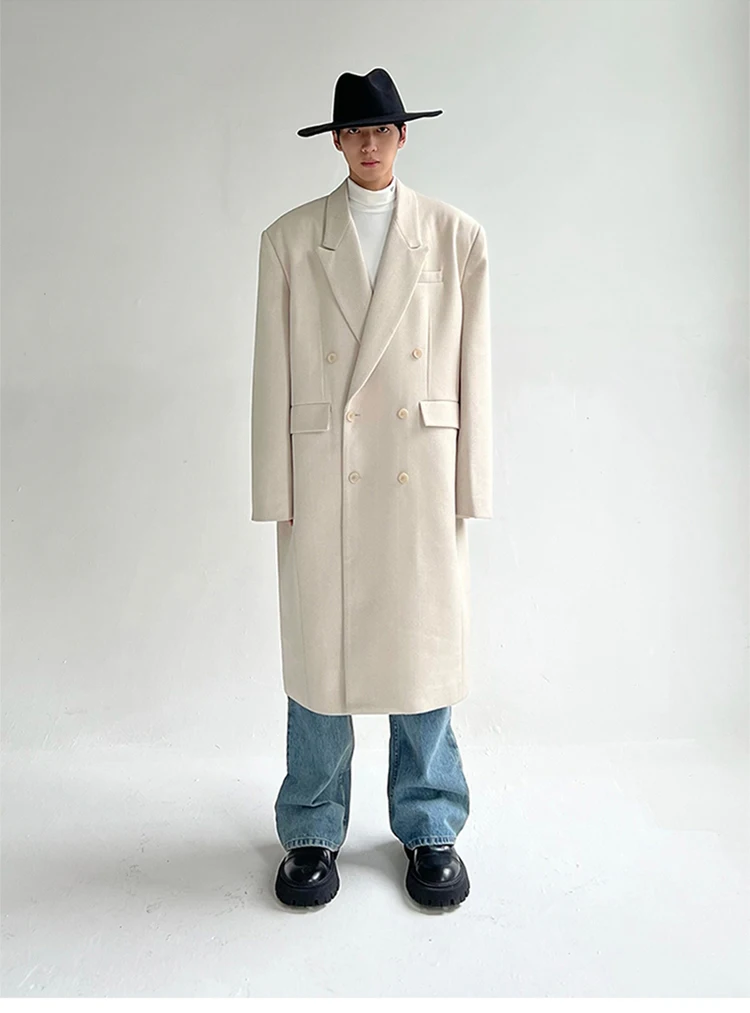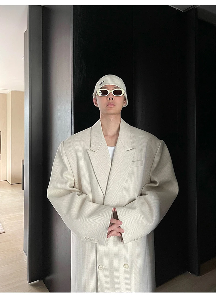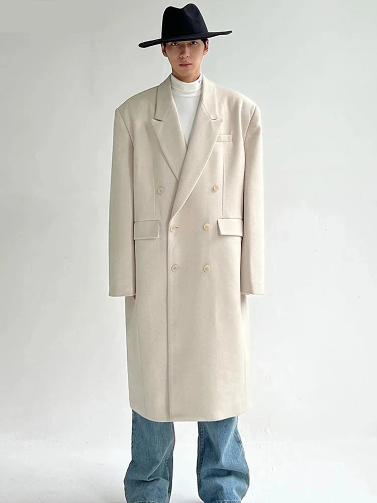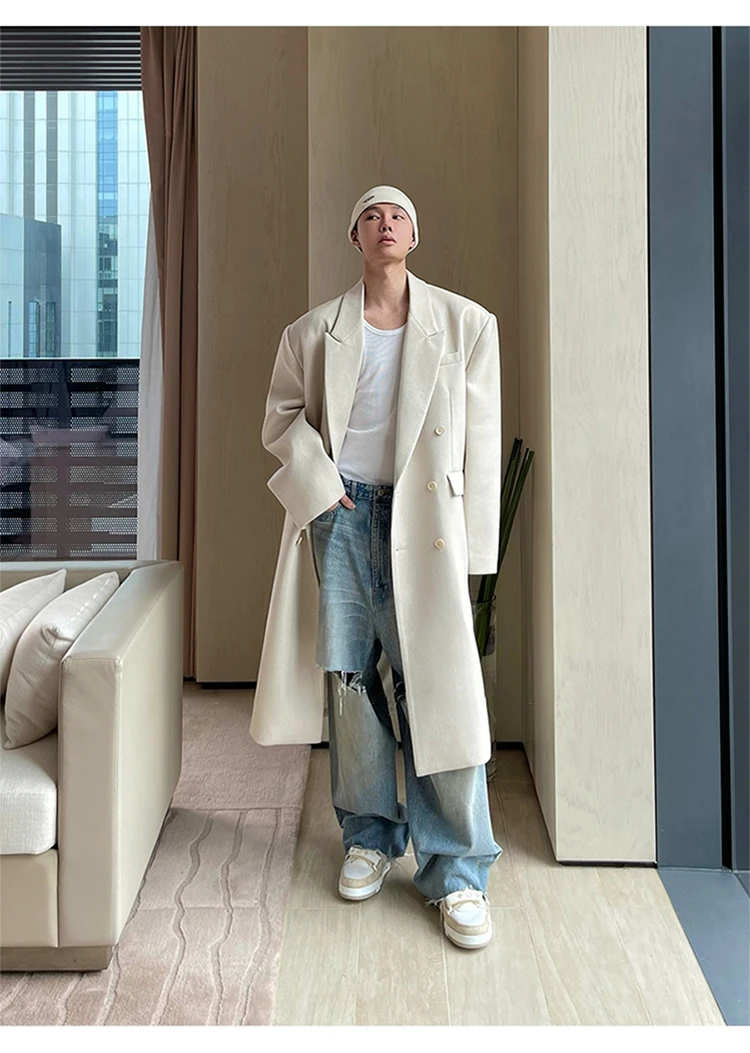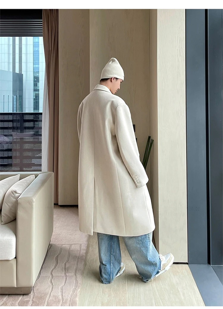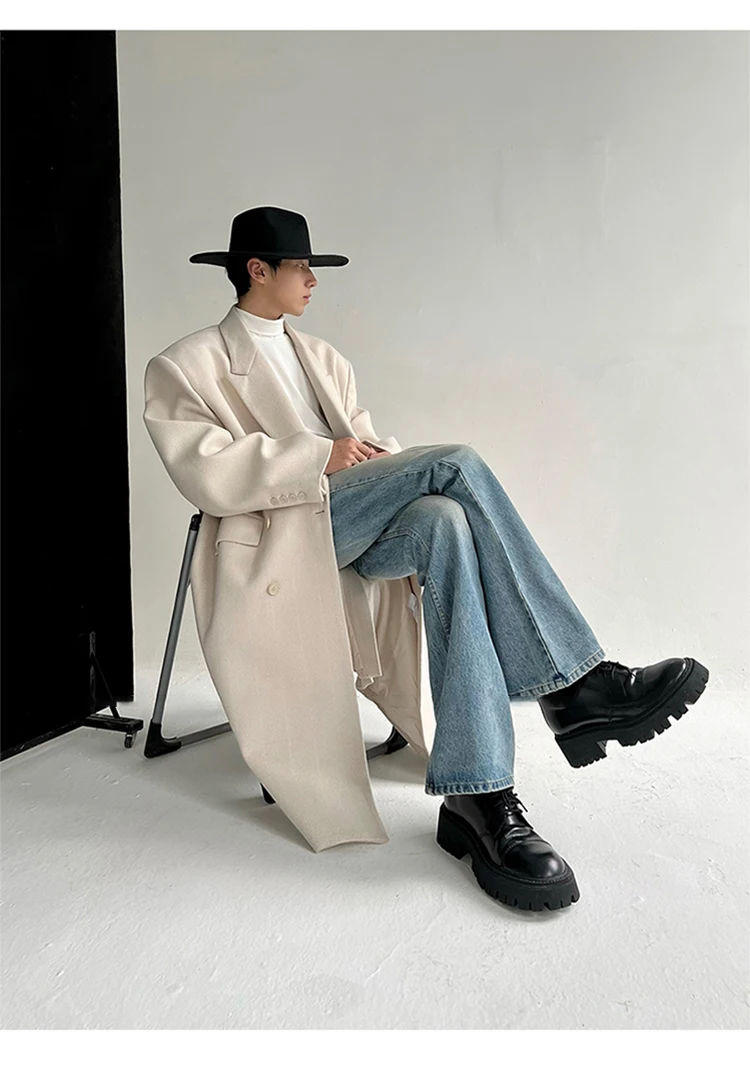 Autumn Winter Long Beige Oversized Thick Warm Soft Wool & Blends Coat Men Double Breasted Loose Korean Fashion