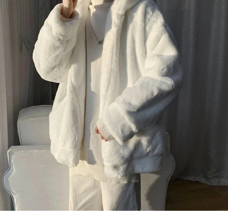 Winter Oversized White Faux Fur Coat Men with Hood Long Sleeve Zipper Casual Loose Fluffy Jacket for Men Style