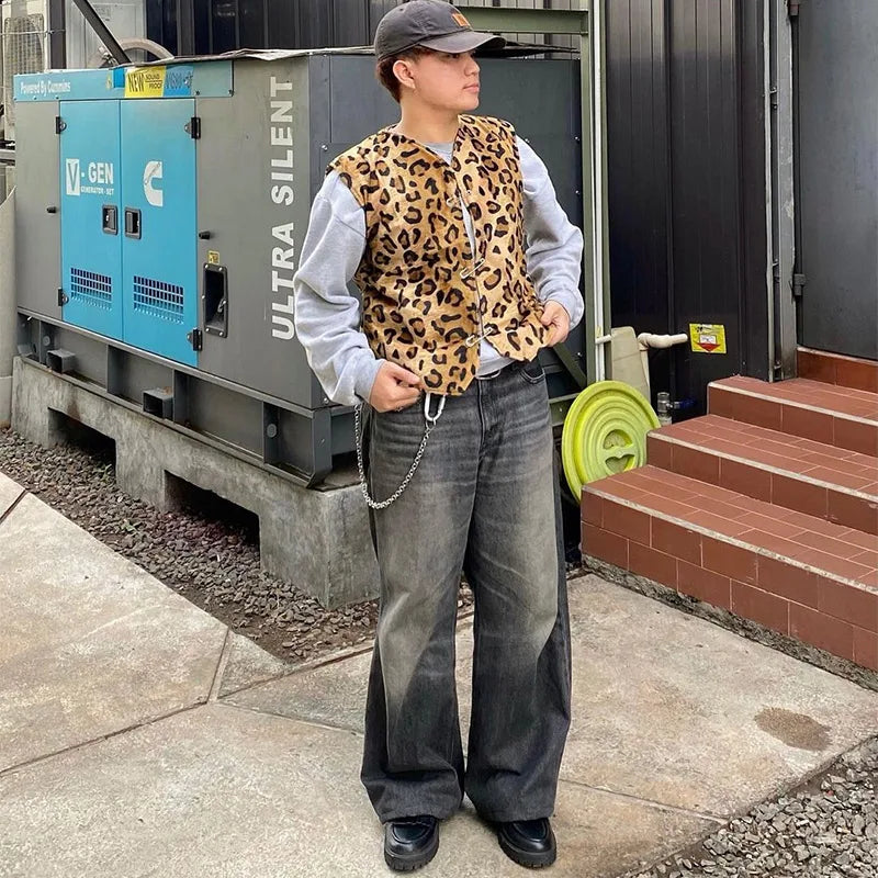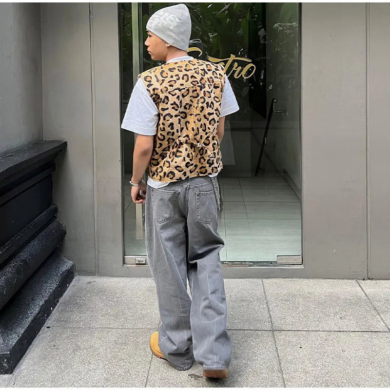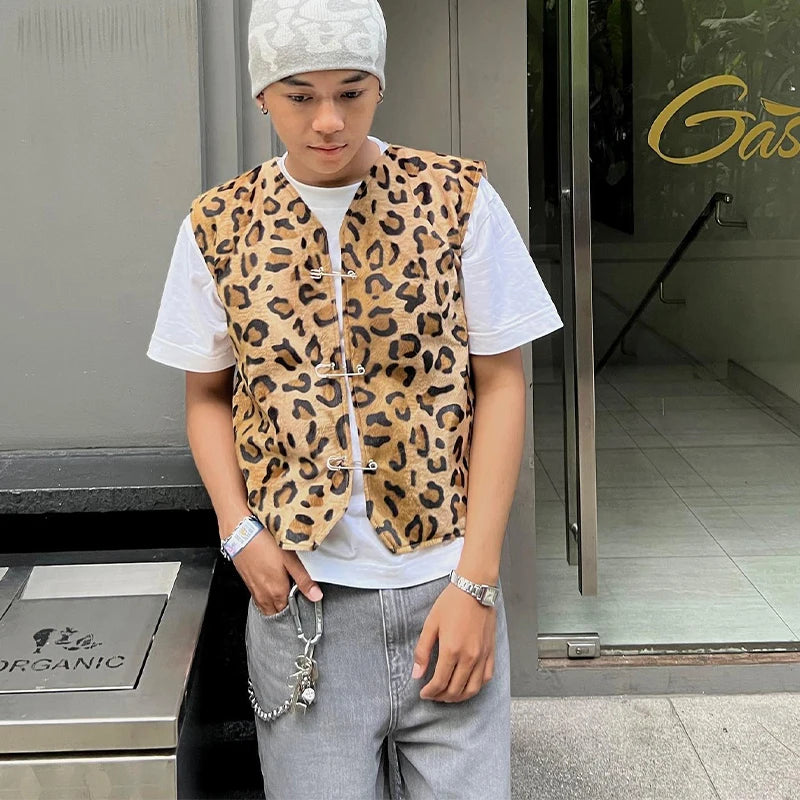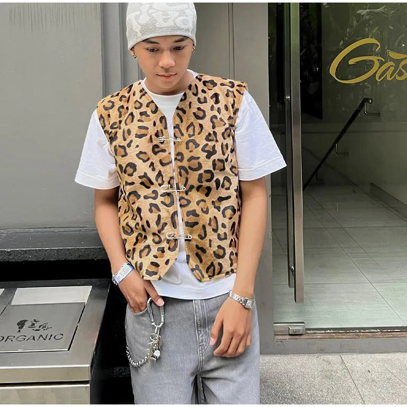 Men Leopard Print Vests Spring Fashion V-neck Paper Clip Simple Sleeveless Loose Simple Casual Streetwear Male Waistcoats