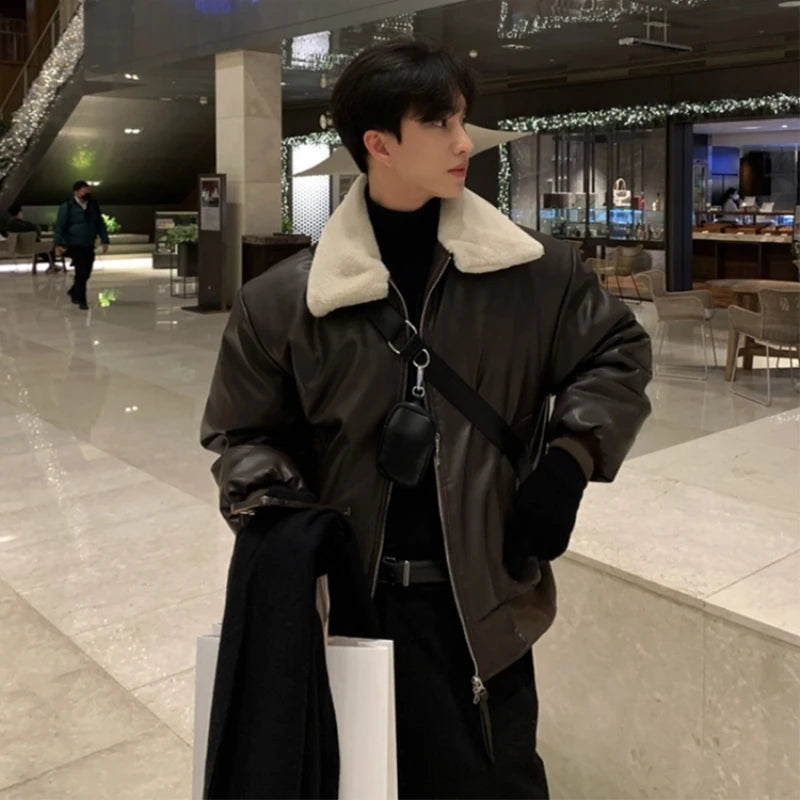 Winter Jacket Men Warm Fashion Casual Thickened Leather Jacket Men Streetwear Korean Loose Short Coat Mens Thick Leather Coat