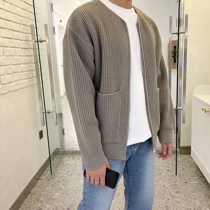 Autumn Zipper-Up Knitted Sweatercoat for Men Solid Casual Slim Baisc Cardigan Hombre Round Neck Pocket Tops Male Outwear