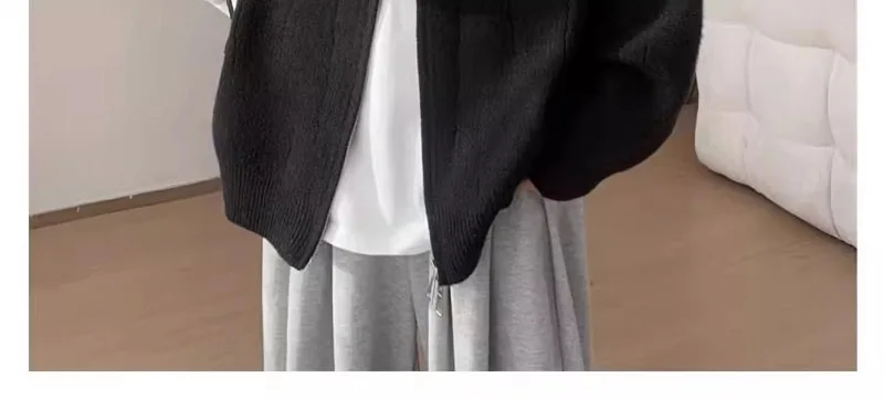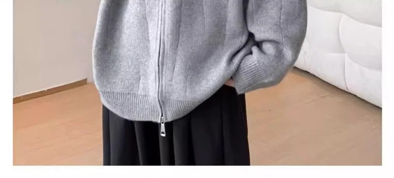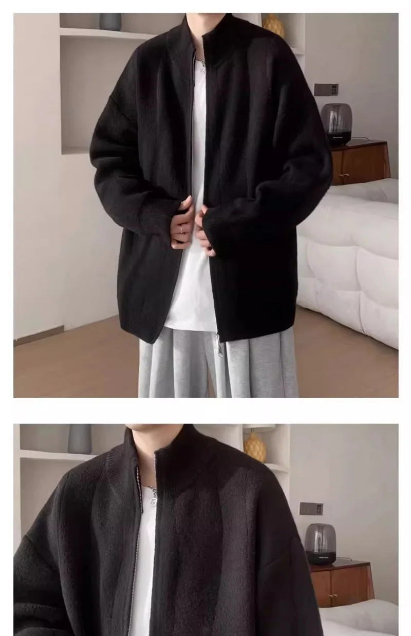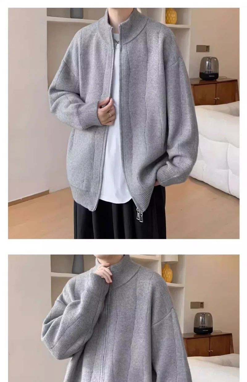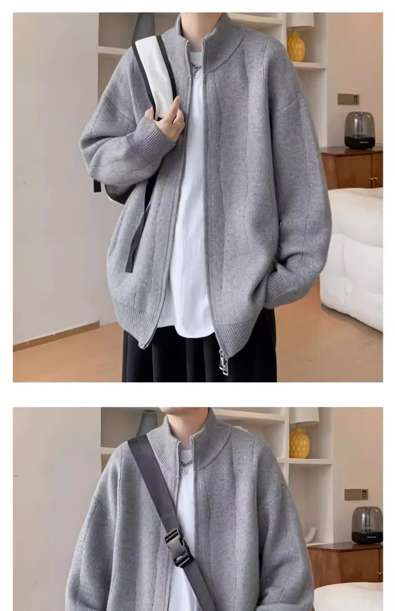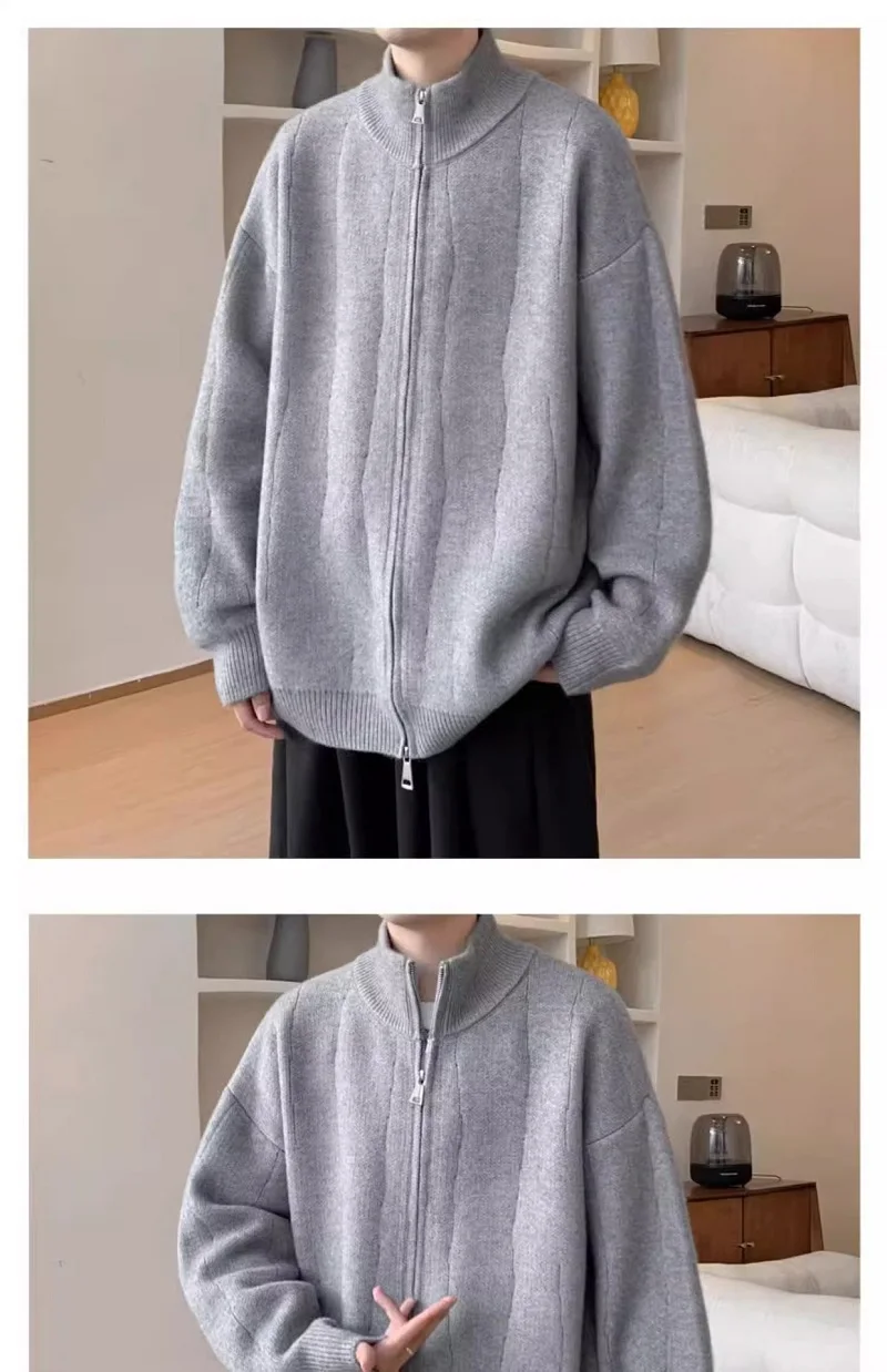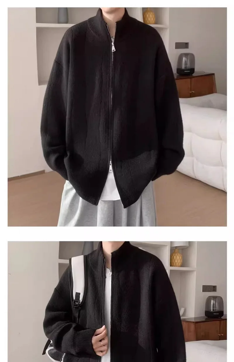 American Double Zipper Cardigan Sweater Men's Spring Autumn Personalized Design Sense Knit Coat Stand Collar Casual Couple Tops