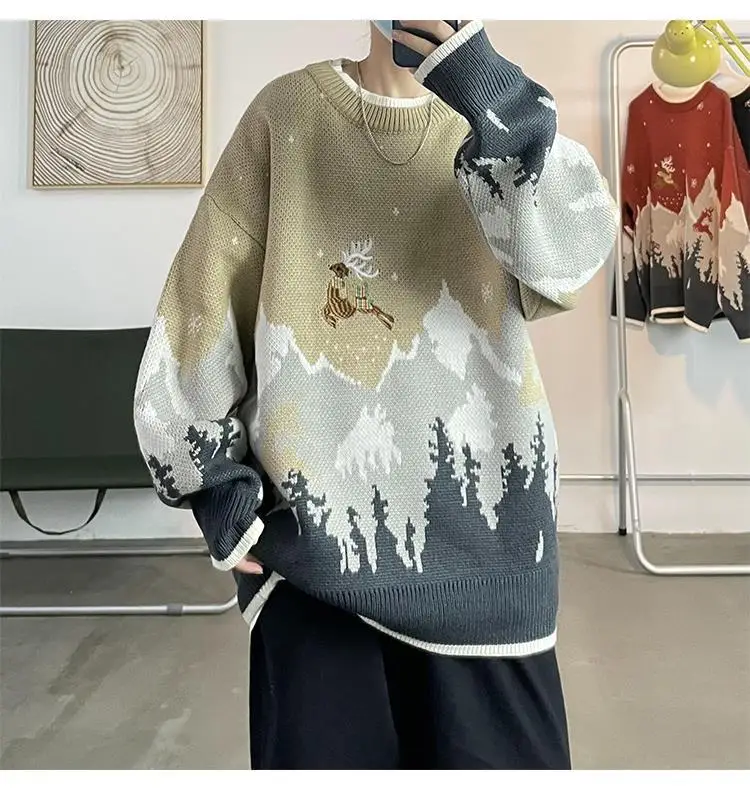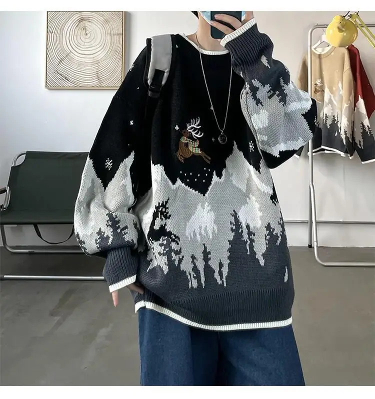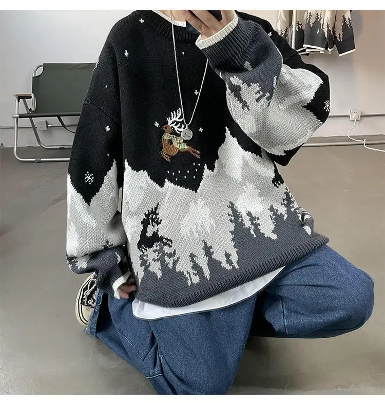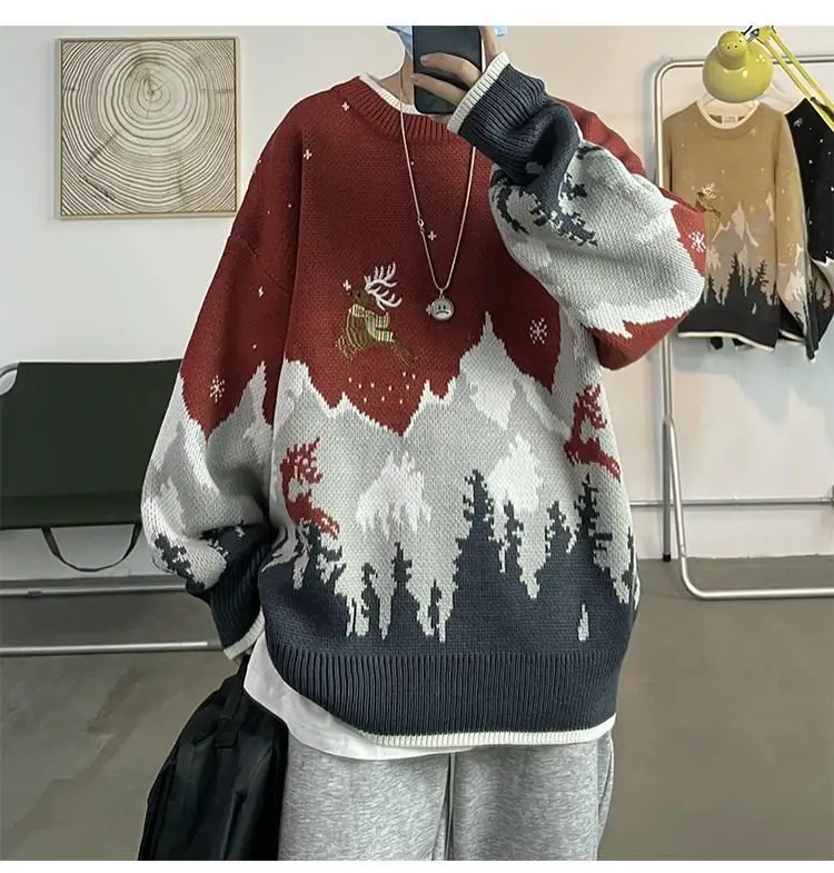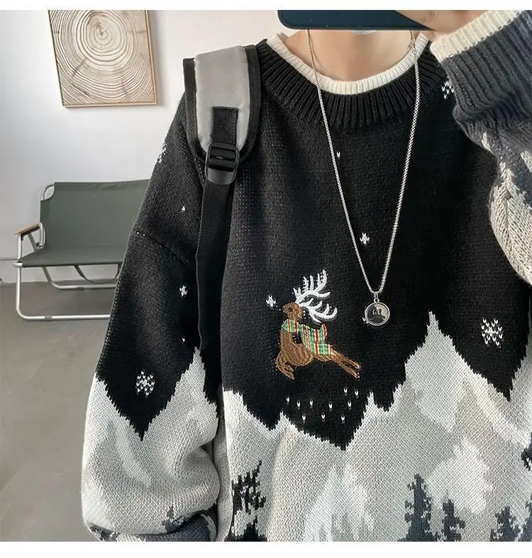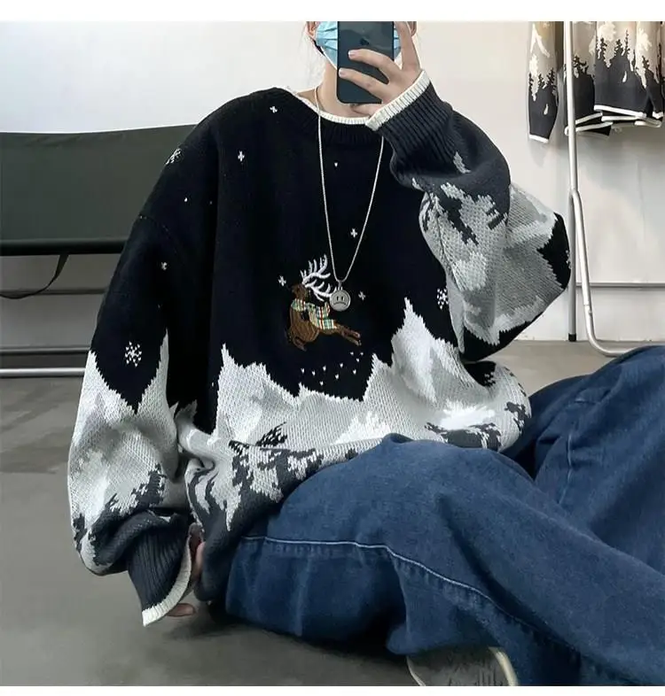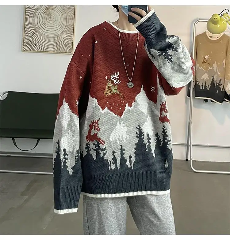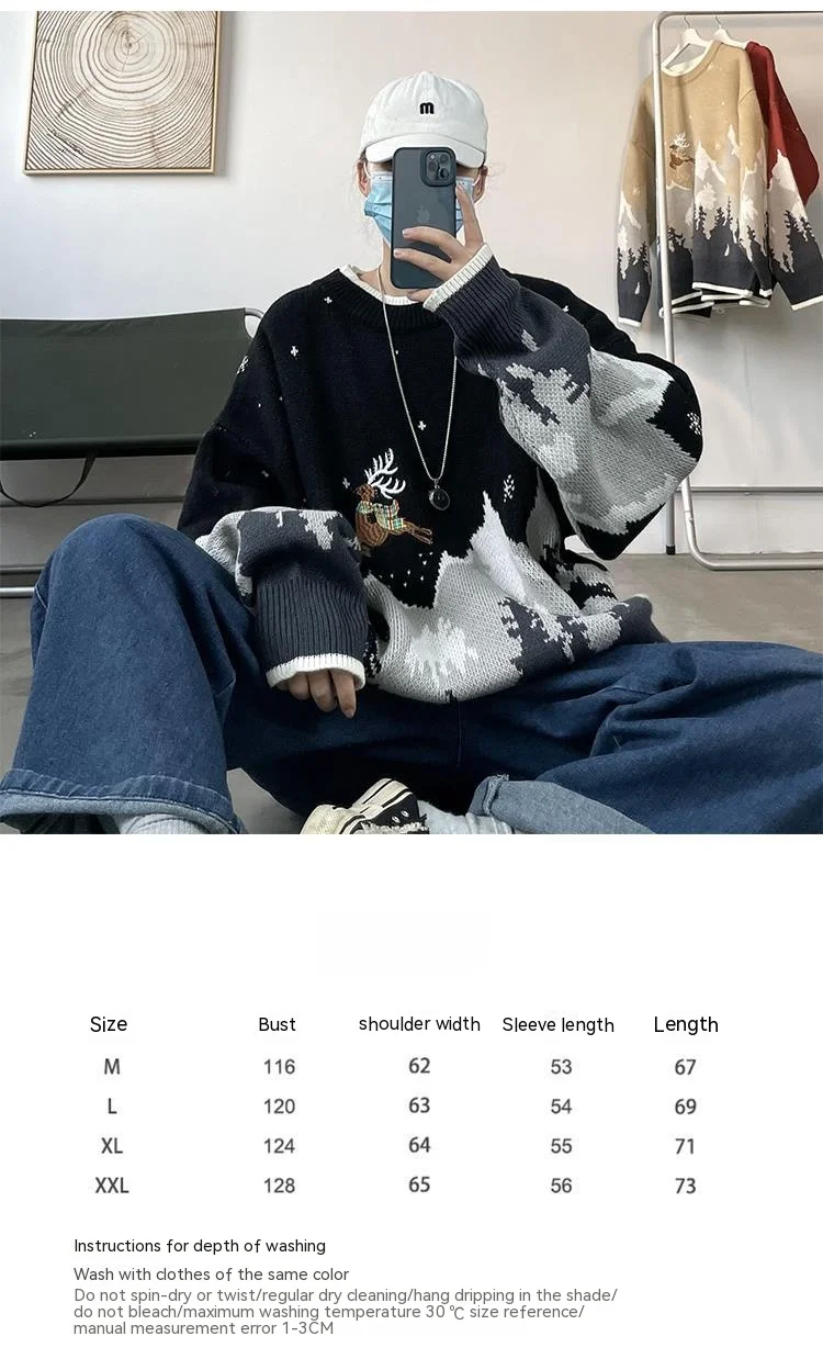 Autumn and winter men's round neck sweater Elk Christmas fashion knit sweater high street retro casual hundred loose pullover