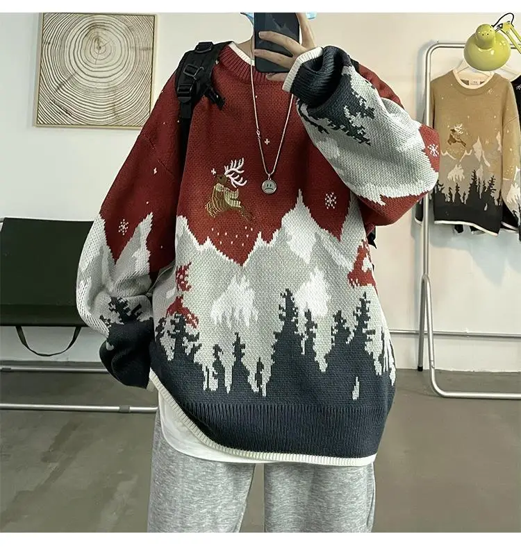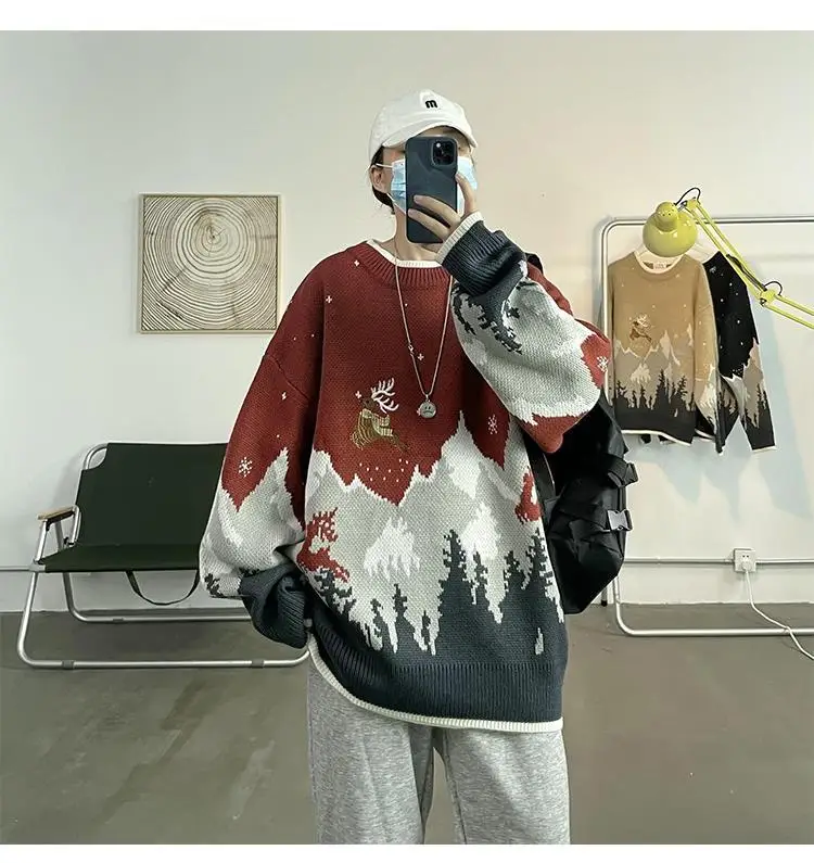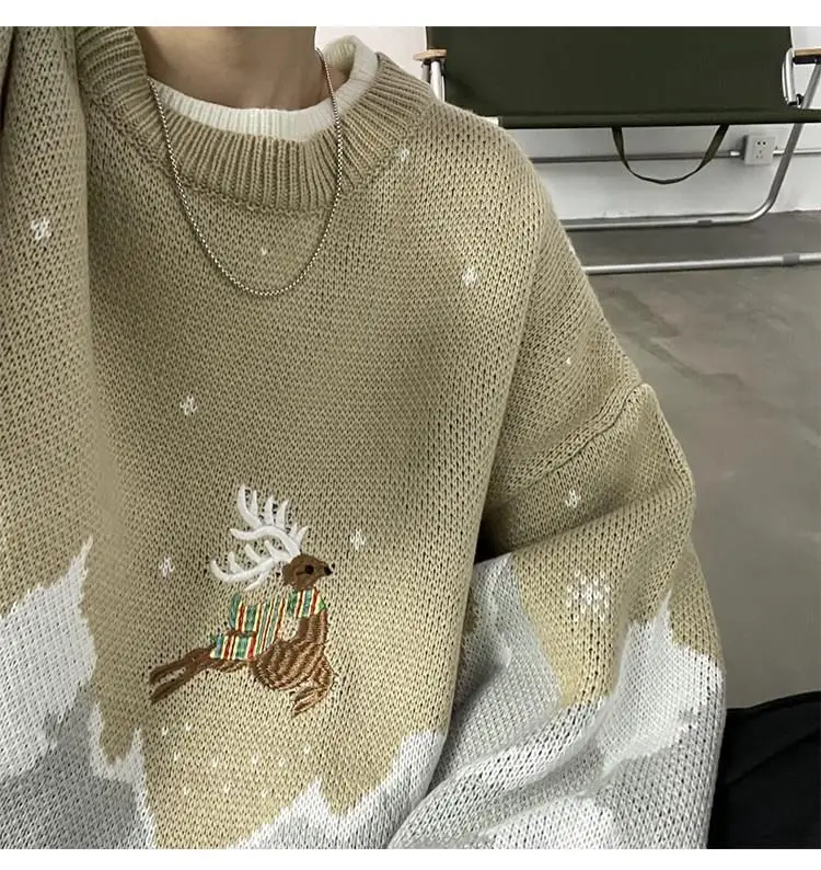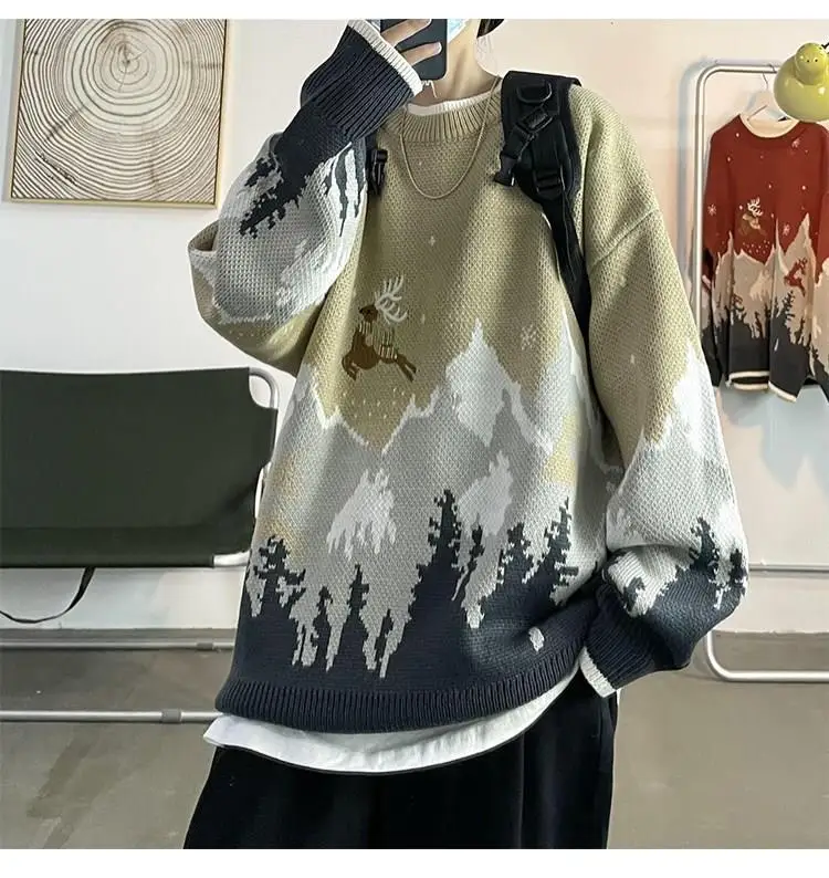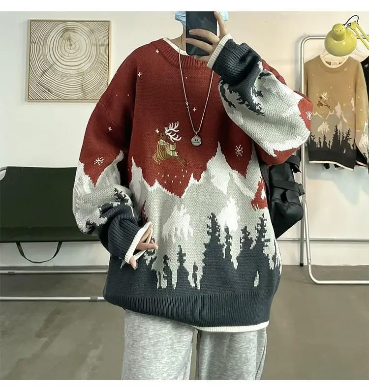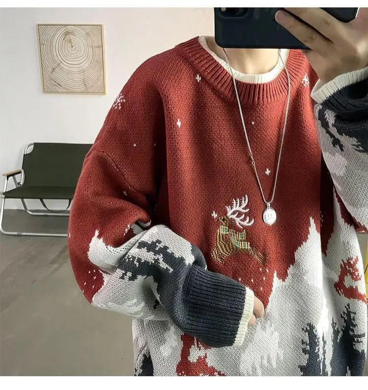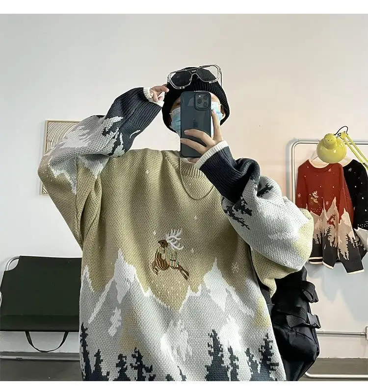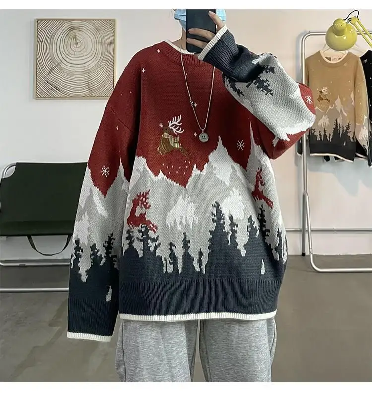 Autumn and winter men's round neck sweater Elk Christmas fashion knit sweater high street retro casual hundred loose pullover