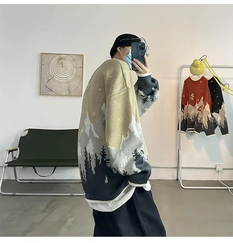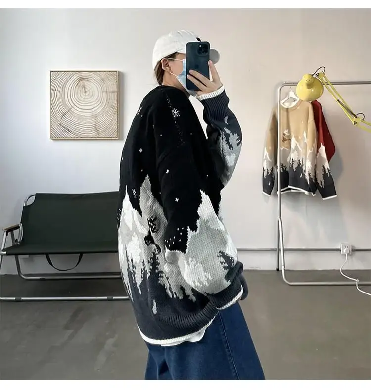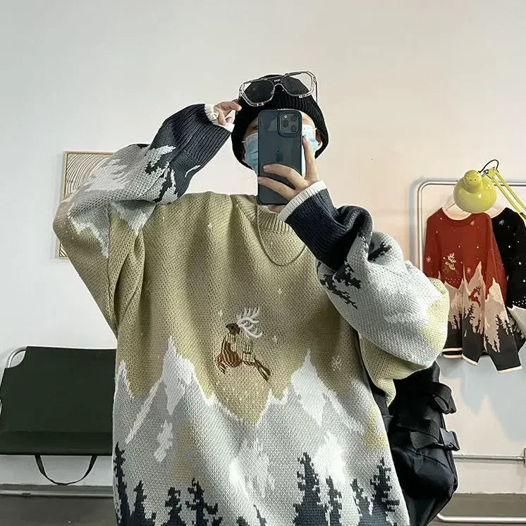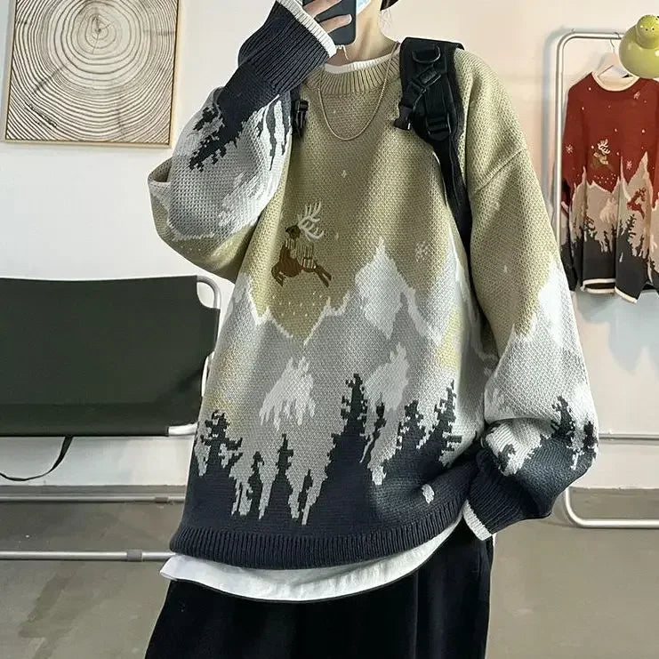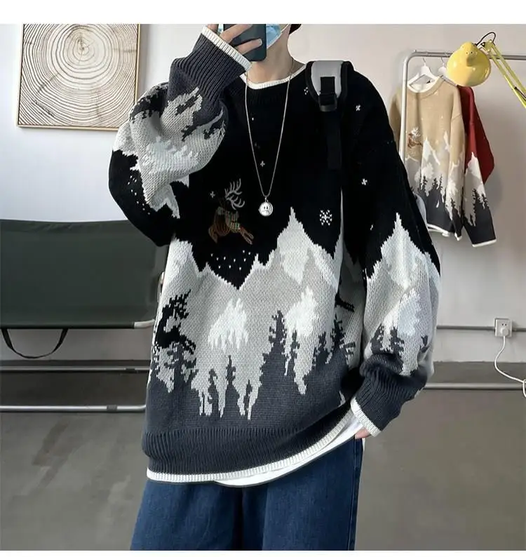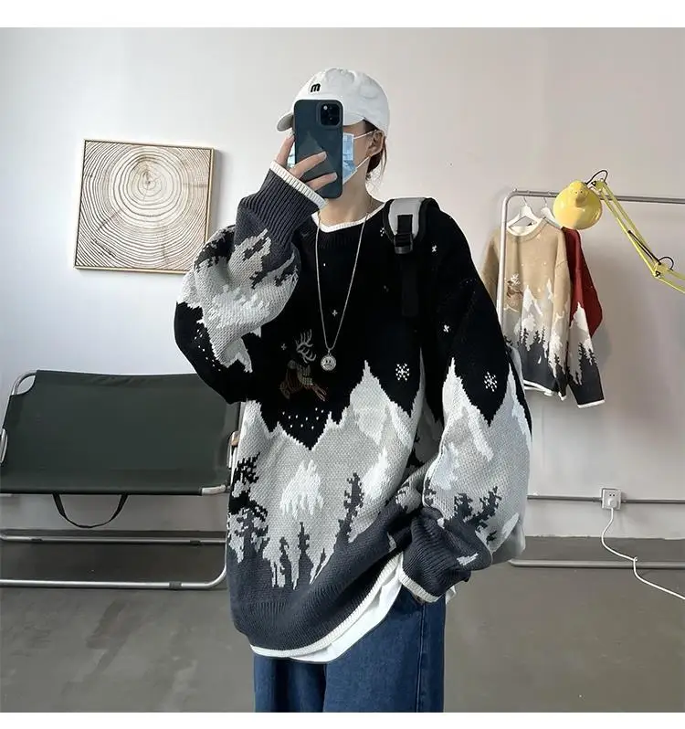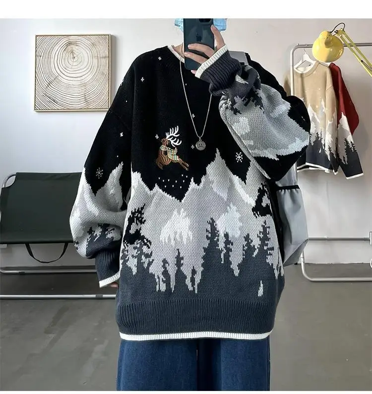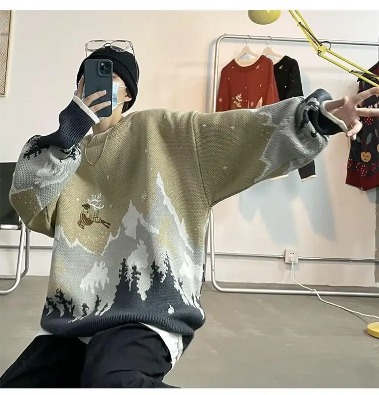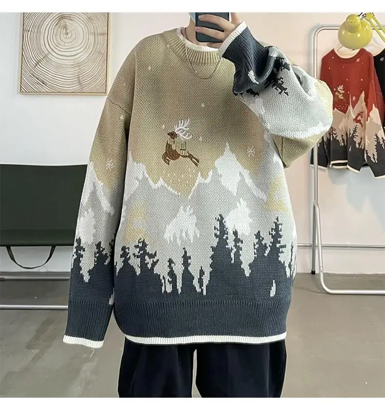 Autumn and winter men's round neck sweater Elk Christmas fashion knit sweater high street retro casual hundred loose pullover