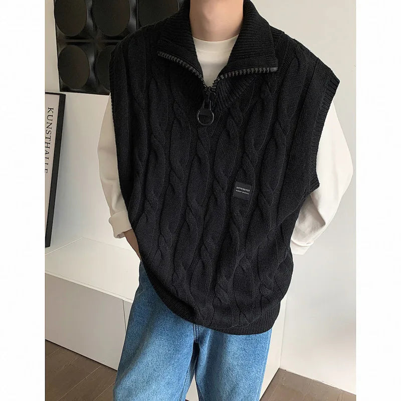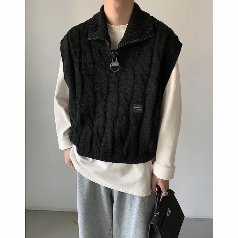 Autumn Short Sweater Vest Men Fashion Casual Lapel Knit Pullover Men Korean Loose Zipper Sleeveless Sweater Mens Jumper Clothes