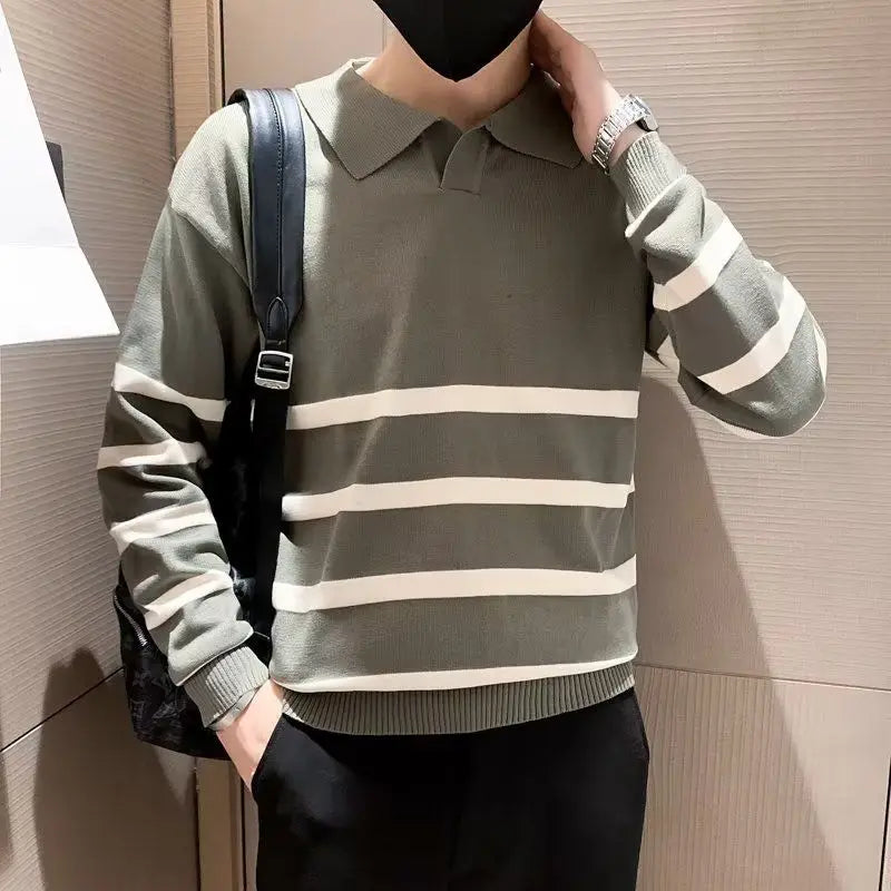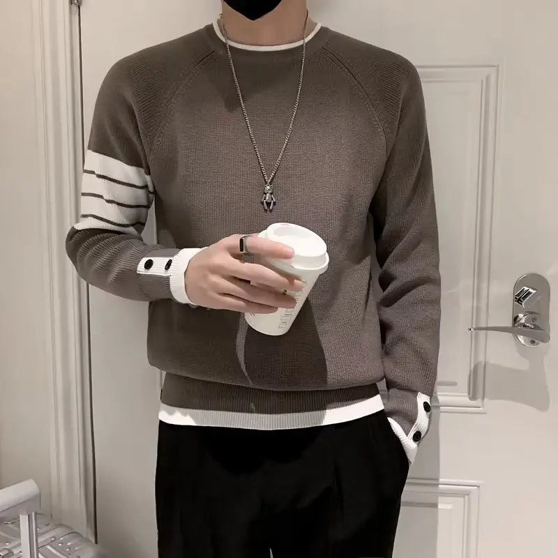 Gotmes Men's Autumn Round Neck Sweater Korean Loose Casual Oversize Knit Pullover Youth Trend Fashion Striped Sweater Men