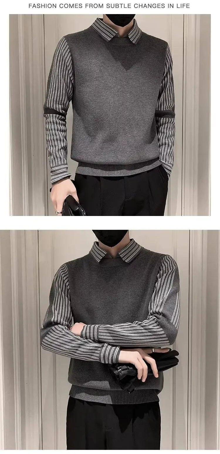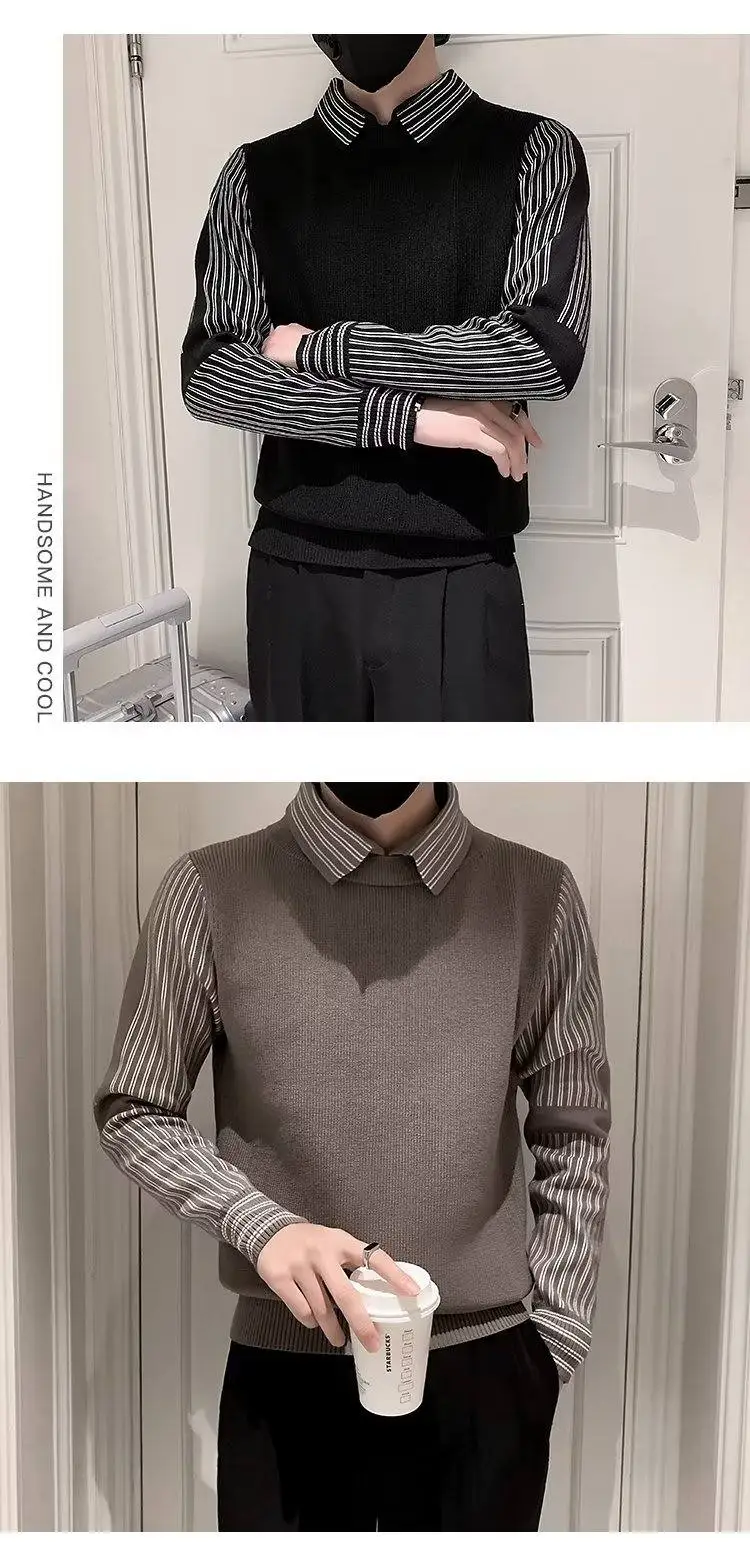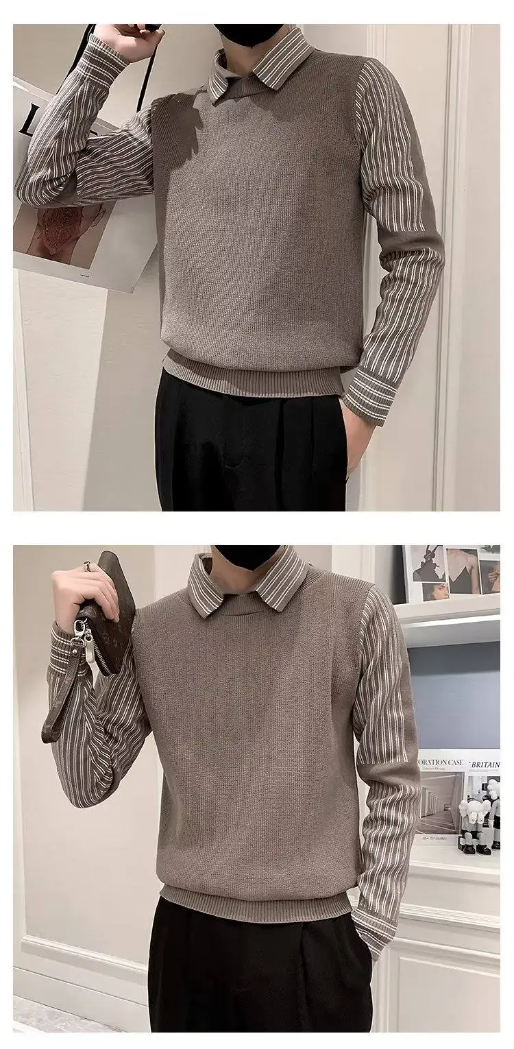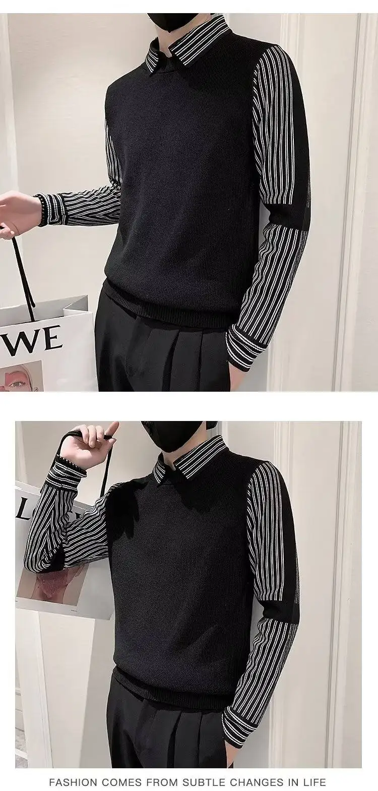 Fake 2 Pieces Shirt Collar Men's Knitted Sweater/Male Slim Fit Striped Casual Pullover/Man Long Sleeve Sweaters 3XL-M