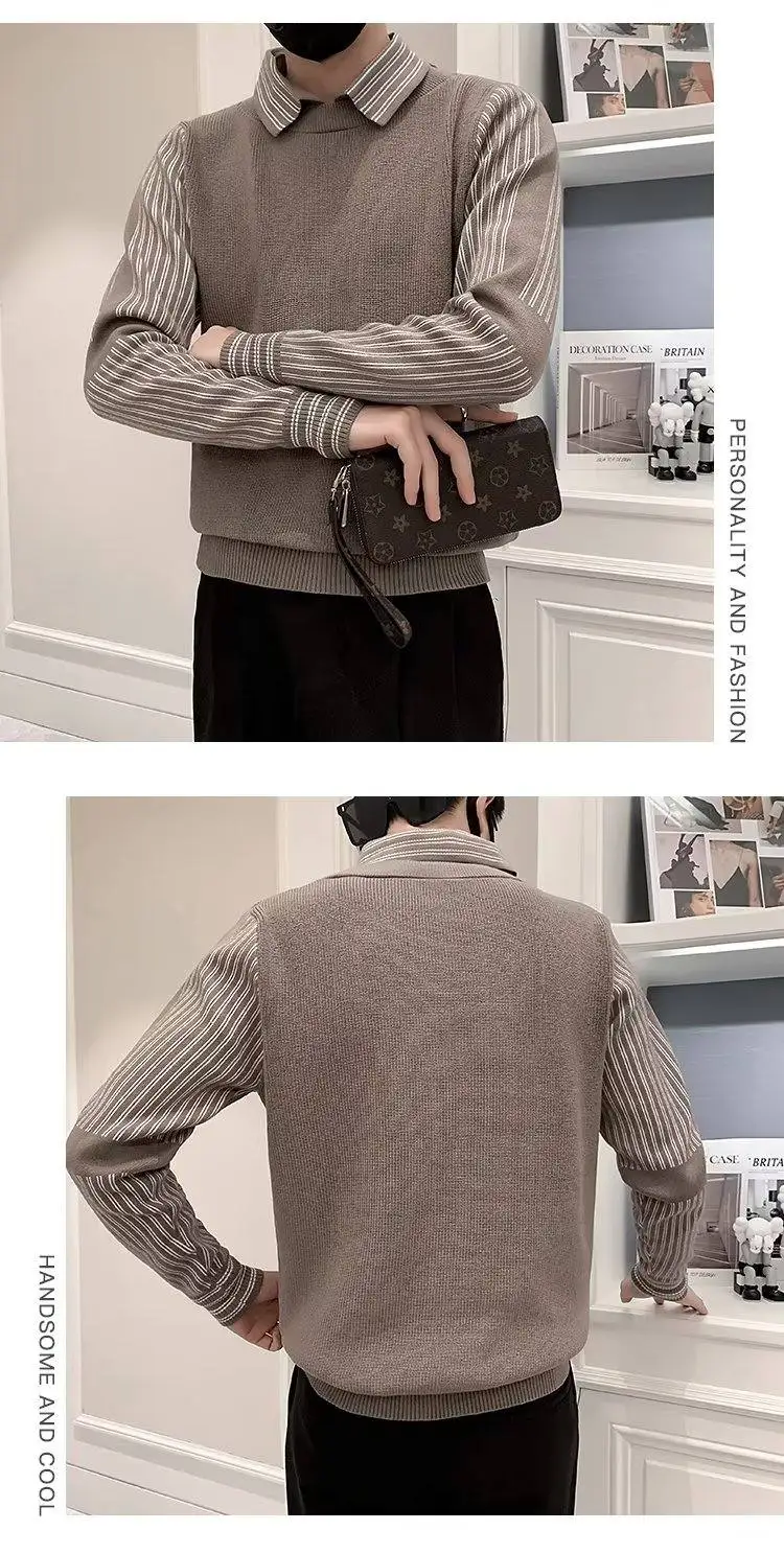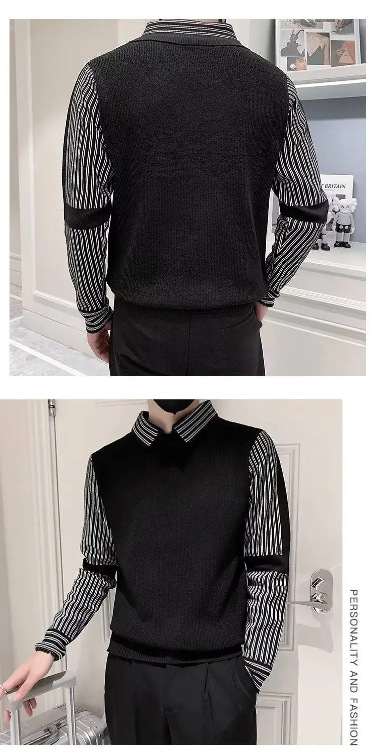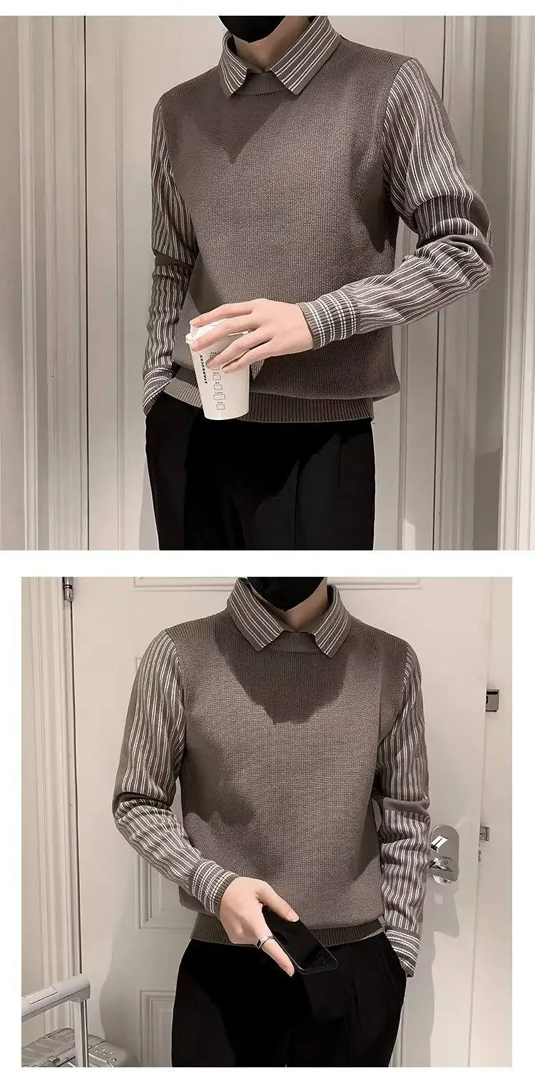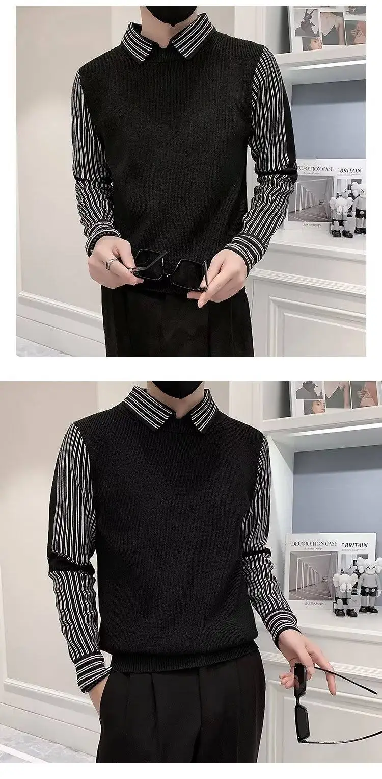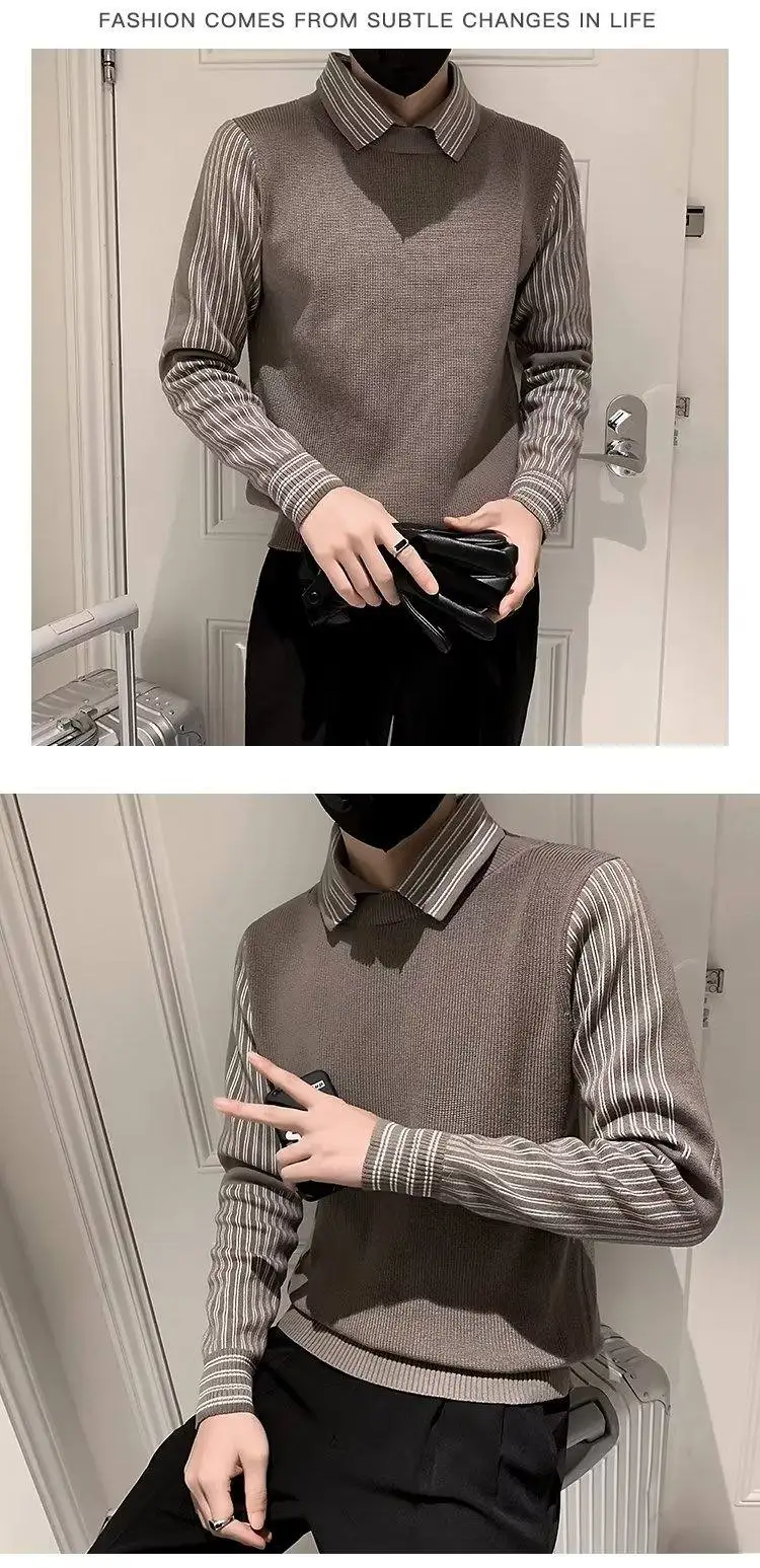Fake 2 Pieces Shirt Collar Men's Knitted Sweater/Male Slim Fit Striped Casual Pullover/Man Long Sleeve Sweaters 3XL-M