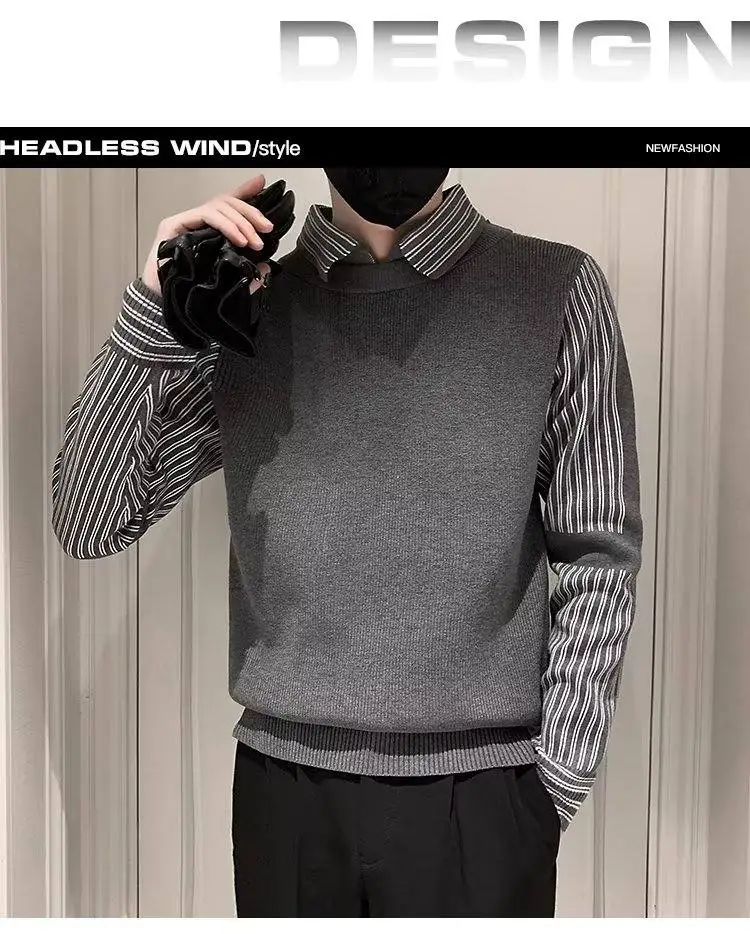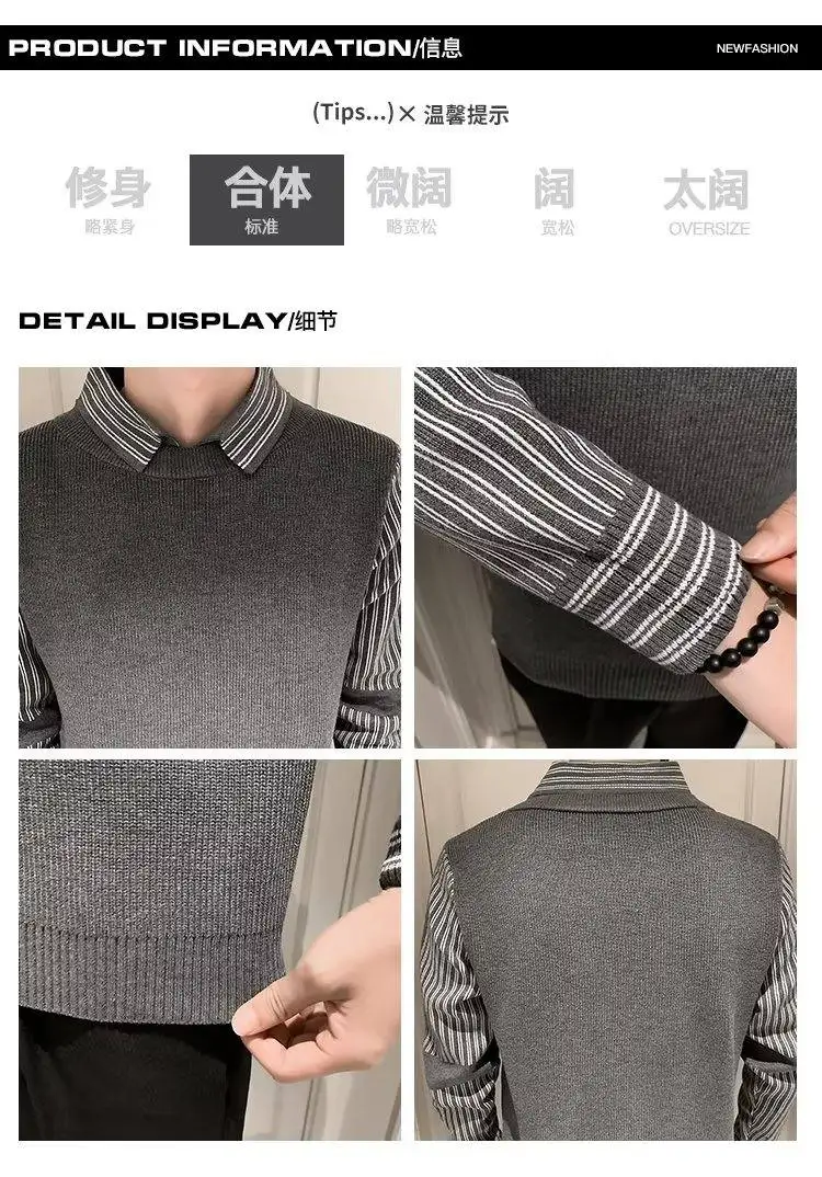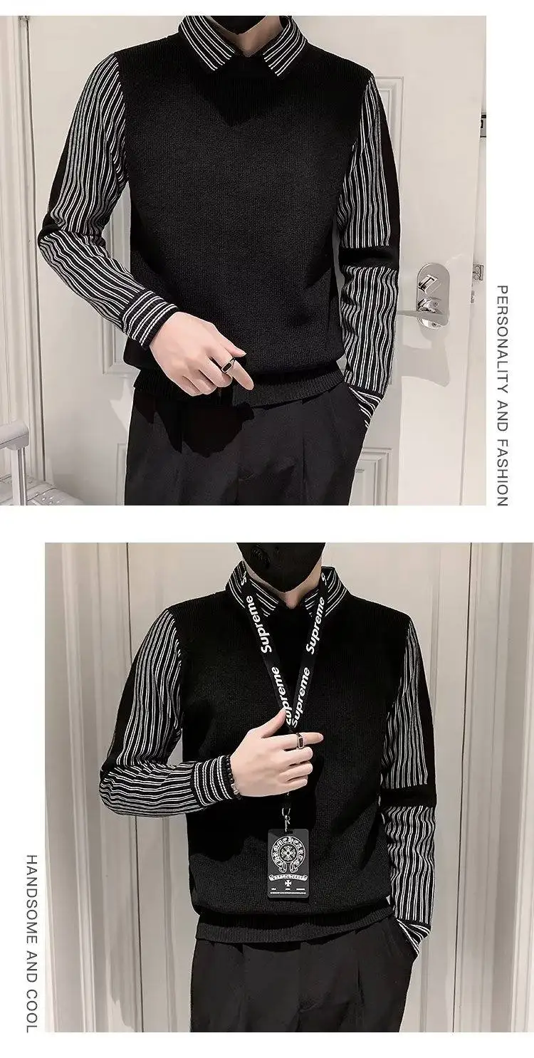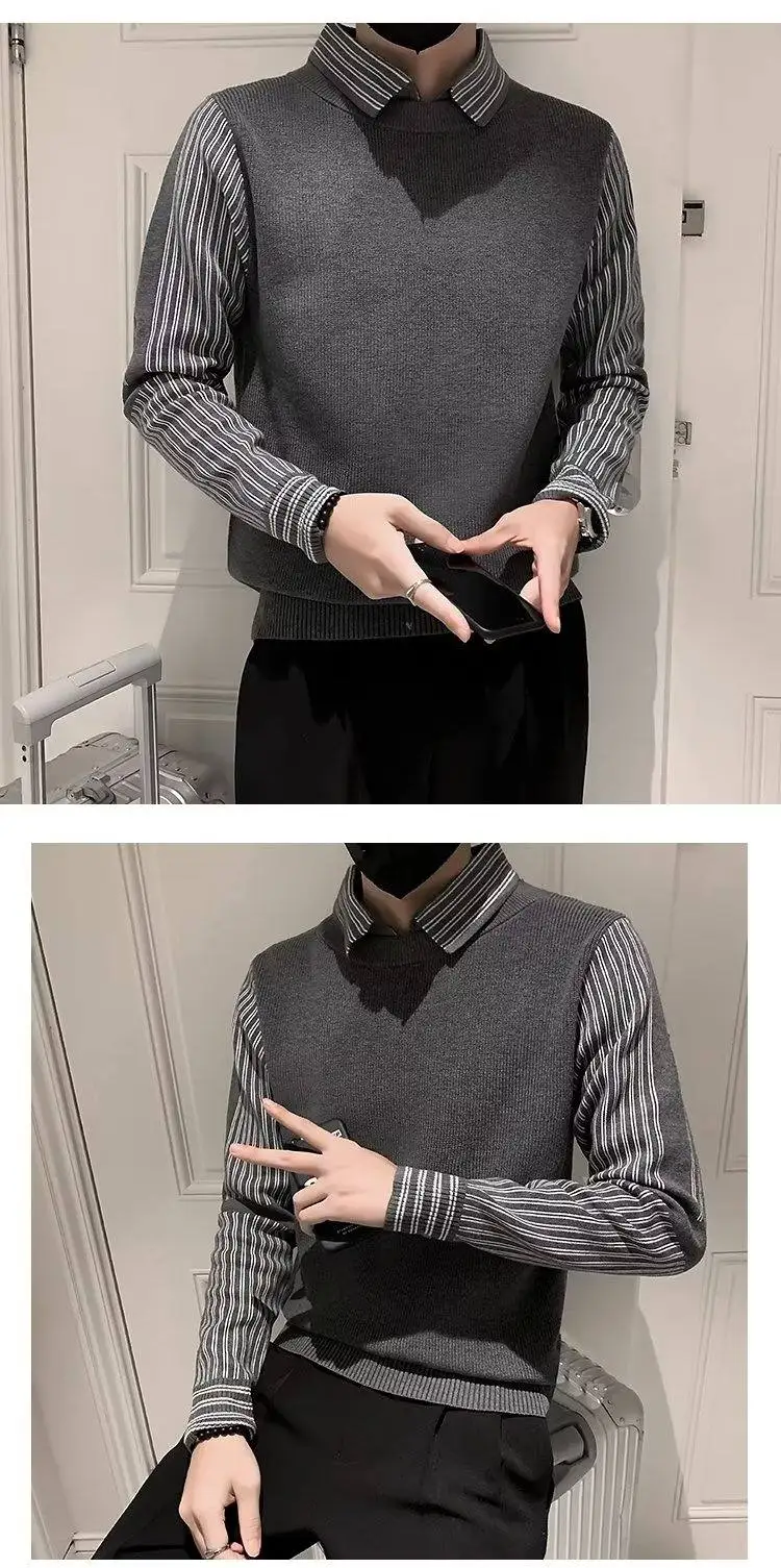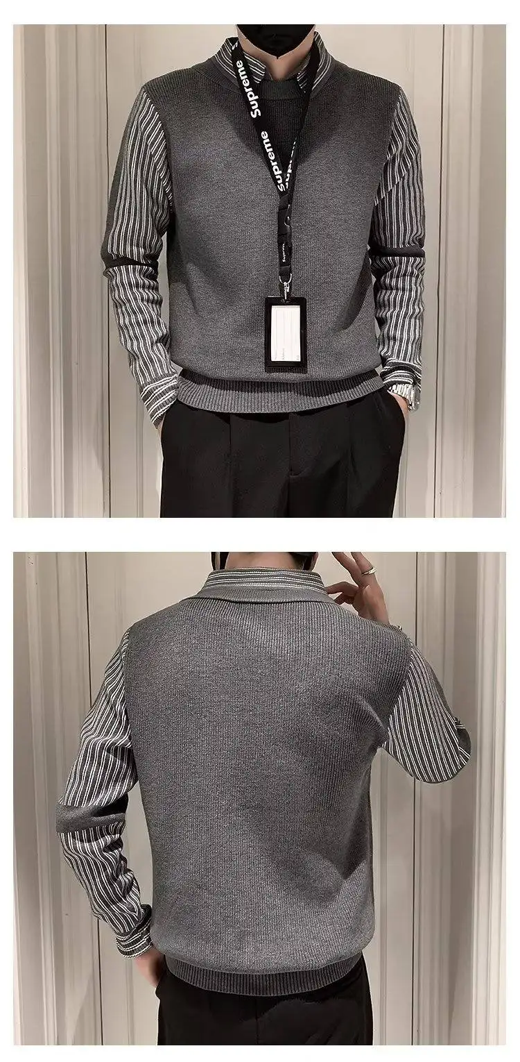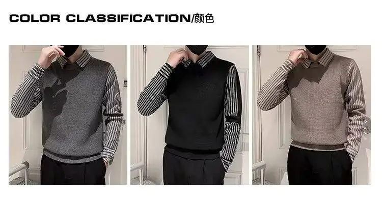 Fake 2 Pieces Shirt Collar Men's Knitted Sweater/Male Slim Fit Striped Casual Pullover/Man Long Sleeve Sweaters 3XL-M