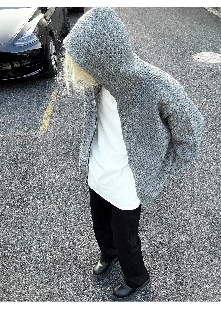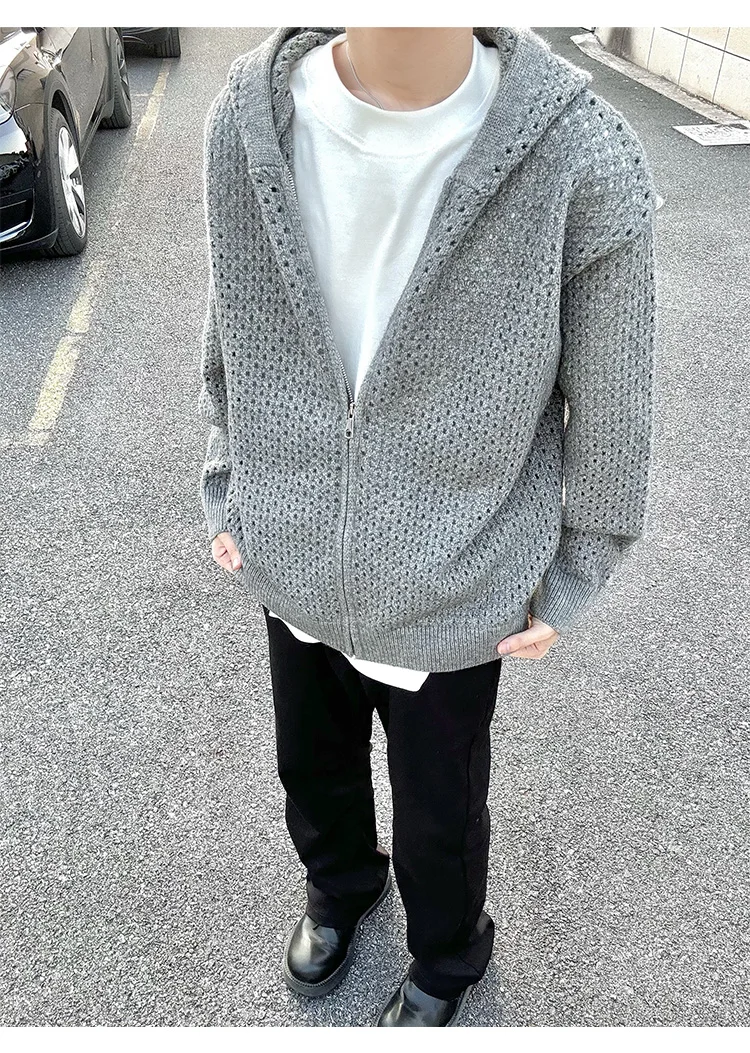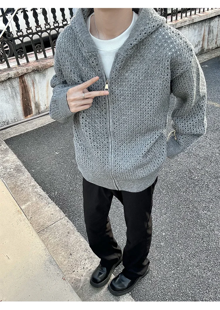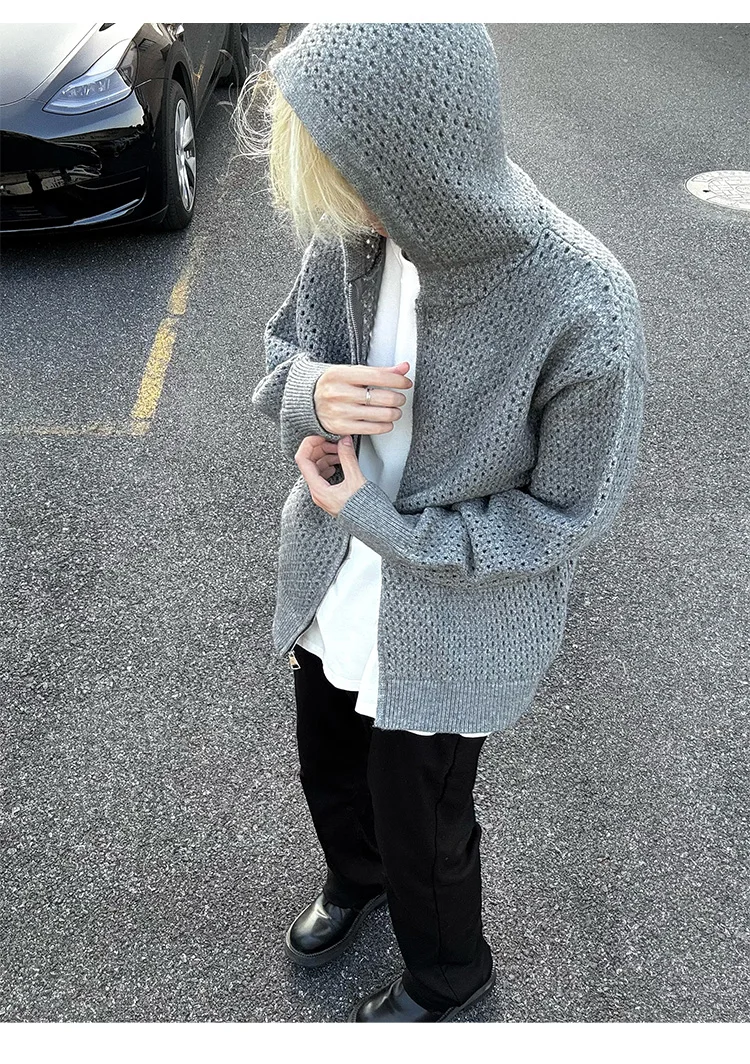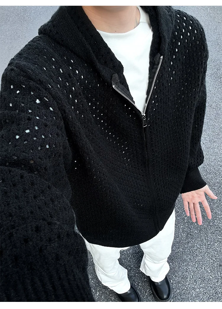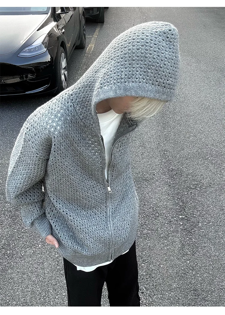 Hollow Out Knit Sweater Men Women Casual Loose Fishing Net Long Sleeve Male Tops Autumn Streetwear Hooded Pullovers